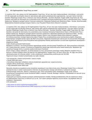 Miejski Urząd Pracy w Kielcach http://mup.kielce.pl/wydarzenie/38/xiv-ogolnopolskie-targi-pracy-za-nami XIV Ogólnopolskie Targi Pracy za nami 11 kwietnia 2011 roku odbyły się XIV Ogólnopolskie Targi Pracy. W tym roku było międzynarodowo, internetowo i uroczyście. O 9:30 rozpoczęło się oficjalne otwarcie. Jako pierwsi głos zabrali przedstawiciele organizatorów, czyli pani Halina Czerniak – Dyrektor Miejskiego Urzędu Pracy w Kielcach oraz Dariusz Michalak – Dyrektor Wydziału Tragów spółki Targi Kielce SA. Pani Dyrektor odczytała list skierowany do uczestników przez Czesławę Ostrowską Podsekretarza Stanu w Ministerstwie Pracy i Polityki Społecznej. Następnie wystąpili patroni honorowi wydarzenia: Wojewoda Świętokrzyski Bożentyna Pałka - Koruba, Wicemarszałek Województwa Świętokrzyskiego Grzegorz Świercz oraz Prezydent Miasta Kielce Wojciech Lubawski. 11 kwietnia 2011 roku odbyły się XIV Ogólnopolskie Targi Pracy. W tym roku było międzynarodowo, internetowo i uroczyście. O 9:30 rozpoczęło się oficjalne otwarcie. Jako pierwsi głos zabrali przedstawiciele organizatorów, czyli pani Halina Czerniak – Dyrektor Miejskiego Urzędu Pracy w Kielcach oraz Dariusz Michalak – Dyrektor Wydziału Tragów spółki Targi Kielce SA. Pani Dyrektor odczytała list skierowany do uczestników przez Czesławę Ostrowską Podsekretarza Stanu w Ministerstwie Pracy i Polityki Społecznej. Następnie wystąpili patroni honorowi wydarzenia: Wojewoda Świętokrzyski Bożentyna Pałka - Koruba, Wicemarszałek Województwa Świętokrzyskiego Grzegorz Świercz oraz Prezydent Miasta Kielce Wojciech Lubawski. Po krótkiej prezentacji strategii tegorocznej edycji Targów Pracy przedstawionej przez koordynatora projektu Zbigniewa Brzezińskiego nastąpiła bardzo ważna dla MUP uroczystość. Wojewoda Świętokrzyski odznaczyła 32 pracowników Miejskiego Urzędu Pracy przyznanymi przez Prezydenta Rzeczypospolitej Polskiej odznaczeniami za wzorcowe wypełnianie obowiązków i długoletnią służbę. Część oficjalną prowadził Rafał Szwed. Następnie uczciliśmy I rok funkcjonowania regionalnego portalu rekrutacyjnego ProjektPraca.PL. Była prezentacja statystyki, tort z jedną świeczką i prezent. W prezencie ProjektPraca dostał logo stworzone przez Pawła Kowalczyka. Niebawem też wystartuje fanpage strony na portalu społecznościowym Facebook. W tym miejscu należy nadmienić, że portal powstał na mocy porozmienia zawartego między Miejskim Urzędem Pracy w Kielcach a Polskim Radiem Kielce SA podczas XIII Ogólnopolskich Targów Pracy 29 marca 2010 roku. W ciągu roku portal odnotował prawie 16 milionów odsłon. Liczba unikatowych użytkowników przekroczyła zaś 343 000. Tegoroczne targi w liczbach prezentowały się nader okazale: ● ● ● ● ● 92 wystawców z dwóch kontynentów i sześciu krajów Ponad 2000 ofert pracy Konsultacje dotyczące zakładania własnej działalności gospodarczej i wsparcia biznesu Bogata oferta szkoleniowa i edukacyjna Targi odwiedziło około 5000 osób Warsztaty doradcze prowadzone przez doradców zawodowych oraz lidera klubu pracy Miejskiego Urzędu Pracy w Kielcach poświęcone były w całości wykorzystaniu Internetu do poszukiwania nowego zatrudnienia, budowania swojego profesjonalnego wizerunku, dbania o reputację w sieci. Prócz warsztatów osoby zwiedzające mogły wziąć udział w prezentacjach prowadzonych przez Doradców EURES z Holandii, Finlandii, Norwegii i Niemiec. Przedstawiali oni warunki życia i pracy w tych krajach. Tradycyjnie już impreza cieszyła się dużym zainteresowaniem mediów. Poniżej przedstawiamy linki do wybranych relacji. XV Ogólnopolskie Targi Pracy w Kielcach już za rok. Tym razem spotykać będziemy się we wtorek. Szczegółowa data już niebawem. Zapraszamy! Linki powiązane: ● ● http://www.itv.kielce.eu/pl/artykuly/pokaz/2052 http://www.ntv-kielce.pl/aktualnosci/3992-targi-pracy-w-kielcach-wideo.html