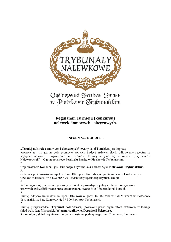 Regulamin Turnieju (konkursu) nalewek domowych i akcyzowych. INFORMACJE OGÓLNE 1. „Turniej nalewek domowych i akcyzowych” zwany dalej Turniejem jest imprezą promocyjną mającą na celu promocję polskich tradycji nalewkarskich, odkrywanie receptur na najlepsze nalewki i nagradzanie ich twórców. Turniej odbywa się w ramach „Trybunałów Nalewkowych” – Ogólnopolskiego Festiwalu Smaku w Piotrkowie Trybunalskim. 2. Organizatorem Konkursu jest Fundacja Trybunalska z siedzibą w Piotrkowie Trybunalskim. 3. Organizacją Konkursu kierują Hieronim Błażejak i Jan Babczyszyn. Sekretarzem Konkursu jest Czesław Maszczyk: +48 602 768 476 ; [email protected]; 4. W Turnieju mogą uczestniczyć osoby pełnoletnie posiadające pełną zdolność do czynności prawnych, zakwalifikowane przez organizatora, zwane dalej Uczestnikami Turnieju. 5. Turniej odbywa się w dniu 16 lipca 2016 roku w godz. 14:00-17:00 w Sali Muzeum w Piotrkowie Trybunalskim; Plac Zamkowy 4; 97-300 Piotrków Trybunalski. 7. Turniej przeprowadza „Trybunał nad Strawą” powołany przez organizatora festiwalu, w którego skład wchodzą: Marszałek, Wicemarszałkowie, Deputaci i Sekretarz. Szczegółowy skład Deputatów Trybunału zostanie podany najpóźniej 7 dni przed Turniejem. ZASADY UCZESTNICTWA 8. Uczestnicy zgłaszający się do Turnieju zobowiązani są wypełnić i podpisać kartę zgłoszenia. W przypadku zgłaszania większej ilości nalewek, do każdej z nich należy dołączyć osobną kartę zgłoszenia. 9. Uczestnicy Turnieju podpisując zgłoszenie do Turnieju akceptują jego regulamin oraz zobowiązują się uszanować wszelkie postanowienia „Trybunału nad Strawą”. 10. Do Turnieju zgłaszać można wyłącznie te nalewki, które Rzeczypospolitej Polskiej zostały wytworzone na terenie 11. Nalewki oceniane będą w dwóch kategoriach: a. Nalewki akcyzowe Nalewki produkowane i sprzedawane na podstawie koncesji. b. Nalewki domowe Nalewki tworzone w warunkach domowych i podawane wyłącznie lokalach gastronomicznych i agroturystycznych, a także prezentowane na konkursach, jarmarkach oraz targach produktów regionalnych i lokalnych. Wszelkie wątpliwości w zakresie kwalifikacji nalewek do konkursu oraz poszczególnych kategorii rozstrzyga sekretarz Turnieju.. 12. a. Uczestnicy Konkursu w poszczególnych kategoriach ubiegają się o nagrody: Złoty Gąsior Srebrny Gąsior Brązowy Gąsior b. Organizatorzy przewidują również możliwość przyznania dodatkowych wyróżnień oraz nagród pozaregulaminowych. 13 Uczestnicy zgłaszający nalewki do Turnieju zobowiązani są dostarczyć dwie próbki tej samej nalewki: jedna o pojemności nie mniejszej niż 500 ml, druga nie mniej niż 200 ml. Ilość nalewek zgłaszanych do Turnieju przez jednego Uczestnika jest dowolna. 14 Zgłoszenia przyjmowane są: a. do 15 lipca 2016 korespondencyjnie – przesyłki pocztowe lub kurierskie na adres siedziby organizatora: Fundacja Trybunalska; Ul. Karolinowska 10; 97-300 Piotrków Trybunalski b. w dniu 16 lipca nalewki przyjmowane są w godz. 10.00 – 13.00 w gmachu Muzeum w Piotrkowie: Plac Zamkowy 4; 97-300 Piotrków Trybunalski. SPOSÓB WYŁANIANIA LAUREATÓW 15 Obecni na posiedzeniu Deputaci „Trybunału nad Strawą” dokonają degustacji zgłoszonych do Turnieju nalewek na warunkach zapewniających anonimowość poszczególnym uczestnikom Turnieju: Deputaci Trybunału poznają jedynie nr ocenianej nalewki Deputaci Trybunału przed zakończeniem posiedzenia nie poznają nazwisk uczestników turnieju; W fazie pierwszej posiedzenia Deputaci Trybunału dokonają punktowej oceny wszystkich nalewek stosując specjalne karty oceny i w ten sposób wybiorą nalewki, które oceniane będą w finale. Ocenie podlegać będą: klarowność nalewki (1-3 pkt.); zapach nalewki (1-4 pkt.) i smak nalewki( 1-7 pkt). W fazie finałowej Deputaci Trybunału przyznają poszczególnym nalewkom odpowiednio swoje punkty, które powinny być podstawą przyznania nagród i wyróżnień. W razie wystąpienia sporów i różnic w ocenie poszczególnych nalewek pomiędzy Deputatami Trybunału, Marszałek i Wicemarszałkowie Trybunału zainicjować mogą debatę, a prowadzący obrady Marszałek lub Wicemarszałek może zarządzić ponowne głosowanie, którego wynik stanowił będzie ostateczna podstawę przyznania nagród i wyróżnień . Nad prawidłowym przebiegiem posiedzenia Trybunału nad Strawą czuwać będzie jego Sekretarz. WYNIKI 16 a. Wyniki przekazane zostaną w ramach podsumowania i ogłoszenia wyników Turnieju o nagrodę: „Złotego, srebrnego i brązowego gąsiora”. b. Ogłoszenia dokona Marszałek lub jeden z Wicemarszałków Trybunału nad Strawą. c. Miejscem ogłoszenia wyników oraz wręczenia wyróżnień będzie scena festiwalu na Rynku w Piotrkowie Trybunalskim. Godzina ogłoszenia wyników zostanie podana najpóźniej na 7 dni przed Turniejem. d. Nagrody nie odebrane przez laureatów w dniu ich ogłoszenia zostaną przekazane im inną drogą (po uprzedniej konsultacji z nagrodzonymi). Regulamin niniejszy wchodzi w życie z dniem jego ogłoszenia. Podpisali: Hieronim Błażejak Jan Babczyszyn Czesław Maszczyk Zgłoszenie nalewki do Turnieju o nagrodę: „Złotego/ srebrnego/brązowego gąsiora” KATEGORIA: NALEWKI AKCYZOWE Nazwa nalewki oraz Nazwa własna (jeśli dotyczy) Nazwa lub imię i nazwisko producenta (uczestnika Turnieju), Adres producenta Imię i nazwisko osoby odpowiedzialnej za produkcję i przygotowanie nalewki Imię i nazwisko osoby zgłaszającej – pełnomocnika producenta NIP producenta – dla nalewek akcyzowych Kontaktowy telefon komórkowy Adres e-mail Główne składniki , opis i inne ważne informacje itp. Dotychczasowe wyróżnienia i nagrody dla zgłaszanej nalewki. Oświadczam, że zgłaszana do konkursu nalewka jest produktem wytworzonym na bazie wyrobów alkoholowych, nabytych w ramach koncesji na produkcję w Polsce. Nalewka ta spełnia warunki określone w Regulaminie. Nap