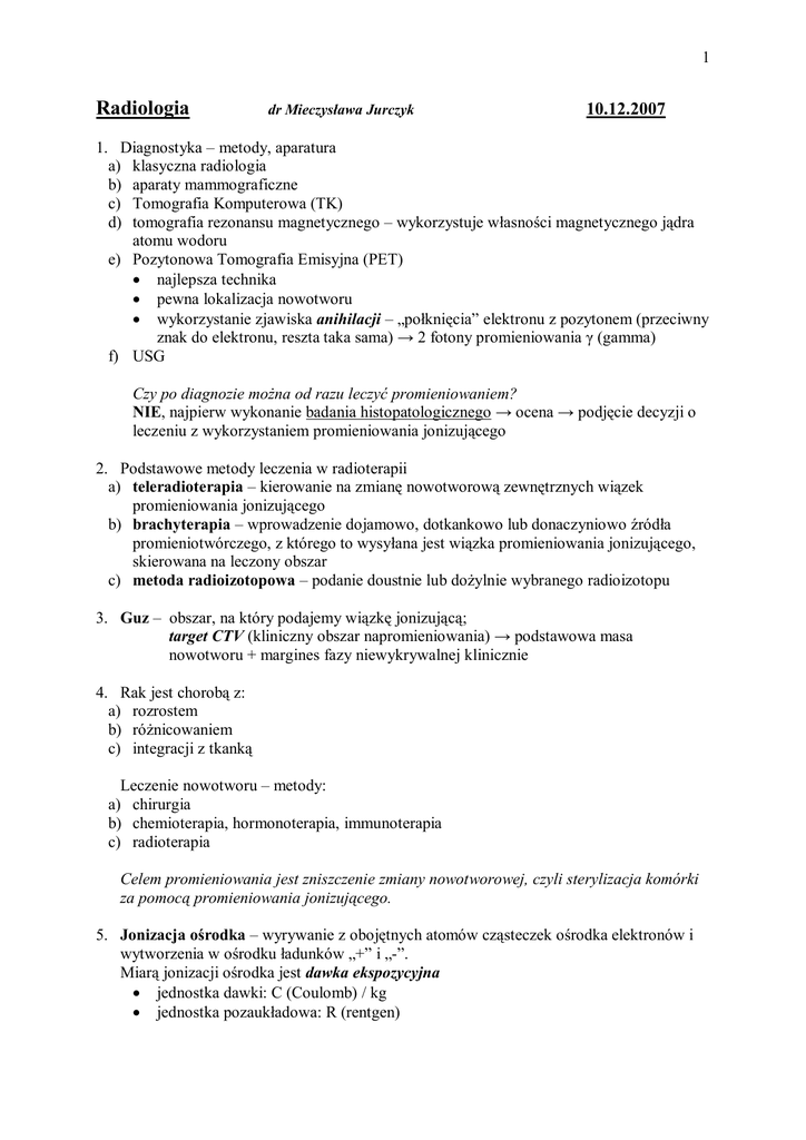 1 Radiologia dr Mieczysława Jurczyk 10.12.2007 1. Diagnostyka – metody, aparatura a) klasyczna radiologia b) aparaty mammograficzne c) Tomografia Komputerowa (TK) d) tomografia rezonansu magnetycznego – wykorzystuje własności magnetycznego jądra atomu wodoru e) Pozytonowa Tomografia Emisyjna (PET) najlepsza technika pewna lokalizacja nowotworu wykorzystanie zjawiska anihilacji – „połknięcia” elektronu z pozytonem (przeciwny znak do elektronu, reszta taka sama) → 2 fotony promieniowania γ (gamma) f) USG Czy po diagnozie można od razu leczyć promieniowaniem? NIE, najpierw wykonanie badania histopatologicznego → ocena → podjęcie decyzji o leczeniu z wykorzystaniem promieniowania jonizującego 2. Podstawowe metody leczenia w radioterapii a) teleradioterapia – kierowanie na zmianę nowotworową zewnętrznych wiązek promieniowania jonizującego b) brachyterapia – wprowadzenie dojamowo, dotkankowo lub donaczyniowo źródła promieniotwórczego, z którego to wysyłana jest wiązka promieniowania jonizującego, skierowana na leczony obszar c) metoda radioizotopowa – podanie doustnie lub dożylnie wybranego radioizotopu 3. Guz – obszar, na który podajemy wiązkę jonizującą; target CTV (kliniczny obszar napromieniowania) → podstawowa masa nowotworu + margines fazy niewykrywalnej klinicznie 4. Rak jest chorobą z: a) rozrostem b) różnicowaniem c) integracji z tkanką Leczenie nowotworu – metody: a) chirurgia b) chemioterapia, hormonoterapia, immunoterapia c) radioterapia Celem promieniowania jest zniszczenie zmiany nowotworowej, czyli sterylizacja komórki za pomocą promieniowania jonizującego. 5. Jonizacja ośrodka – wyrywanie z obojętnych atomów cząsteczek ośrodka elektronów i wytworzenia w ośrodku ładunków „+” i „-”. Miarą jonizacji ośrodka jest dawka ekspozycyjna jednostka dawki: C (Coulomb) / kg jednostka pozaukładowa: R (rentgen) 2 6. Jonizacja wody – tzw. proces radiolizy wody I etap – procesy fizyczne – wytworzenie ładunków „+” i „-”, które reagują z cząsteczką wody II etap – procesy chemiczne – skutkiem są wolne rodniki (stanowią fragmenty cząsteczek) i elektrony uwodnione (niesparowane) III etap – procesy biochemiczne – wolne rodniki włączają się do komórki groźny: wolny rodnik tlenu - oszukuje komórkę, że jest cząsteczką tlenu doprowadzenie do tworów, zmian nowotworowych 7. Właściwości promieniowania jonizującego a) grupy, rodzaje falowe (elektromagnetyczne) o rentgena X o rentgena γ cząstkowe (korpuskularne) – tworzone przez określone cząstki atomu: protony, elektrony lub neutrony o α – promieniowanie utworzone przez ciężkie cząstki – zjonizowana forma jądra atomu helu (2 protony i 2 neutrony) o β „-” – elektrony „+” – pozytony (bliźniaki elektronów, ale z przeciwnym znakiem „+”) o neutronowe Działanie lampy rentgenowskiej: wyrzucenie elektronów z I elektrody z odpowiednią prędkością po właściwym wysokim podgrzaniu, jest hamowane na II elektrodzie, od której odbijają się promienie X Aparaty (przykłady): 50 kV – stosowane np. w mammografii (max do 40 kV) 150 kV – stosowane np. w diagnostyce kręgosłupa 300 kV b) przenikliwość, zasięg promieniowania najgroźniejsze: γ i X → promieniowanie twarde – zastosowanie osłon z ciężkich materiałów, czyli z wysoką liczbą atomową w układzie Mendelejewa pod symbolem (liczbą protonów): ołów, zubożały uran, beton, żelbeton mniej groźne: neutronowe → pochłania je woda i związki o dużej zawartości wodoru krótsze: β → pochłaniane w powietrzu do 20 m – osłanianie z materiałów lekkich z niską liczbą atomową, np. duraluminium, szkło, plastik, guma; w materiałach ciężkich nastąpiłoby wtórne promieniowanie X najsłabsze: α → pochłaniane w powietrzu do 20 cm, zatrzymane przez kartkę papieru, folię, np. rękawiczki c) jonizacja ośrodka α – jonizuje najsilniej, bo w kontakcie bezpośrednim β – jonizuje słabiej niż α; może ulec rozproszeniu w ośrodku (uginanie się pod innym kątem i sięganie dalej) γ i X – nie jonizują bezpośrednio, ale jonizują pośrednio (poprzez inne zjawiska); wywołuje niebezpieczeństwo fotoelektronizacji Comptona, tworzenia się par (elektron + pozyton) 3 d) widmo energetyczne określonego promieniowania ciągłe – w przedziale od 0 do energii maksymalnej liczba promieniowania jest różna, ale cały czas istnieje (na początku jest jej mniej, wzrasta do energii średniej i potem spada do 0) liniowe – promieniowanie istnieje tylko przy określonych wartościach energii (tzw. prążki) o różnej mocy (wysokość prążka) 8. Zastosowanie radu a) choroby skóry b) choroby neurologiczne c) Rad (Ra) to: β = 90% γ = 10% nie może być α ze względu na szkodliwe działanie w kontakcie bezpośrednim! 9. Dawka promieniowania – porcja promieniowania podana pacjentowi w terapii; określa dawkę pochłoniętą, czyli ilość energii pochłoniętej przez jednostkę masy (ośrodka). Jednostka: 1 grej (Gy) [1 Gy = 1 J / 1 kg = 100 radów]; [1 rad = 0,01 Gy] 10. Teleradioterapia – techniki leczenia: a) ortovoltarzowa, in. stosowanie lamp rentgenowskich – dopuszczalna wyłącznie w terapii skórnej (100% dawki na skórę) i paliatywnej; NIE WOLNO stosować w terapii głębokiej b) aparaty kobaltowe (Cobalt-60) – dawka sięga parę mm pod skórą; 1,02 Megaelektronovolt 4 c) akceleratory liniowe (przyspieszacze liniowe) – w dziale elektronowym znajduje się sekcja przyspieszająca, później wiązka zostaje „okrojona” do potrzebnej wiązki na obszar nowotworu; 60 Megaelektronovolt 11. Brachyterapia – mikroselektrony a) HDR – leczenie z podawaniem wysokich dawek promieniowania na frakcje; 3 – 11 Gy / frakcja; np. prostata – 2 frakcje po 10 lub 11 Gy w odstępie 7 dni źródło: iryd 192 b) LDR – niskie dawki promieniowania dawki są podawane w małych ilościach co jakiś czas (np. w ciąg