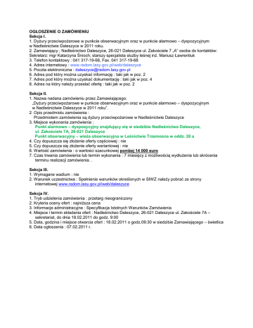 OGŁOSZENIE O ZAMÓWIENIU Sekcja I. 1. Dyżury przeciwpożarowe w punkcie obserwacyjnym oraz w punkcie alarmowo – dyspozycyjnym w Nadleśnictwie Daleszyce w 2011 roku. 2. Zamawiający ; Nadleśnictwo Daleszyce, 26-021 Daleszyce ul. Zakościele 7 „A” osoba do kontaktów: Sekretarz: mgr Katarzyna Śnioch; starszy specjalista służby leśnej inż. Mariusz Ławrentiuk 3. Telefon kontaktowy : 041 317-19-68, Fax. 041 317-19-68 4. Adres internetowy : www.radom.lasy.gov.pl/web/daleszyce 5. Poczta elektroniczna : [email protected] 6. Adres pod który można uzyskać informację : taki jak w poz. 2 7. Adres pod który można uzyskać dokumentację : taki jak w poz. 4 8. Adres na który należy przesłać ofertę : taki jak w poz. 2 Sekcja II. 1. Nazwa nadana zamówieniu przez Zamawiającego: „Dyżury przeciwpożarowe w punkcie obserwacyjnym oraz w punkcie alarmowo – dyspozycyjnym w Nadleśnictwie Daleszyce w 2011 roku”. 2. Opis przedmiotu zamówienia : Przedmiotem zamówienia są dyżury przeciwpożarowe w Nadleśnictwie Daleszyce 3. Miejsce wykonania zamówienia : Punkt alarmowo – dyspozycyjny znajdujący się w siedzibie Nadleśnictwa Daleszyce, ul. Zakościele 7A, 26-021 Daleszyce Punkt obserwacyjny – wieża obserwacyjna w Leśnictwie Trzemosna w oddz. 28 a 4. Czy dopuszcza się złożenie oferty częściowej : nie 5. Czy dopuszcza się złożenie oferty wariantowej : nie 6. Wartość zamówienia : o wartości szacunkowej poniżej 14 000 euro 7. Czas trwania zamówienia lub termin wykonania : 7 miesięcy z możliwością wydłużenia lub skrócenia terminu realizacji zamówienia. . Sekcja III. 1. Wymagane wadium : nie 2. Warunek uczestnictwa : Spełnienie warunków określonych w SIWZ należy pobrać ze strony internetowej www.radom.lasy.gov.pl/web/daleszyce Sekcja IV. 1. Tryb udzielenia zamówienia : przetarg nieograniczony 2. Kryteria oceny ofert : najniższa cena 3. Informacje administracyjne : Specyfikacja Istotnych Warunków Zamówienia 4. Miejsce i termin składania ofert : Nadleśnictwo Daleszyce, 26-021 Daleszyce ul. Zakościele 7A – sekretariat, do dnia 18.02.2011 do godz. 9:00 5. Data, godzina i miejsce otwarcia ofert : 18.02.2011 o godz.09:30 w siedzibie Zamawiającego – świetlica 6. Data ogłoszenia : 07.02.2011 r.