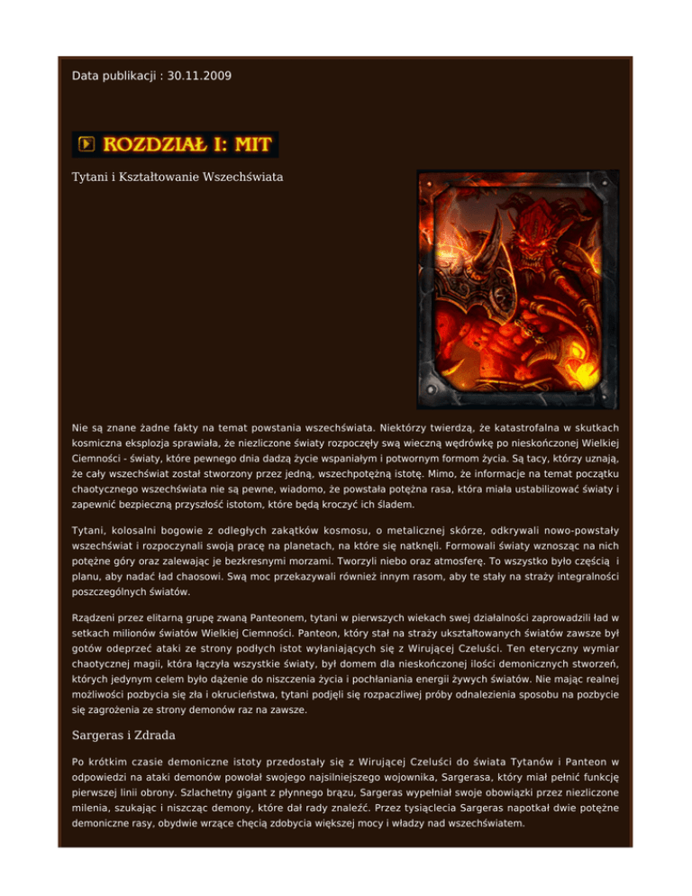Data publikacji : 30.11.2009 Tytani i Kształtowanie Wszechświata Nie są znane żadne fakty na temat powstania wszechświata. Niektórzy twierdzą, że katastrofalna w skutkach kosmiczna eksplozja sprawiała, że niezliczone światy rozpoczęły swą wieczną wędrówkę po nieskończonej Wielkiej Ciemności - światy, które pewnego dnia dadzą życie wspaniałym i potwornym formom życia. Są tacy, którzy uznają, że cały wszechświat został stworzony przez jedną, wszechpotężną istotę. Mimo, że informacje na temat początku chaotycznego wszechświata nie są pewne, wiadomo, że powstała potężna rasa, która miała ustabilizować światy i zapewnić bezpieczną przyszłość istotom, które będą kroczyć ich śladem. Tytani, kolosalni bogowie z odległych zakątków kosmosu, o metalicznej skórze, odkrywali nowo-powstały wszechświat i rozpoczynali swoją pracę na planetach, na które się natknęli. Formowali światy wznosząc na nich potężne góry oraz zalewając je bezkresnymi morzami. Tworzyli niebo oraz atmosferę. To wszystko było częścią i planu, aby nadać ład chaosowi. Swą moc przekazywali również innym rasom, aby te stały na straży integralności poszczególnych światów. Rządzeni przez elitarną grupę zwaną Panteonem, tytani w pierwszych wiekach swej działalności zaprowadzili ład w setkach milionów światów Wielkiej Ciemności. Panteon, który stał na straży ukształtowanych światów zawsze był gotów odeprzeć ataki ze strony podłych istot wyłaniających się z Wirującej Czeluści. Ten eteryczny wymiar chaotycznej magii, która łączyła wszystkie światy, był domem dla nieskończonej ilości demonicznych stworzeń, których jedynym celem było dążenie do niszczenia życia i pochłaniania energii żywych światów. Nie mając realnej możliwości pozbycia się zła i okrucieństwa, tytani podjęli się rozpaczliwej próby odnalezienia sposobu na pozbycie się zagrożenia ze strony demonów raz na zawsze. Sargeras i Zdrada Po krótkim czasie demoniczne istoty przedostały się z Wirującej Czeluści do świata Tytanów i Panteon w odpowiedzi na ataki demonów powołał swojego najsilniejszego wojownika, Sargerasa, który miał pełnić funkcję pierwszej linii obrony. Szlachetny gigant z płynnego brązu, Sargeras wypełniał swoje obowiązki przez niezliczone milenia, szukając i niszcząc demony, które dał rady znaleźć. Przez tysiąclecia Sargeras napotkał dwie potężne demoniczne rasy, obydwie wrzące chęcią zdobycia większej mocy i władzy nad wszechświatem. Eredarzy, podstępna rasa diabelskich czarowników, używała magii warlocków by napadać i zniewalać liczne światy. Pierwotne rasy zostały podbite przez Eredarów i przy użyciu złowrogiej magii zamienione w demony. Mimo iż prawie nieskończone moce Sargerasa były więcej niż wystarczające na pokonanie Eredarów, ich zepsucie i wszechobecne zło mocno go zakłopotały. Nie mogąc pojąc tak wielkiej deprawacji, potężny Tytan powoli popadał w ciężką depresję. Mimo rosnącego zaniepokojenie, Sargeras uwolnił wszechświat od warlocków zamykając ich w rogu Wirującej Czeluści. W czasie kiedy popadał w coraz większą niedolę i dezorientację, Sargeras był zmuszony walczyć z inną grupą, której celem było zakłócenie porządku wprowadzonego przez Tytanów. Zwali się Nathrezim. Ta mroczna rasa wamiprycznych demonów (także znani jak Władcy Grozy) podbijała liczne zamieszkane światy zamieniając ich mieszkańców w stworzenia cienia. Nikczemni i spiskujący Władcy Grozy zwracali przeciwko sobie całe nacje manipulując, stwarzając okazje by zasiać ziarna nienawiści i nieufności. Sargeras łatwo pokonał Nathrezimów, lecz ich zepsucie mocno na niego wpłynęło. W miarę jak wątpliwości i rozpacz coraz bardziej ćmiły zmysły Sargerasa, powoli zaczął tracić wiarę w powodzenie jego misji, a także w wizje Tytanów o uporządkowanym wszechświecie. W końcu doszedł do wniosku, że cała koncepcja porządku sama w sobie jest błędna i że chaos i bezprawie są jedynymi uniwersalnymi wartościami w ciemnościach, samotnego wszechświata. Podobni mu Tytani próbowali przekonać go, że popełnia błąd i że powinien uspokoić swoje rozszalałe emocje, lecz on odrzucał ich najbardziej optymistyczne przekonania mówiąc o nich, że są to jedynie złudzenia, które służą tylko samym Tytanom. Opuszczając na zawsze szeregi Tytanów, Sargeras postanowił odnaleźć swoje własne miejsce we wszechświecie. Mimo wszechobecnego smutku po jego odejściu, Panteon nie przypuszczał jak daleko zajdzie ich zagubiony brat. Po czasie szaleństwo pochłonęło ostatnie zakątki jego niegdyś mężnej duszy, zaczął wierzyć, że sami Tytani są odpowiedzialni za niepowodzenie w stworzenia świata ładu i porządku. Ostatecznie zadecydował odwrócić cały proces tworzenia, uformować niepowstrzymalną armie, która rozpoczęłaby plan niszczenia materialnego wszechświata. Nawet tytaniczne ciało Sargerasa podległo zmianą przez zepsucie jego niegdyś szlachetnego serca. Jego oczy, włosy i broda zapłonęły żywym ogniem, a jego metaliczna skóra z brązu pękła odkrywając rozgrzany do czerwności piec, z którego emanowała nienawiść. W napadzie złości Sargeras zniszczył więzienie Eredarów i Nathrezimów uwalniając odrażające demony. Te chytre kreatury złożyły pokłon przed szalonym, mrocznym Tytanem i zaoferowały mu swoją służbę w jego krucjacie zniszczenia. Z szeregów potężnych Eredarów, Sargeras wybrał dwóch największych wojowników by dowodziły jego demoniczną armią zniszczenia. Kil'jaeden Kłamca został wybrany by odnaleźć najmroczniejsze rasy we wszechświecie i wcielić je w szeregi armii Sargerasa. Drugi wojownik Archimonde Plugawiciel został wybrany by prowadzić potężne armie Sargerasa w walce przeciwko każdemu kto przeciwstawi się woli Tytana. Pierwszym ruchem Kil'jaedena było 