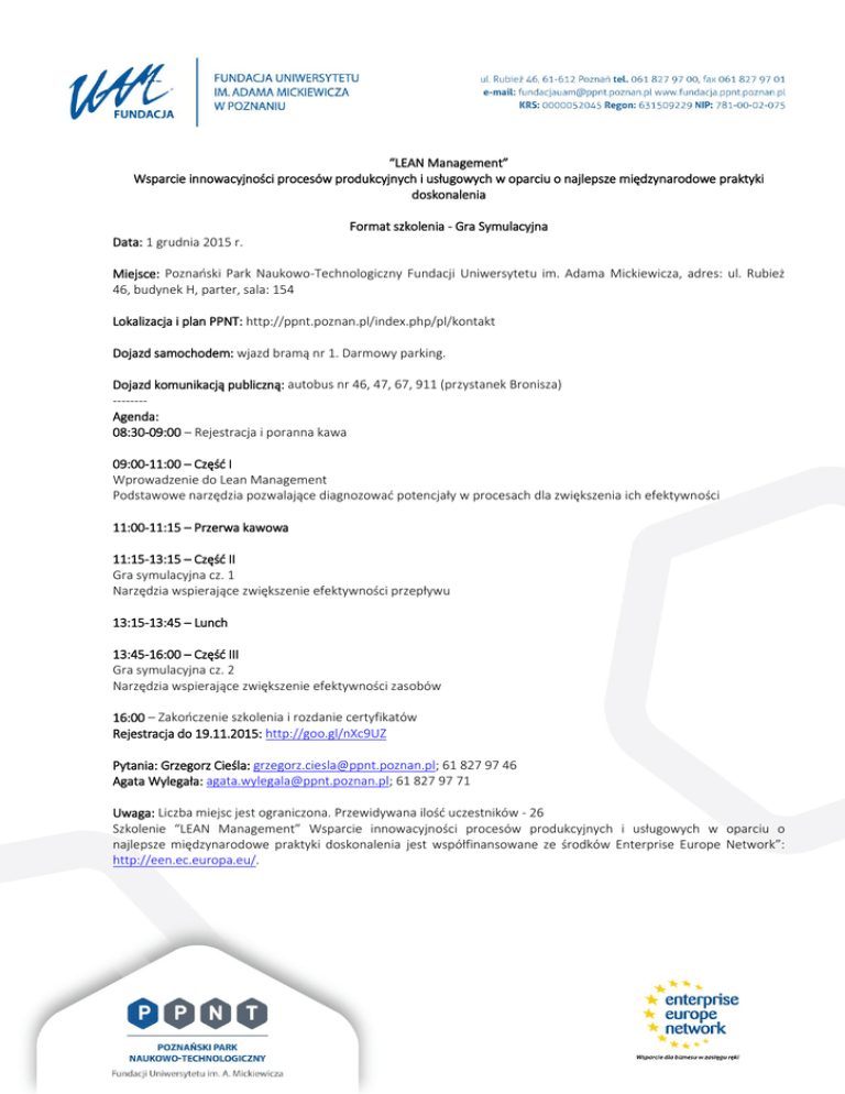 “LEAN Management” Wsparcie innowacyjności procesów produkcyjnych i usługowych w oparciu o najlepsze międzynarodowe praktyki doskonalenia Format szkolenia - Gra Symulacyjna Data: 1 grudnia 2015 r. Miejsce: Poznański Park Naukowo-Technologiczny Fundacji Uniwersytetu im. Adama Mickiewicza, adres: ul. Rubież 46, budynek H, parter, sala: 154 Lokalizacja i plan PPNT: http://ppnt.poznan.pl/index.php/pl/kontakt Dojazd samochodem: wjazd bramą nr 1. Darmowy parking. Dojazd komunikacją publiczną: autobus nr 46, 47, 67, 911 (przystanek Bronisza) -------Agenda: 08:30-09:00 – Rejestracja i poranna kawa 09:00-11:00 – Część I Wprowadzenie do Lean Management Podstawowe narzędzia pozwalające diagnozować potencjały w procesach dla zwiększenia ich efektywności 11:00-11:15 – Przerwa kawowa 11:15-13:15 – Część II Gra symulacyjna cz. 1 Narzędzia wspierające zwiększenie efektywności przepływu 13:15-13:45 – Lunch 13:45-16:00 – Część III Gra symulacyjna cz. 2 Narzędzia wspierające zwiększenie efektywności zasobów 16:00 – Zakończenie szkolenia i rozdanie certyfikatów Rejestracja do 19.11.2015: http://goo.gl/nXc9UZ Pytania: Grzegorz Cieśla: [email protected]; 61 827 97 46 Agata Wylegała: [email protected]; 61 827 97 71 Uwaga: Liczba miejsc jest ograniczona. Przewidywana ilość uczestników - 26 Szkolenie “LEAN Management” Wsparcie innowacyjności procesów produkcyjnych i usługowych w oparciu o najlepsze międzynarodowe praktyki doskonalenia jest współfinansowane ze środków Enterprise Europe Network”: http://een.ec.europa.eu/. Cel szkolenia: Praktyczne zapoznanie uczestników z podstawowymi narzędziami Lean Management służącymi do doskonalenia procesów produkcyjnych i usługowych. Opis szkolenia: Efektywność procesów jest wymaganym wskaźnikiem w obszarach produkcji i usług dla zaspokojenia potrzeb klientów, a także obniżania kosztów przedsiębiorstwa. Coraz większa dostępność na rynku produktów i usług wymusza na przedsiębiorcach z jednej strony wprowadzanie innowacyjnej oferty, a z drugiej silnego konkurowania ceną, jakością i krótkim czasem realizacji. W realizacji tego celu istotnie pomaga metoda Lean Management, używana przez tysiące firm z całego świata do poprawy swojej efektywności i budowania kultury organizacyjnej. W trakcie szkolenia poprzez grę symulacyjną uczestnicy w praktyczny sposób będą mogli doświadczyć zastosowania podstawowych metod doskonalenia procesów służących do skrócenia czasu realizacji zleceń, poprawy jakości i redukcji kosztów. Sylwetka trenera: Krzysztof Firlik Absolwent Zarządzania i inżynierii produkcji na Politechnice Poznańskiej. Studiował również Zarządzanie Produkcją na studiach podyplomowych WSE w Krakowie, oraz w Ecole Nationale d’Ingenieurs de Metz (Francja). Posiada wieloletnie doświadczenie w zakresie organizacji i optymalizacji procesów produkcyjnych głównie w branżach automotive i medycznej w zakładach produkcyjnych w Polsce i we Francji. Realizował m.in. projekty związane z transferem zakładu produkcyjnego, reorganizacją procesów dla rozbudowy hali produkcyjnej, budowaniem kultury Lean w przedsiębiorstwie produkcyjnym, wzrostem zaangażowania pracowników w doskonalenie procesów. Pracował jako manager działu optymalizacji procesów jak również działu inżynierii produkcji. Jest również współorganizatorem Otwartej Konferencji Lean w Poznaniu, konsultantem merytorycznym i trenerem studiów Lean Management w WSB w Poznaniu.