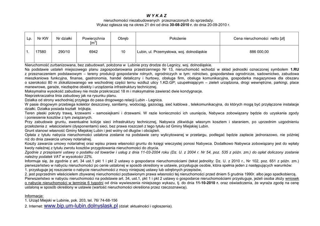 WYKAZ nieruchomości niezabudowanych przeznaczonych do sprzedaży. Wykaz ogłasza się na okres 21 dni od dnia 30-08-2010 r. do dnia 20-09-2010 r. Lp. 1. Nr KW 17580 Nr działki Powierzchnia 2 [m ] Obręb 290/10 6942 10 Położenie Lubin, ul. Przemysłowa, woj. dolnośląskie Cena nieruchomości netto [zł] 886 000,00 Nieruchomość zurbanizowana, bez zabudowań, położona w Lubinie przy drodze do Legnicy, woj. dolnośląskie. Na podstawie ustaleń miejscowego planu zagospodarowania przestrzennego Nr 13, nieruchomość wchodzi w skład jednostki oznaczonej symbolem 1.RU z przeznaczeniem podstawowym – tereny produkcji gospodarstw rolnych, ogrodniczych w tym: rolnictwo, gospodarstwa ogrodnicze, sadownictwo, zabudowa mieszkaniowa funkcyjna, finanse, gastronomia, handel detaliczny i hurtowy, obsługa firm, obsługa komunikacyjna, gospodarka magazynowa dla obszaru o szerokości 80 m zlokalizowanego we wschodniej części ternu wzdłuż ulicy 1.KD.GP; uzupełniającym – zieleń urządzona, drogi wewnętrzne, parkingi, place manewrowe, garaże, niezbędne obiekty i urządzenia infrastruktury technicznej. Maksymalna wysokość zabudowy nie może przekraczać 18 m i maksymalnie zawierać dwie kondygnacje. Nieprzekraczalna linia zabudowy jak na rysunku planu. Działka od strony wschodniej przylega do pasa drogowego relacji Lubin - Legnica. W pasie drogowym przebiega kolektor deszczowy, sanitarny, wodociąg, gazociąg, sieć kablowa , telekomunikacyjna, do których mogą być przyłączone instalacje działki. Działka posiada kształt trójkąta. Teren płaski pokryty trawą, krzewami - samosiejkami i drzewami. W razie konieczności ich usunięcia, Nabywca zobowiązany będzie do uzyskania zgody i poniesienie kosztów z tym związanych. Przy zabudowie gruntu, ewentualne kolizje sieci infrastruktury technicznej, Nabywca zlikwiduje własnym kosztem i staraniem, po uprzednim uzgodnieniu przełożenia z właścicielami (dysponentami) sieci, bez prawa roszczeń z tego tytułu od Gminy Miejskiej Lubin. Grunt stanowi własność Gminy Miejskiej Lubin i jest wolny od długów i obciążeń. Opłata z tytułu nabycia nieruchomości ustalona zostanie na podstawie ceny wylicytowanej w przetargu, podlegać będzie zapłacie jednorazowo, nie później niż do dnia zawarcia umowy notarialnej. Koszty zawarcia umowy notarialnej oraz wpisu prawa własności gruntu do księgi wieczystej ponosi Nabywca. Dodatkowo Nabywca zobowiązany jest do wpłaty kwoty należnej z tytułu zwrotu kosztów przygotowania nieruchomości do zbycia. Zgodnie z przepisami ustawy o podatku od towarów i usług z dnia 11-03-2004 roku (Dz. U. z 2004 r. Nr 54, poz. 535 z późn. zm.) do opłat doliczony zostanie należny podatek VAT w wysokości 22%. Informuje się, że zgodnie z art. 34 ust.1 pkt 1 i pkt 2 ustawy o gospodarce nieruchomościami (tekst jednolity: Dz. U. z 2010 r., Nr 102, poz. 651 z późn. zm.) pierwszeństwo w nabyciu nieruchomości po cenie ustalonej w sposób określony w ustawie, przysługuje osobie, która spełnia jeden z następujących warunków: 1. przysługuje jej roszczenie o nabycie nieruchomości z mocy niniejszej ustawy lub odrębnych przepisów, 2. jest poprzednim właścicielem zbywanej nieruchomości pozbawionym prawa własności tej nieruchomości przed dniem 5 grudnia 1990r. albo jego spadkobiercą. Pierwszeństwo w nabyciu nieruchomości na podstawie art. 34, ust.1, pkt 1 i pkt 2 ustawy o gospodarce nieruchomościami przysługuje, jeżeli osoba złoży wniosek o nabycie nieruchomości w terminie 6 tygodni od dnia wywieszenia niniejszego wykazu, tj. do dnia 11-10-2010 r. oraz oświadczenia, że wyraża zgodę na cenę ustaloną w sposób określony w ustawie (wartość nieruchomości określona przez rzeczoznawcę). Informacje: 1. Urząd Miejski w Lubinie, pok. 203, tel. 76/ 74-68-156 2. Internet: www.bip.um-lubin.dolnyslask.pl (dział: aktualności i ogłoszenia).