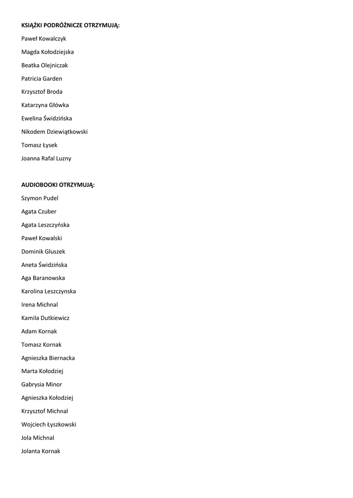 KSIĄŻKI PODRÓŻNICZE OTRZYMUJĄ: Paweł Kowalczyk Magda Kołodziejska Beatka Olejniczak Patricia Garden Krzysztof Broda Katarzyna Główka Ewelina Świdzińska Nikodem Dziewiątkowski Tomasz Łysek Joanna Rafal Luzny AUDIOBOOKI OTRZYMUJĄ: Szymon Pudel Agata Czuber Agata Leszczyńska Paweł Kowalski Dominik Gluszek Aneta Świdzińska Aga Baranowska Karolina Leszczynska Irena Michnal Kamila Dutkiewicz Adam Kornak Tomasz Kornak Agnieszka Biernacka Marta Kołodziej Gabrysia Minor Agnieszka Kołodziej Krzysztof Michnal Wojciech Łyszkowski Jola Michnal Jolanta Kornak