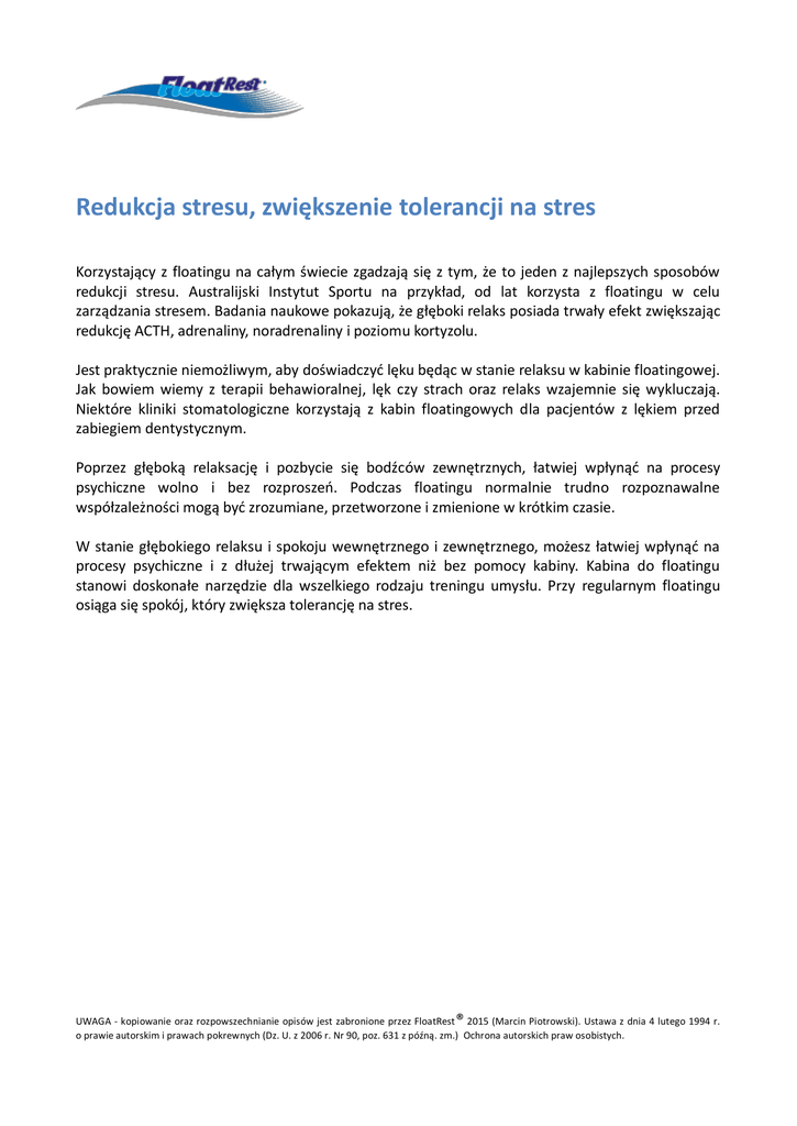 Redukcja stresu, zwiększenie tolerancji na stres Korzystający z floatingu na całym świecie zgadzają się z tym, że to jeden z najlepszych sposobów redukcji stresu. Australijski Instytut Sportu na przykład, od lat korzysta z floatingu w celu zarządzania stresem. Badania naukowe pokazują, że głęboki relaks posiada trwały efekt zwiększając redukcję ACTH, adrenaliny, noradrenaliny i poziomu kortyzolu. Jest praktycznie niemożliwym, aby doświadczyć lęku będąc w stanie relaksu w kabinie floatingowej. Jak bowiem wiemy z terapii behawioralnej, lęk czy strach oraz relaks wzajemnie się wykluczają. Niektóre kliniki stomatologiczne korzystają z kabin floatingowych dla pacjentów z lękiem przed zabiegiem dentystycznym. Poprzez głęboką relaksację i pozbycie się bodźców zewnętrznych, łatwiej wpłynąć na procesy psychiczne wolno i bez rozproszeń. Podczas floatingu normalnie trudno rozpoznawalne współzależności mogą być zrozumiane, przetworzone i zmienione w krótkim czasie. W stanie głębokiego relaksu i spokoju wewnętrznego i zewnętrznego, możesz łatwiej wpłynąć na procesy psychiczne i z dłużej trwającym efektem niż bez pomocy kabiny. Kabina do floatingu stanowi doskonałe narzędzie dla wszelkiego rodzaju treningu umysłu. Przy regularnym floatingu osiąga się spokój, który zwiększa tolerancję na stres. UWAGA - kopiowanie oraz rozpowszechnianie opisów jest zabronione przez FloatRest ® 2015 (Marcin Piotrowski). Ustawa z dnia 4 lutego 1994 r. o prawie autorskim i prawach pokrewnych (Dz. U. z 2006 r. Nr 90, poz. 631 z późną. zm.) Ochrona autorskich praw osobistych.