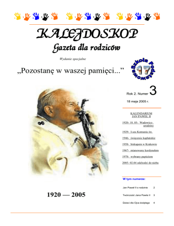 KALEJDOSKOP Gazeta dla rodziców Wydanie specjalne „Pozostanę w waszej pamięci...” Rok 2. Numer 3 18 maja 2005 r. KALENDARIUM JAN PAWEŁ II 1920- 18. 05- Wadowiceurodziny 1929- I-sza Komunia św. 1946- święcenia kapłańskie 1958- biskupem w Krakowie 1967- mianowany kardynałem 1978- wybrany papieżem 2005- 02.04 odchodzi do nieba W tym numerze: 1920 — 2005 Jan Paweł II o rodzinie 2 Twórczość Jana Pawła II 3 Dzieci dla Ojca świętego 4 JAN PAWEŁ II O RODZINIE Rodzina dla Jana Pawła II była bardzo ważna i droga. Poświęcił jej wiele miejsca w swoim nauczaniu między innymi w adhortacji apostolskiej „ Familiaris consortio”- o zadaniach rodziny w świecie współczesnym z 1981 roku. W jej tekście zaznaczył, że rodzina pozostaje na wszystkich kontynentach „drogą Kościoła”, w szczególny sposób, kiedy doznaje wewnętrznych kryzysów, gdy narażona jest na wiele niebezpieczeństw, które utrudniają jej właściwe funkcjonowanie. praw rodziców jest spoczywająca na nich poważna powinność głębokiego zaangażowania się w nawiązanie serdecznego i czynnego kontaktu z nauczycielami i kierownictwem szkoły”. W dokumencie tym ukazuje prawdziwy wizerunek rodziny w świetle Bożego zamysły; broni godności każdego z jej członków, apeluje o poszanowanie dla życia poczętego, porusza problemy współczesnej rodziny, daje wskazówki rodzinom w różnych trudnych sytuacjach, przedstawia drogi, którymi powinna podążać rodzina, by mo g ła stać się „ko munią Boga z ludźmi”. Papież pisze w liście tym o cywilizacji miłości opartej na czwartym przykazaniu Bożym, przymierzu małżeńskim, dobru wspólnym małżeństwa i rodziny, bezinteresownym darze z samego siebie, odpowiedzialnym rodzicielstwie, miłości wymagającej. „Miłość jest wymagająca”- te słowa potwierdza nauką św. Pawła . Pisze tak: ”rozmyślając nad rozdziałem 13 Pierwszego Listu św. Pawła do Koryntian, wchodzimy równocześnie drogą najprostszą w to, co trzeba nazwać cywilizacją miłości. Nie ma innego tekstu biblijnego, który wyrażałby tę prawdę w sposób prostszy i pełniejszy zarazem: hymn o miłości”. Jan Paweł II naucza w adhortacji: ”Wszyscy członkowie rodziny, każdy wedle własnego daru, mają łaskę i odpowiedzialny obowiązek budowania dzień po dniu komunii osób, tworząc z rodziny „szkołę bogatszego człowieczeństwa”. Dokonuje się to poprzez łaskę i miłość wobec dzieci, wobec chorych i starszych: poprzez wzajemną codzienną służbę wszystkich: poprzez dzielenie się dobrami, radościami, cierpieniami”. Poruszając problem wychowania w rodzinie Ojciec św. pisze że,” Misja wychowania wymaga, ażeby rodzice chrześcijańscy ukazali dzieciom wszystkie te treści, które są konieczne do stopniow e g o do jr z e w a n ia ic h o so bo wo śc i z punktu widzenia chrześcijańskiego(…). Rodzicom Bóg powierza ”troskę o wzrost dziecka Bożego, brata Chrystusa, świątyni Ducha Świętego, członka Kościoła”. Wychowanie w nauczaniu Jana Pawła II jest istotną wartością życia ludzkiego, prawem i obowiązkiem rodziców, przedmiotem współpracy rodziny z innymi czynnikami wychowania: „badanie wychowawcze rodziny chrześcijańskiej (…) zakłada nową formę współpracy rodziców ze wspólnotami chrześcijańskimi oraz grup wychowawczych z duszpasterzami (…) dopełnieniem Str. 2 Do rodzin na całym świecie Ojciec św. napisał też list apostolski z okazji ogłoszenia 1994 roku Rokiem Rodziny. Rok ten skierował wszystkie myśli i serca ludzi w stronę Nazaretu, gdzie żyła Święta Rodzina, do której należał Jezus, Maryja i św. Józef. Z głębokiej troski o rodzinę wypływa apel Ojca św. o modlitwę za wszystkie rodziny na świecie. Apel ten wyraża się w słowach listu:” Trzeba, ażeby modlitwa stała się dominantą Roku Rodziny w Kościele: modlitwa rodziny, modlitwa za rodziny, modlitwa z rodzinami”. Dzięki niej” rodzina staje się silna Bogiem”. Siła rodziny chrześcijańskiej tkwi w bliskości obcowania z Bogiem poprzez modlitwę i udział w sakramentach, które daje Kościół. Modlitwa bowiem łączy niebo z ziemią najpiękniej. Ta bliskość rodziny z Bogiem- jej Stwórcą- wypływa z miłości, którą Stwórca nasz wyraził już na samym początku, kiedy stworzył świat. Słowa Jana Pawła II o rodzinie i do rodzin można znaleźć również w Jego homiliach głoszonych w czasie pielgrzymek do Ojczyzny. Mówiąc o swojej ziemskiej rodzinie uczy nas wszystkich szacunku i miłości do własnych rodzin. Naszą odpowiedzią niech będzie studiowanie Jego nauczania i realizacja w codziennym życiu, a On będzie błogosławił naszym poczynaniom z okna domu swego Ojca. KALEJDOSKOP ŻYCIE I TWÓRCZOŚĆ Jana Pawła II ENCYKLIKI JANA PAWŁA II Encyklika to pismo okólne, napisane w formie listu papieża do biskupów i wiernych całego świata . 1. REDEMPTOR HOMINIS- o Jezusie Chrystusie Odkupicielu człowieka 1979 r. 2. DIVES IN MISERICORDIA- o Bożym miłosierdziu 1980 r. 3. LABOREM EXERCENS – o pracy ludzkiej 1981 r. 4. SLAVORUM APOSTOLI – w rocznicę dzieła ewangelizacji świętych Cyryla i Metodego 1985 r. 5. DOMINUM ET VIVIFIKANTEM- o Duchu Świętym w życiu Kościoła i świata 1986 r. 6. REDEMPTORIS MATER- o bł. Maryi Dziewicy w życiu pielgrzymującego Kościoła 1987 r. 7. SOLLICITUDO REI SOCIALIS- z okazji rocznicy ogłoszenia „Populorum progressio” 1987 8. REDEMPTORIS MISSIO- o stałej aktualności posłania misyjnego 1990 r. 9. CENTESIMUS ANNUS- w rocznicę encykliki „Rerum novarum” 1991 r. 10. VERITATIS SPLENDOR- o niektórych podstawowych problemach nauczania moralnego Kościoła 1993 r. JAN PAWEŁ II O WYCHOWAWCACH „Potrzeba szczególnej wrażliwości ze strony wszystkich , którzy pracują w szkole, ażeby stworzyć w niej klimat przyjaznego i otwartego dialogu, wyczulać na dobro wspólne narodu i uczyć młodzież odpowiedzialności za przyszł
