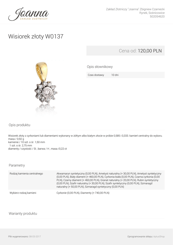 Zakład Złotniczy "Joanna" Zbigniew Czarnecki Rynek, Sośnicowice 502054620 Wisiorek złoty W0137 Cena od: 120,00 PLN Opis słownikowy Czas dostawy 10 dni Opis produktu Wisiorek złoty z cyrkoniami lub diamentami wykonany w żółtym albo białym złocie w próbie 0,585 i 0,333. kamień centralny do wyboru. masa / 0,92 g kamienie / 10 szt. o śr. 1,50 mm 1 szt. o śr. 2,75 mm diamenty / czystość / SI , barwa / H , masa /0,22 ct Parametry Rodzaj kamienia centralnego Akwamaryn syntetyczny (0,00 PLN), Ametyst naturalny (+ 30,00 PLN), Ametyst syntetyczny (0,00 PLN), Biały diament (+ 460,00 PLN), Cyrkonia biała (0,00 PLN), Czarna cyrkonia (0,00 PLN), Czarny diament (+ 460,00 PLN), Granat naturalny (+ 20,00 PLN), Rubin syntetyczny (0,00 PLN), Szafir naturalny (+ 30,00 PLN), Szafir syntetyczny (0,00 PLN), Szmaragd naturalny (+ 50,00 PLN), Szmaragd syntetyczny (0,00 PLN) Wybierz rodzaj kamieni Cyrkonie (0,00 PLN), Diamenty (+ 740,00 PLN) Warianty produktu Plik wygenerowano: 08-03-2017 Oprogramowanie sklepu: AptusShop Zakład Złotniczy "Joanna" Zbigniew Czarnecki Rynek, Sośnicowice 502054620 120,00 PLN Wisiorek złoty W0137/3 złoto 0,333 Wisiorek złoty z cyrkoniami lub diamentami wykonany w żółtym albo białym złocie w próbie 0,585 i 0,333 199,00 PLN Wisiorek złoty W0137/1 żółte złoto 0,585 Wisiorek złoty z cyrkoniami lub diamentami wykonany w żółtym albo białym złocie w próbie 0,585 i 0,333 199,00 PLN Wisiorek złoty W0137/2 białe złoto 0,585 Wisiorek złoty z cyrkoniami lub diamentami wykonany w żółtym albo białym złocie w próbie 0,585 i 0,333 Plik wygenerowano: 08-03-2017 Powered by TCPDF (www.tcpdf.org) Oprogramowanie sklepu: AptusShop