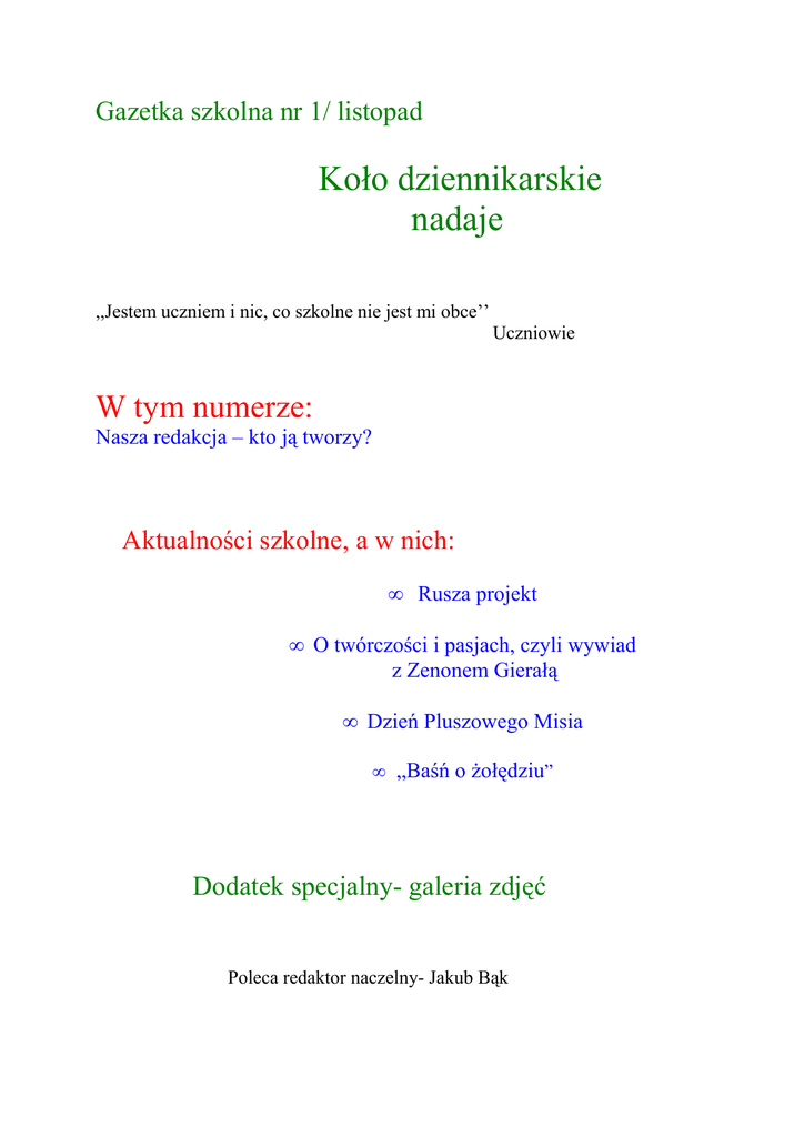 Gazetka szkolna nr 1/ listopad Koło dziennikarskie nadaje ,,Jestem uczniem i nic, co szkolne nie jest mi obce’’ Uczniowie W tym numerze: Nasza redakcja – kto ją tworzy? Aktualności szkolne, a w nich: • Rusza projekt • O twórczości i pasjach, czyli wywiad z Zenonem Gierałą • Dzień Pluszowego Misia • „Baśń o Ŝołędziu” Dodatek specjalny- galeria zdjęć Poleca redaktor naczelny- Jakub Bąk Gazetka to owoc pracy wielu osób, oto członkowie naszej redakcji: JAKUB BĄK– redaktor naczelny SEBASTIAN BEDNARSKI – dziennikarz , ilustrator ALEKSANDRA MĄKOSA – dziennikarz ŁUKASZ SUŁEK – dziennikarz, fotograf ALBERT CHOJNACKI – dziennikarz DANIEL ROMANOWSKI – dziennikarz BEATA GIZICKA – dziennikarz, fotograf ALEKSANDRA BARTKIEWICZ - dziennikarz MICHAŁ MARCZAK – dziennikarz, ilustrator PATRYK ZEGAREK – dziennikarz p. SYLWIA SZAMBOR – opiekunka koła Aktualności Szkolne! Hura, rusza projekt! ,,Uczniowie w Bartodziejach duŜy potencjał moŜliwości mają i dzięki Unii Europejskiej swoją szansę wykorzystają!” W ramach projektu zrealizowane zostaną następujące działania: 1. Zajęcia „Z językiem angielskim ku przyszłości” a) Język angielski klasy I – 1 grupa 5 – osobowa b) Język angielski klasy II– 1 grupa 5– osobowa c) Język angielski klasy III–1 grupa 6– osobowa Celem zajęć jest nauka języka angielskiego przez zabawę, pracę i piosenkę oraz odgrywanie scenek w języku angielskim słuŜące lepszemu zapamiętywaniu i utrwalaniu słownictwa oraz rozwijanie i integracja sprawności językowych uczniów, jak równieŜ przygotowanie do praktycznego wykorzystania języka. 2.. Koło dziennikarskie Zajęcia skierowane będą do uczniów klas IV – VI, grupa 10-osobowa. Podczas spotkań uczniowie zgłębią tajniki dziennikarstwa, będą sporządzać ogłoszenia, redagować gazetkę szkolną, w której znajdą się informacje o innych zajęciach prowadzonych w ramach naszego projektu. Uczniowie będą równieŜ przeprowadzać wywiady z mieszkańcami. 3.Teatralny świat Zajęcia dla uczniów klas IV – VI, 1 grupa 10- osobowa Zajęcia teatralno-plastyczne, oraz taneczno-muzyczne. Celem jest przezwycięŜenie nieśmiałości, pokonanie barier komunikujących, rozwój cech osobowościowych. W celu poznania pracy aktora zostanie zorganizowana wycieczka do teatru. 4. Koło sportowe W ramach koła sportowego realizowana będzie sekcja pływacka oraz sekcja gier planszowych. Pierwsza z nich obejmuje zajęcia rekreacyjne i naukę pływania. Zajęcia przeznaczone są dla uczniów wszystkich klas. Celem jest rozbudzenie ukrytych uzdolnień i uśpionych talentów, co w przyszłości moŜe zaowocować wyłonieniem wybitnych sportowców. Samorealizacja sportowa pozwoli na osiągnięcie lepszych wyników w nauce. Uczniowie będą dojeŜdŜać na zajęcia do Radomia i Kozienic. Sekcja gier planszowych skierowana jest do uczniów klas I – VI. Planuje się utworzyć 2 grupy 10- osobowe. Gry planszowe pozwalają na wykształcenie nawyku logicznego myślenia. Są niezwykle rozwojową formą edukacyjną, pozytywnie wpływają na kształtowanie samodyscypliny. Zajęcia zostaną zakończone turniejem. 5. Koło medialne Powstaną 2 grupy 10- osobowe. Celem zajęć jest nauka właściwego korzystania z komputera i Internetu. Znaczna część osób nie posiada tego w domu, w związku z tym nie ma moŜliwości zdobywania informacji do zajęć, praktycznego wykorzystania sprzętu multimedialnego, tworzenia prezentacji multimedialnych. W ramach zajęć zostanie zorganizowana wycieczka do telewizji. 6. „Z matematyką i przyrodą ku przyszłości” 1 grupa -zajęcia matematyczne, przygotowujące do egzaminu po szkole podstawowej,1 grupa- zajęcia przyrodnicze w terenie – obserwacje przyrodnicze, zostaną opracowane gazetki ekologiczne. Zorganizowana będzie wycieczka przyrodnicza oraz pogadanki z udziałem ciekawych osób. 7.3-dniowa wycieczka edukacyjna – Zielona Szkoła, dla grupy uczniów biorących udział w projekcie – 35 osób. Jak wynika z wielu publikacji naukowych, wycieczki są najbardziej efektywną formą pracy pozalekcyjnej. Wyjazd ma na celu poznanie krajobrazu gór, doskonalenia umiejętności zdobytych na kołach zainteresowań oraz kształtowania samodzielności i współpracy w grupie. 8.Poradnictwo psychologiczne-pedagogiczne. Polega ono na wsparciu w zakresie prawidłowego rozwoju i myślenia dzieci oraz młodzieŜy. Pomaga w podniesieniu umiejętności i kompetencji społecznych. W ramach poradnictwa będą prowadzone interwencje w sytuacjach bardzo trudnych, stresowych. Praca specjalistów skoncentruje się na pomocy w motywowaniu, a takŜe podnoszeniu poczucia własnej wartości. Raz w tygodniu pełnione będą dyŜury specjalistów. W szkole nie ma pedagoga ani psychologa. 9. Szkolenie adaptacyjno-rozwojowe „Jak radzić sobie w domu i szkole” Celem jest uaktywnienie rozwoju osobistego, nabycie umiejętności, które będą wykorzystane w Ŝyciu codziennym. Zajęcia będą prowadzone metodami pracy warsztatowej i treningowej. 10.Zajęcia „Z rodziną łatwiej” Celem jest zbudowanie właściwego systemu norm i wartości w szkole i w domu, współpraca w grupie rówieśniczej. Projekt zainicjowany został uroczystym otwarciem, na które przybyli uczniowie z rodzicami, grono pedagogiczne, pani dyrektor oraz Przewodniczący Rady Gminy Jastrzębia. Podkreślił on w przemówieniu waŜność tego przedsięwzięcia i swoje zadowolenie z faktu, Ŝe to właśnie nasza szkoła zyskała szansę wszechstronnego rozwoju. Porozmawiajmy z kimś kim sławnym (wywiad z Zenonem GierałąGierał pisarzem) Red: Ile ksiąŜek Pan napisał? Z.G: Napisałem ich ponad dziesięć, być moŜe więcej, poniewaŜ część jest w druku. Są teŜ takie, których nie liczę. Red: Jaka była Pana pierwsza ksiąŜka? Z.G: Były to „Baśnie i legendy Ziemi Radomskiej”. Wiele pozycji pisałem tylko dla siebie. Red: Kiedy podjął Pan pier