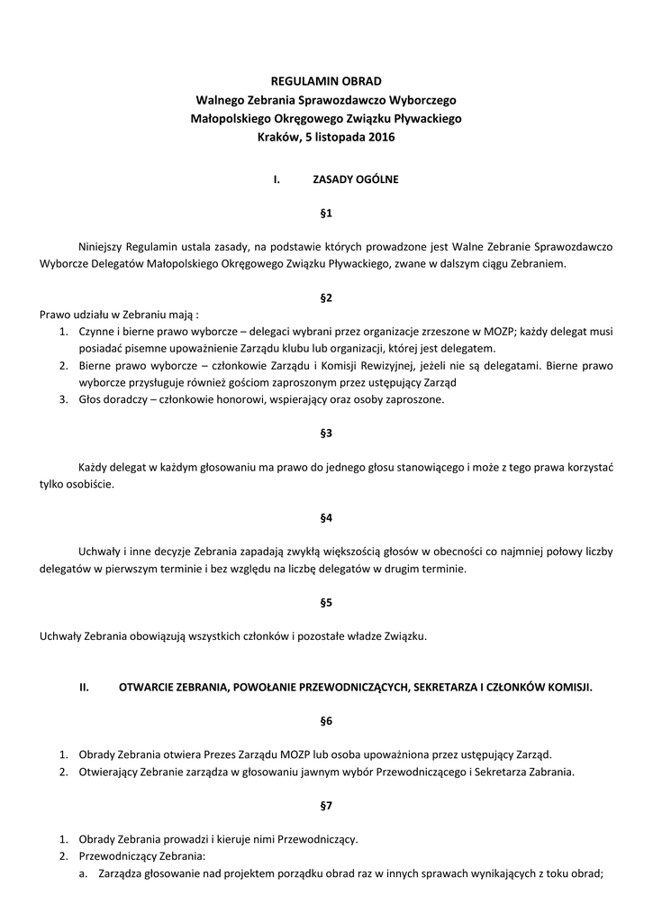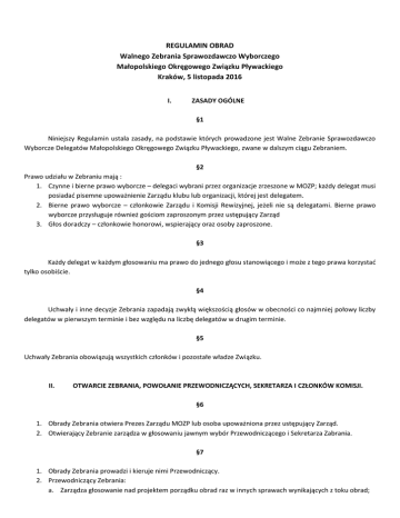 REGULAMIN OBRAD Walnego Zebrania Sprawozdawczo Wyborczego Małopolskiego Okręgowego Związku Pływackiego Kraków, 5 listopada 2016 I. ZASADY OGÓLNE §1 Niniejszy Regulamin ustala zasady, na podstawie których prowadzone jest Walne Zebranie Sprawozdawczo Wyborcze Delegatów Małopolskiego Okręgowego Związku Pływackiego, zwane w dalszym ciągu Zebraniem. §2 Prawo udziału w Zebraniu mają : 1. Czynne i bierne prawo wyborcze – delegaci wybrani przez organizacje zrzeszone w MOZP; każdy delegat musi posiadać pisemne upoważnienie Zarządu klubu lub organizacji, której jest delegatem. 2. Bierne prawo wyborcze – członkowie Zarządu i Komisji Rewizyjnej, jeżeli nie są delegatami. Bierne prawo wyborcze przysługuje również gościom zaproszonym przez ustępujący Zarząd 3. Głos doradczy – członkowie honorowi, wspierający oraz osoby zaproszone. §3 Każdy delegat w każdym głosowaniu ma prawo do jednego głosu stanowiącego i może z tego prawa korzystać tylko osobiście. §4 Uchwały i inne decyzje Zebrania zapadają zwykłą większością głosów w obecności co najmniej połowy liczby delegatów w pierwszym terminie i bez względu na liczbę delegatów w drugim terminie. §5 Uchwały Zebrania obowiązują wszystkich członków i pozostałe władze Związku. II. OTWARCIE ZEBRANIA, POWOŁANIE PRZEWODNICZĄCYCH, SEKRETARZA I CZŁONKÓW KOMISJI. §6 1. Obrady Zebrania otwiera Prezes Zarządu MOZP lub osoba upoważniona przez ustępujący Zarząd. 2. Otwierający Zebranie zarządza w głosowaniu jawnym wybór Przewodniczącego i Sekretarza Zabrania. §7 1. Obrady Zebrania prowadzi i kieruje nimi Przewodniczący. 2. Przewodniczący Zebrania: a. Zarządza głosowanie nad projektem porządku obrad raz w innych sprawach wynikających z toku obrad; b. Kieruje przebiegiem obrad zgodnie z zatwierdzonym porządkiem; c. Wykonuje w granicach swoich kompetencji powzięte przez Zebranie decyzja. §8 1. Zebranie wybiera spośród uczestników następujące Komisje : a. Mandatowo – Skrutacyjną – w liczbie 3 osób – w celu ustalenia pełnomocnictw i prawomocności Zebrania, oraz przygotowania kart do głosowania, przeprowadzenia wyborów, obliczania wyników i ich ogłoszenia Zebraniu; b. Wyborczą – w liczbie 3 osób – w celu ustalenia listy i prezentacji kandydatów do Zarządu i Komisji Rewizyjnej MOZP zgłaszanych przez członków ustępującego Zarządu lub delegatów. Zgłoszenia składane są w formie pisemnej na dostarczonych kartkach; c. Uchwał i Wniosków – w liczbie 3 osób – w celu opracowania i przedłużenia Zebraniu projektów uchwał i wniosków w sprawach wniesionych w toku obrad; 2. Członkowie każdej Komisji wybierają spośród siebie Przewodniczącego. Postanowienia komisji zapadają większością głosów. Przewodniczący Komisji przedstawiają Zebraniu sprawozdanie z ich czynności. §9 1. Do obowiązku Przewodniczącego należy : a. Sprawne i zgodne z przyjętym porządkiem dziennym oraz obowiązującymi przepisami kierowania obradami; b. Udzielanie głosu; c. Poddanie pod głosowanie zgłaszanych wniosków i uchwał; d. Wydawanie stosownych poleceń porządkowych; e. Zwołanie pierwszego zebrania konstytuującego nowego Zarządu oraz Komisji Rewizyjnej. 2. Przewodniczący Zebrania udziela głosu w dyskusji na podstawie pisemnych lub ustnych zgłoszeń. 3. Przewodniczący Zebrania może poza kolejnością udzielić głosu : a. Zaproszonym gościom i członkom honorowym: b. Członkom Zarządu MOZP, w celu złożenia niezbędnych wyjaśnień. 4. Głos w dyskusji nie powinien przekraczać 5 minut ( nie dotyczy to wyjaśnień gości ). O przedłużeniu lub skróceniu wystąpienia decyduje Przewodniczący Zebrania 5. Podczas dyskusji w sprawie określonej porządkiem obrad ten sam uczestnik Zebrania może wystąpić tylko raz. Przy rozpatrywaniu kwestii w sprawach formalnych Przewodniczący może udzielić głosu tylko jednej osobie „za” i jednej „przeciw”. §10 1. 2. 3. 4. Do zgłoszenia wniosków uprawnieni są wszyscy uczestnicy Zebrania. Wnioski wymagają sformułowania na piśmie i przedłożenia Komisji Uchwał i Wniosków. Wnioski w kwestiach formalnych wymagają krótkiego uzasadnienia (ustnego) i są rozpatrywane natychmiast. Wnioski i projekty uchwał prowadzący podaje pod głosowanie, które odbywa się w sposób jawny za wyjątkiem głosowań personalnych, które muszą być tajne. 5. Wniosek lub uchwała zostają przyjęte, jeżeli uzyskają zwykłą większość głosów. 6. W przypadku równej liczby głosów decyduje przewodniczący. III. WYBORY WŁADZ §11 1. Wszystkie głosowania personalne czyli Wybory Zarządu, akceptacja w skład Zarządu Przewodniczącej Kolegium Sędziów, Komisji Rewizyjnej oraz Delegatów na Walne Zebranie Sprawozdawczo Wyborcze Polskiego Związku Pływackiego odbywają się w głosowaniu tajnym. 2. Zgłoszenia kandydatów przyjmuje Komisja Wyborcza. 3. Zebranie wybiera 9-13 osobowy Zarząd, 3-5 osobową Komisję Rewizyjną oraz 7 osobowy skład delegatów na Walny Zjazd Sprawozdawczo Wyborczy PZP. Do Zarządu, Komisji Rewizyjnej oraz Delegaci na Walny Zjazd PZP wybrani zostają kandydaci z największą ilością uzyskanych głosów, spełniając warunek uzyskania 50% + 1 głos. 4. Komisja Skrutacyjna przeprowadza akt wyborczy. 5. Każdy z kandydatów do Zarządu i Komisji Rewizyjnej musi wyrazić zgodę na umieszczenie jego nazwiska na liście. 6. W przypadku uzyskania równej ilości głosów przez 2 lub więcej kandydatów na ostatnim miejscu do poszczególnych władz, Przewodniczący zarządza powtórne wybory zainteresowanych. IV. POSTANOWIENIA KOŃCOWE §12 1. Protokół Zebrania musi spełnić obowiązujące zwyczajowo wymogi formalne i merytoryczne oraz obejmować oryginalne teksty wszystkich dokumentów roboczych Zebrania jako załącznik do protokołu. 2. Protokół podpisuje Przewodniczący Zebrania i Prezes MOZP 3. Protokół wraz z innymi dokumentami Zebrania przechowywany jest w aktach 