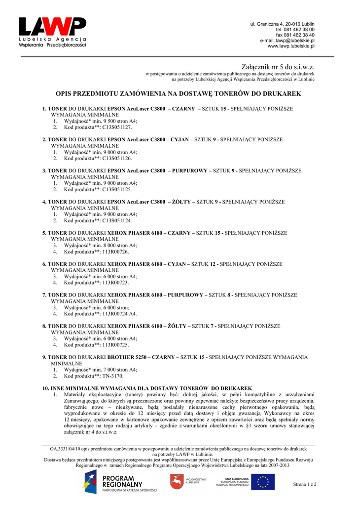 ul. Graniczna 4, 20-010 Lublin tel. 081 462 38 00 fax 081 462 38 40 e-mail: [email protected] www.lawp.lubelskie.pl Załącznik nr 5 do s.i.w.z. w postępowaniu o udzielenie zamówienia publicznego na dostawę tonerów do drukarek na potrzeby Lubelskiej Agencji Wspierania Przedsiębiorczości w Lublinie OPIS PRZEDMIOTU ZAMÓWIENIA NA DOSTAWĘ TONERÓW DO DRUKAREK 1. TONER DO DRUKARKI EPSON AcuLaser C3800 – CZARNY – SZTUK 15 - SPEŁNIAJĄCY PONIśSZE WYMAGANIA MINIMALNE 1. Wydajność* min. 9 500 stron A4; 2. Kod produktu**: C13S051127. 2. TONER DO DRUKARKI EPSON AcuLaser C3800 – CYJAN – SZTUK 9 - SPEŁNIAJĄCY PONIśSZE WYMAGANIA MINIMALNE 1. Wydajność* min. 9 000 stron A4; 2. Kod produktu**: C13S051126. 3. TONER DO DRUKARKI EPSON AcuLaser C3800 – PURPUROWY – SZTUK 9 - SPEŁNIAJĄCY PONIśSZE WYMAGANIA MINIMALNE 1. Wydajność* min. 9 000 stron A4; 2. Kod produktu**: C13S051125. 4. TONER DO DRUKARKI EPSON AcuLaser C3800 – śÓŁTY – SZTUK 9 - SPEŁNIAJĄCY PONIśSZE WYMAGANIA MINIMALNE 1. Wydajność* min. 9 000 stron A4; 2. Kod produktu**: C13S051124. 5. TONER DO DRUKARKI XEROX PHASER 6180 – CZARNY – SZTUK 15 - SPEŁNIAJĄCY PONIśSZE WYMAGANIA MINIMALNE 3. Wydajność* min. 8 000 stron A4; 4. Kod produktu**: 113R00726. 6. TONER DO DRUKARKI XEROX PHASER 6180 – CYJAN – SZTUK 12 - SPEŁNIAJĄCY PONIśSZE WYMAGANIA MINIMALNE 3. Wydajność* min. 6 000 stron A4; 4. Kod produktu**: 113R00723. 7. TONER DO DRUKARKI XEROX PHASER 6180 – PURPUROWY – SZTUK 8 - SPEŁNIAJĄCY PONIśSZE WYMAGANIA MINIMALNE 3. Wydajność* min. 6 000 stron; 4. Kod produktu**: 113R00724 A4. 8. TONER DO DRUKARKI XEROX PHASER 6180 – śÓŁTY – SZTUK 7 - SPEŁNIAJĄCY PONIśSZE WYMAGANIA MINIMALNE 3. Wydajność* min. 6 000 stron A4; 4. Kod produktu**: 113R00725. 9. TONER DO DRUKARKI BROTHER 5250 – CZARNY – SZTUK 15 - SPEŁNIAJĄCY PONIśSZE WYMAGANIA MINIMALNE 1. Wydajność* min. 7 000 stron A4; 2. Kod produktu**: TN-3170. 10. INNE MINIMALNE WYMAGANIA DLA DOSTAWY TONERÓW DO DRUKAREK 1. Materiały eksploatacyjne (tonery) powinny być: dobrej jakości, w pełni kompatybilne z urządzeniami Zamawiającego, do których są przeznaczone oraz powinny zapewniać naleŜyte bezpieczeństwo pracy urządzenia, fabrycznie nowe – nieuŜywane, będą posiadały nienaruszone cechy pierwotnego opakowania, będą wyprodukowane w okresie do 12 miesięcy przed datą dostawy i objęte gwarancją Wykonawcy na okres 12 miesięcy, opakowane w kartonowe opakowanie zewnętrzne z opisem zawartości oraz będą spełniały normy obowiązujące na tego rodzaju artykuły - zgodnie z warunkami określonymi w §1 wzoru umowy stanowiącej załącznik nr 4 do s.i.w.z. OA.3331/04/10 opis przedmiotu zamówienia w postępowaniu o udzielenie zamówienia publicznego na dostawę tonerów do drukarek na potrzeby LAWP w Lublinie. Dostawa będąca przedmiotem niniejszego postępowania jest współfinansowana przez Unię Europejską z Europejskiego Funduszu Rozwoju Regionalnego w ramach Regionalnego Programu Operacyjnego Województwa Lubelskiego na lata 2007-2013 Strona 1 z 2 ul. Graniczna 4, 20-010 Lublin tel. 081 462 38 00 fax 081 462 38 40 e-mail: [email protected] www.lawp.lubelskie.pl 2. 3. Wszystkie materiały eksploatacyjne muszą być wytworzone w sposób gwarantujący kompatybilność z urządzeniem, dla którego zostały przypisane i ich stosowanie nie moŜe naruszać warunków gwarancji urządzeń. Termin i sposób realizacji dostawy przez Wykonawcę: a) Termin realizacji dostaw: od daty podpisania umowy do 30 CZERWCA 2010 roku. b) Dostawa do siedziby Zamawiającego na terenie Lublina kolejnych partii tonerów połączona z ich wniesieniem bez udziału Zamawiającego. PowyŜsze czynności Wykonawca powinien wykonać w ramach własnych zasobów ludzkich i sprzętowych z uwzględnieniem konieczności dostaw w godzinach pracy Zamawiającego. Zamawiający dopuszcza dostawy realizowane za pomocą firm spedycyjnych itp. ale wymagane jest wniesienie tonerów do wskazanych miejsc (pomieszczeń) przez Zamawiającego, bez udziału Zamawiającego. 4. 5. 6. Wykonawca zobowiązuje się do pokrycia kosztów naprawy drukarki, jeŜeli jej uszkodzenie nastąpiło wskutek uŜytkowania tonera dostarczonego przez Wykonawcę. W przypadku oferowania tonerów innych producentów niŜ zalecane przez producenta urządzenia, Wykonawca złoŜy np. zaświadczenie (raport z testów) wystawione przez producenta oferowanych tonerów do drukarek lub jego upowaŜnionego przedstawiciela, potwierdzające spełnienie normy ISO/IEC 19752 w zakresie testowania wydajności oferowanych tonerów lub zaświadczenie wystawione przez niezaleŜny podmiot uprawniony do kontroli jakości potwierdzający, Ŝe dostarczone produkty odpowiadają w/w normom technicznym lub równowaŜne zaświadczenie wystawione przez podmioty mające swoją siedzibę w innym państwie członkowskim Europejskiego Obszaru Gospodarczego. Wszystkie złoŜone dokumenty winny być w języku polskim lub ich tłumaczenia na język polski potwierdzone za zgodność z oryginałem przez Wykonawcę. Udowodnienie równowaŜności artykułów eksploatacyjnych leŜy po stronie Wykonawcy. W przypadku, gdy produkt zalecany przez producenta urządzenia posiada inteligentny układ elektroniczny (chip) przekazujący informację o stanie zuŜycia tonera, Wykonawca złoŜy oświadczenie, Ŝe produkt równowaŜny posiada sprawny układ analogicznie działający. * zgodnie z normą ISO/IEC 19752 ** kod produktu zalecany przez producenta urządzenia określa klasę produktu będącego przedmiotem zamówienia i słuŜy ustaleniu standardu w zakresie wymogów technicznych, uŜytkowych i jakościowych postawionych przez Zamawiającego lub artykuły eksploatacyjne równowaŜne. Przez równowaŜne naleŜy rozumieć artykuły nowe – nieuŜywane, nie zawierające Ŝadnych znamion wcześniejszej eksploatacji, o wydajności i jakości wydruku (nierozmazywanie się nadruku, nie przerywanie ciągłości nadruku,
