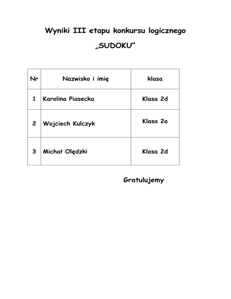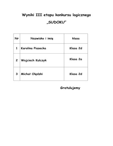 Wyniki III etapu konkursu logicznego „SUDOKU” Nr Nazwisko i imię klasa 1 Karolina Piasecka Klasa 2d 2 Wojciech Kulczyk Klasa 2a 3 Michał Olędzki Klasa 2d Gratulujemy