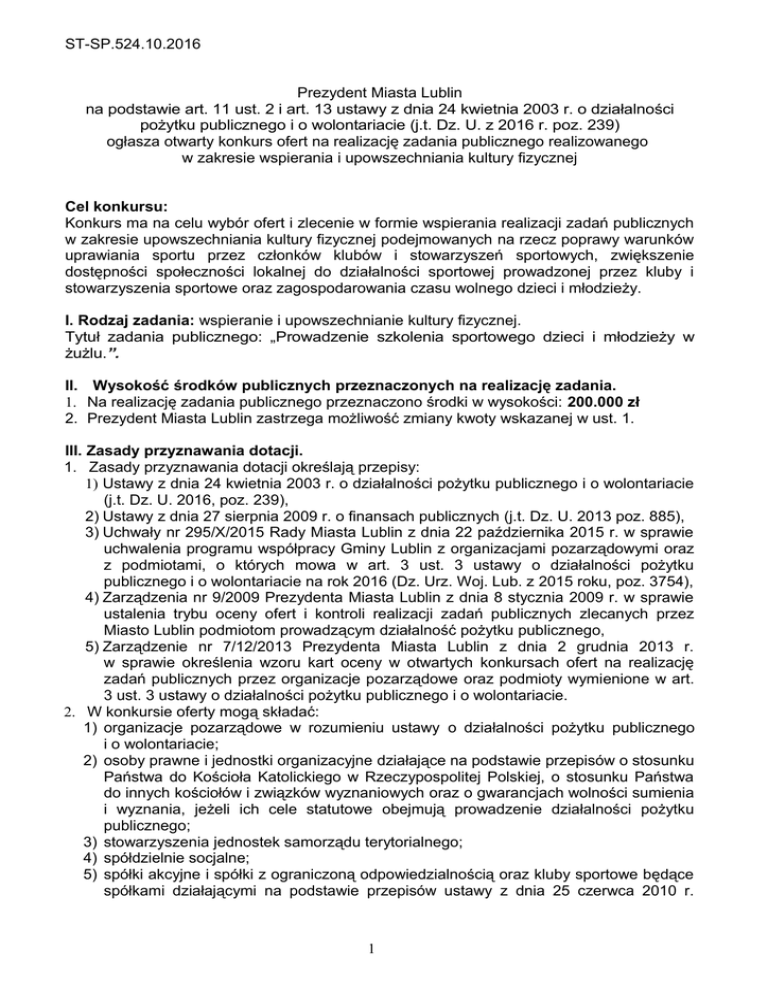 ST-SP.524.10.2016 Prezydent Miasta Lublin na podstawie art. 11 ust. 2 i art. 13 ustawy z dnia 24 kwietnia 2003 r. o działalności pożytku publicznego i o wolontariacie (j.t. Dz. U. z 2016 r. poz. 239) ogłasza otwarty konkurs ofert na realizację zadania publicznego realizowanego w zakresie wspierania i upowszechniania kultury fizycznej Cel konkursu: Konkurs ma na celu wybór ofert i zlecenie w formie wspierania realizacji zadań publicznych w zakresie upowszechniania kultury fizycznej podejmowanych na rzecz poprawy warunków uprawiania sportu przez członków klubów i stowarzyszeń sportowych, zwiększenie dostępności społeczności lokalnej do działalności sportowej prowadzonej przez kluby i stowarzyszenia sportowe oraz zagospodarowania czasu wolnego dzieci i młodzieży. I. Rodzaj zadania: wspieranie i upowszechnianie kultury fizycznej. Tytuł zadania publicznego: „Prowadzenie szkolenia sportowego dzieci i młodzieży w żużlu.”. II. Wysokość środków publicznych przeznaczonych na realizację zadania. 1. Na realizację zadania publicznego przeznaczono środki w wysokości: 200.000 zł 2. Prezydent Miasta Lublin zastrzega możliwość zmiany kwoty wskazanej w ust. 1. III. Zasady przyznawania dotacji. 1. Zasady przyznawania dotacji określają przepisy: 1) Ustawy z dnia 24 kwietnia 2003 r. o działalności pożytku publicznego i o wolontariacie (j.t. Dz. U. 2016, poz. 239), 2) Ustawy z dnia 27 sierpnia 2009 r. o finansach publicznych (j.t. Dz. U. 2013 poz. 885), 3) Uchwały nr 295/X/2015 Rady Miasta Lublin z dnia 22 października 2015 r. w sprawie uchwalenia programu współpracy Gminy Lublin z organizacjami pozarządowymi oraz z podmiotami, o których mowa w art. 3 ust. 3 ustawy o działalności pożytku publicznego i o wolontariacie na rok 2016 (Dz. Urz. Woj. Lub. z 2015 roku, poz. 3754), 4) Zarządzenia nr 9/2009 Prezydenta Miasta Lublin z dnia 8 stycznia 2009 r. w sprawie ustalenia trybu oceny ofert i kontroli realizacji zadań publicznych zlecanych przez Miasto Lublin podmiotom prowadzącym działalność pożytku publicznego, 5) Zarządzenie nr 7/12/2013 Prezydenta Miasta Lublin z dnia 2 grudnia 2013 r. w sprawie określenia wzoru kart oceny w otwartych konkursach ofert na realizację zadań publicznych przez organizacje pozarządowe oraz podmioty wymienione w art. 3 ust. 3 ustawy o działalności pożytku publicznego i o wolontariacie. 2. W konkursie oferty mogą składać: 1) organizacje pozarządowe w rozumieniu ustawy o działalności pożytku publicznego i o wolontariacie; 2) osoby prawne i jednostki organizacyjne działające na podstawie przepisów o stosunku Państwa do Kościoła Katolickiego w Rzeczypospolitej Polskiej, o stosunku Państwa do innych kościołów i związków wyznaniowych oraz o gwarancjach wolności sumienia i wyznania, jeżeli ich cele statutowe obejmują prowadzenie działalności pożytku publicznego; 3) stowarzyszenia jednostek samorządu terytorialnego; 4) spółdzielnie socjalne; 5) spółki akcyjne i spółki z ograniczoną odpowiedzialnością oraz kluby sportowe będące spółkami działającymi na podstawie przepisów ustawy z dnia 25 czerwca 2010 r. 1 o sporcie (j.t. Dz. U. z 2016 r., poz. 176), które nie działają w celu osiągnięcia zysku oraz przeznaczają całość dochodu na realizację celów statutowych oraz nie przeznaczają zysku do podziału między swoich udziałowców, akcjonariuszy i pracowników. 3. Forma realizacji zadania: wsparcie. 4. Złożona oferta musi być zgodna ze wzorem określonym w rozporządzeniu Ministra Pracy i Polityki Społecznej z dnia 15 grudnia 2010 r. w sprawie wzoru oferty i ramowego wzoru umowy dotyczących realizacji zadania publicznego oraz wzoru sprawozdania z wykonania tego zadania (Dz. U. z 2011 Nr 6, poz. 25) – oraz posiadać załączniki w niej wymienione, tj. aktualny odpis z Krajowego Rejestru Sądowego, innego rejestru lub ewidencji. 5. W przypadku braku w odpisie z KRS, w odpisie z innego rejestru lub ewidencji, danych dotyczących statutowej działalności, należy przedłożyć aktualny statut podmiotu lub inny równoważny dokument (jeśli przepisy dotyczące podmiotu nie nakładają obowiązku posiadania statutu). 6. Wszystkie pozycje formularza oferty muszą zostać wypełnione; w przypadku, gdy dana pozycja oferty nie odnosi się do oferty lub zadania, należy wpisać np. „nie dotyczy”. 7. Do oferty należy dołączyć również: 1) oświadczenie, że w stosunku do oferenta (oferentów) jest lub nie jest prowadzone postępowanie egzekucyjne, 2) imienny wykaz uczestników szkolenia, uczących się bądź mieszkających w Lublinie wraz z harmonogramem zajęć szkoleniowych, 3) zestawienie zbiorcze grup szkoleniowych, 4) osiągnięcia sportowe uzyskane w roku 2015. 8. Ofertę i oświadczenia składane wraz z ofertą muszą podpisać osoby uprawnione do reprezentowania danego podmiotu lub podmiotów i składania oświadczeń woli w jego imieniu. Jeżeli osoby uprawnione nie posiadają pieczątek imiennych, podpis musi być złożony pełnym imieniem i nazwiskiem w sposób czytelny z podaniem pełnionej funkcji. 9. W przypadku braków lub błędów formalnych w ofercie lub/i załącznikach do oferty, oferent może zostać wezwany w celu ich uzupełnienia. Uzupełnienie to musi nastąpić w terminie 3 dni od daty otrzymania informacji w tej sprawie. 10. W przypadku dołączania pełnomocnictwa należy złożyć dowód wniesienia opłaty skarbowej (od oryginału, odpisu, wypisu, kopii) w oparciu o przepisy ustawy z dnia 16 listopada 2006 r. o opłacie skarbowej (j.t. Dz. U. z 2015, poz. 783 ze zm.). Opłatę w wysokości 17 zł należy dokonać na konto Urzędu Miasta Lublin nr 95 1240 2092 9329 9200 0620 0000). 11. Oferty podmiotów, w stosunku do których prowadzone jest postępowanie egzekucyjne, lub które zalegają z opłacaniem należności z tytułu zobowiązań podatkowych lub/i na ubezpieczenie społeczne nie będą rozpatrywane. 12. Złożenie oferty nie jest r