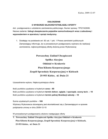 Kielce, 2009-12-07 OGŁOSZENIE O WYBORZE NAJKORZYSTNIEJSZEJ OFERTY dot.: postępowania o udzielenie zamówienia publicznego. Numer sprawy: TP/215/2009. Nazwa zadania: Usługi ubezpieczenia pojazdów samochodowych wraz z zabudową i wyposażeniem w aparaturę i sprzęt medyczny. 1. Działając na podstawie art. 92 ust. 1 pkt. 1 Prawa zamówień publicznych Zamawiający informuje, że w prowadzonym postępowaniu wybrano do realizacji zamówienia, najkorzystniejszą ofertę złożoną przez Wykonawcę: Powszechny Zakład Ubezpieczeń Spółka Akcyjna Oddział w Krakowie Pion Klienta Korporacyjnego Zespół Sprzedaży Korporacyjnej w Kielcach 25-953 Kielce, ul. Duża 21 Uzasadnienie wyboru: Najkorzystniejsza oferta Ilość punktów uzyskana w kryterium cena – 80 Ilość punktów uzyskana w kryterium termin dokon. oględz. i sporządz. oceny tech. – 10 Ilość punktów uzyskana w kryterium termin pełnej likwidacji szkody – 10 Suma uzyskanych punktów – 100 Wybrany Wykonawca obowiązany jest skontaktować się z Zamawiającym w sprawie podpisania umowy w dniu 2009-12-10 W prowadzonym postępowaniu złożono następujące oferty 1. Powszechny Zakład Ubezpieczeń Spółka Akcyjna Oddział w Krakowie Pion Klienta Korporacyjnego, Zespół Sprzedaży Korporacyjnej w Kielcach, 25-953 Kielce, ul. Duża 21 Ilość punktów uzyskana w kryterium cena – 80 Ilość punktów uzyskana w kryterium termin dokon. oględz. i sporządz. oceny tech. – 10 Ilość punktów uzyskana w kryterium termin pełnej likwidacji szkody – 10 Suma uzyskanych punktów – 100 3. Działając na podstawie art. 92 ust. 1 pkt. 2 Prawa zamówień publicznych Zamawiający informuje, że w prowadzonym postępowaniu nie zostały odrzucone żadne oferty. 4. Działając na podstawie art. 92 ust. 1 pkt. 3 Prawa zamówień publicznych Zamawiający informuje, że w prowadzonym postępowaniu nie zostali wykluczeni żadni wykonawcy. Środki ochrony prawnej Od niniejszej decyzji przysługują środki ochrony prawnej określone w ustawie z dnia 29 stycznia 2004 roku Prawo zamówień publicznych (t. j. Dz. U z 2007 r. Nr 223, poz. 1655 z p. zm.) - dział VI "Środki ochrony prawnej". Wobec czynności podjętych przez zamawiającego w toku postępowania oraz w przypadku zaniechania przez zamawiającego czynności, do której jest obowiązany na podstawie ustawy, można wnieść protest do zamawiającego Protest wnosi się w terminie 7 dni od dnia, w którym powzięto lub można było powziąć wiadomość o okolicznościach stanowiących podstawę jego wniesienia. ________________________________ Kierownik Zamawiającego