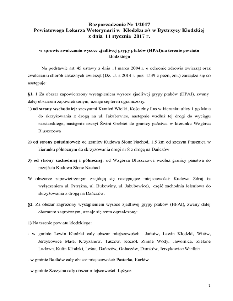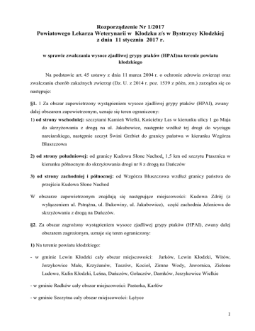 Rozporządzenie Nr 1/2017 Powiatowego Lekarza Weterynarii w Kłodzku z/s w Bystrzycy Kłodzkiej z dnia 11 stycznia 2017 r. w sprawie zwalczania wysoce zjadliwej grypy ptaków (HPAI)na terenie powiatu kłodzkiego Na podstawie art. 45 ustawy z dnia 11 marca 2004 r. o ochronie zdrowia zwierząt oraz zwalczaniu chorób zakaźnych zwierząt (Dz. U. z 2014 r. poz. 1539 z późn, zm.) zarządza się co następuje: §1. 1 Za obszar zapowietrzony wystąpieniem wysoce zjadliwej grypy ptaków (HPAI), zwany dalej obszarem zapowietrzonym, uznaje się teren ograniczony: 1) od strony wschodniej: szczytami Kamień Wielki, Kościelny Las w kierunku ulicy 1 go Maja do skrzyżowania z drogą na ul. Jakubowice, następnie wzdłuż tej drogi do wyciągu narciarskiego, następnie szczyt Świni Grzbiet do granicy państwa w kierunku Wzgórza Bluszczowa 2) od strony południowej: od granicy Kudowa Słone Nachod, 1,5 km od szczytu Ptasznica w kierunku północnym do skrzyżowania drogi nr 8 z drogą na Dańczów 3) od strony zachodniej i północnej: od Wzgórza Bluszczowa wzdłuż granicy państwa do przejścia Kudowa Słone Nachod W obszarze zapowietrzonym znajdują się następujące miejscowości: Kudowa Zdrój (z wyłączeniem ul. Pstrążna, ul. Bukowiny, ul. Jakubowice), część zachodnia Jeleniowa do skrzyżowania z drogą na Dańczów. §2. Za obszar zagrożony wystąpieniem wysoce zjadliwej grypy ptaków (HPAI), zwany dalej obszarem zagrożonym, uznaje się teren ograniczony: 1) Na terenie powiatu kłodzkiego: - w gminie Lewin Kłodzki cały obszar miejscowości: Jarków, Lewin Kłodzki, Witów, Jerzykowice Małe, Krzyżanów, Taszów, Kocioł, Zimne Wody, Jawornica, Zielone Ludowe, Kulin Kłodzki, Leśna, Dańczów, Gołaczów, Darnków, Jerzykowice Wielkie - w gminie Radków cały obszar miejscowości: Pasterka, Karłów - w gminie Szczytna cały obszar miejscowości: Łężyce 1 - Miasto Kudowa Zdrój z wyłączeniem części należącej do obszaru zapowietrzonego; § 3. 1. W obszarze zapowietrzonym o którym mowa w §1 nakazuje się: 1) Niezwłoczne czyszczenie i odkażanie środków transportu wykorzystywanego do transportu drobiu lub innych ptaków, ich mięsa, paszy, ściółki lub nawozów naturalnych, innych środków transportu wjeżdżających do gospodarstwa lub z niego wyjeżdżających oraz innych przedmiotów lub substancji, które mogły zostać skażone wirusem wysoce zjadliwej grypy ptaków; 2) Oczyszczanie, odkażanie, deratyzację i dezynsekcję miejsc przebywania drobiu i innych ptaków utrzymywanych w obrębie gospodarstwa 2. W obszarze zapowietrzonym o którym mowa w §1 zakazuje się: 1) przemieszczania do i z gospodarstwa drobiu lub innych ptaków oraz ssaków utrzymywanych w gospodarstwach bez zgody właściwego miejscowo powiatowego lekarza weterynarii; 2) wywożenia lub rozrzucania ściółki lub nawozów naturalnych; 3) organizowania lotów treningowych i lotów konkursowych gołębi; 4) organizowania polowań i odłowów ptactwa dzikiego; 5) przemieszczania i transportu drobiu lub innych ptaków, w tym piskląt jednodniowych, drobiu odchowanego do rozpoczęcia nieśności, a także ich zwłok i jaj z gospodarstw znajdujących się na obszarze zapowietrzonym bez zgody właściwego miejscowo powiatowego lekarza weterynarii; 6) transportu mięsa drobiowego z rzeźni, zakładów rozbioru oraz chłodni bez zgody właściwego miejscowo powiatowego lekarza weterynarii; 7) targowiskowej sprzedaży mięsa drobiowego, mięsa ptaków łownych oraz jaj konsumpcyjnych i wylęgowych; 8) wypuszczania drobiu lub innych ptaków w celu odtworzenia zasobów ptactwa łownego bez zgody właściwego miejscowo powiatowego lekarza weterynarii § 4. 1 W obszarze zagrożonym o którym mowa w § 2 nakazuje się niezwłoczne czyszczenie i odkażanie środków transportu i sprzętu wykorzystywanego do transportu drobiu lub innych ptaków, ich mięsa, paszy, ściółki lub nawozów naturalnych oraz innych przedmiotów lub substancji, które mogły zostać skażone wirusem wysoce zjadliwej grypy ptaków. 2. W obszarze zagrożonym, o którym mowa w § 2 zakazuje się: 1) przemieszczania do gospodarstwa drobiu lub innych ptaków oraz ssaków utrzymywanych w gospodarstwach bez zgody właściwego miejscowo powiatowego lekarza weterynarii; 2 2) wywożenia lub rozrzucania ściółki lub nawozów naturalnych; 3) organizowania lotów treningowych i lotów konkursowych gołębi; 4) organizowania polowań i odłowów ptactwa dzikiego bez zgody właściwego miejscowo powiatowego lekarza weterynarii ; 5) przemieszczania i transportu drobiu lub innych ptaków, w tym piskląt jednodniowych, drobiu odchowanego do rozpoczęcia nieśności, a także ich zwłok i jaj z gospodarstw znajdujących się na obszarze zagrożonym bez zgody właściwego miejscowo powiatowego lekarza weterynarii; 6) transportu mięsa drobiowego z rzeźni, zakładów rozbioru oraz chłodni bez zgody właściwego miejscowo powiatowego lekarza weterynarii; 7) targowiskowej sprzedaży mięsa drobiowego, mięsa ptaków łownych oraz jaj konsumpcyjnych i wylęgowych; 8) wypuszczania drobiu lub innych ptaków w celu odtworzenia zasobów ptactwa łownego bez zgody właściwego miejscowo powiatowego lekarza weterynarii; 9) przemieszczania drobiu, w tym drobiu odchowanego do rozpoczęcia nieśności i piskląt jednodniowych oraz jaj na obszarze zagrożonym bez zgody właściwego miejscowo powiatowego lekarza weterynarii; 10) przemieszczania drobiu, w tym drobiu odchowanego do rozpoczęcia nieśności i piskląt jednodniowych oraz jaj do gospodarstw, rzeźni, zakładów pakowania jaj, zakładów wytwarzających lub przetwarzających produkty jajeczne znajdujących się poza obszarem zagrożonym bez zgody właściwego miejscowo powiatowego lekarza weterynarii. § 5.1. Nakazuje się oznakowanie obszaru zapowietrzonego i zagrożonego, o których mowa w § 1 i § 2, poprzez ustawienie następującej na zewnętrznej granicy tych obszarów tablic ostrzegawczych 
