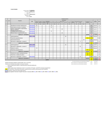 PLAN STUDIÓW kierunek studiów: profil studiów: stopień: forma studiów: specjalności: od roku: Logistyka praktyczny 2 stacjonarne 2 2013 Szczegóły przedmiotu rok liczba godzin Przedmiot semestr KOD wykłady kursowe wykłady gościnne W WG ćwiczenia wykłady konwersat ćwiczenia monograf. oryjne WM CK CA warsztaty symulacja laboratoriu m lektoraty praktyki zajęcia terenowe seminaria lic. seminaria mag. wf WR SY LI L PR T SL SM WF przedmiot do wyboru Razem Forma zaliczenia ECTS 6 1 Zarządzanie procesami logistycznymi 0800-LZPZAK 26 16 42 zaliczenie 1 Doskonalenie procesów i produktów 0800-LDPZAK 17 16 33 zaliczenie 5 0800-LSWZAK 8 37 egzamin 7 0800-LZLZAK 17 33 zaliczenie 5 0800-LMAZAK 8 37 zaliczenie 7 godzin: 182 p. ECTS: 30 50 zaliczenie 170 170 1 1 1 Systemy wspomagania i optymalizacji decyzji w logistyce Zarządzanie personelem w przedsiębiorstwach logistycznych Metody analizy i prognozowanie rynku I 29 16 29 razem po 1. semestrze : 2 Lektorat językowy ^ 2 Przedmioty specjalnościowe 2 Wychowanie fizyczne 2 Seminarium magisterskie - semestr 2 50 0-800-_ _1ZAK 30 razem po 2. semestrze : Lektorat językowy ^ 0-800-_ _2ZAK 3 Seminarium magisterskie - semestr 3 0800-LS1ZAK 3 Wykład do wyboru 3 Przedmioty specjalnościowe 4 Przedmiot do wyboru (specjalnosciowy) 4 Przedmioty / wykłady do wyboru 4 Seminarium magisterskie - semestr 4 25 25 12 razem po 3. semestrze : razem po 4. semestrze : 252 1 p. ECTS: 31 25 egzamin 3 zaliczenie 8 12 zaliczenie 97 godzin: 159 55 55 55 55 25 godzin: godzin: 0 25 97 25 0800-LS2ZAK zaliczenie 2 godzin: 3 II 30 2 p. ECTS: 9 egzamin 12 135 p. ECTS: 30 728 p. ECTS: 122 w dniu 2012-04-02 w dniu 2013-01-14 Studenci na 2 semestrze biorą udział w seminarium zerowym Zmiany zatwierdzone przez Rade Wydziału Zarządzania w dniu 2013-07-12 kolumny organizowane zgodnie z zapotrzebowaniem jednostki dydaktycznej ** opcjonalnie ^ wykład w języku obcym realizowany na sem 2 i 3 w wymiarze 15/15 godz - 6 pkt ECTS, kończący się egzaminem ## Dane szacowane. Rzeczywista liczba godzin uzależniona jest od wyborów dokonywanych przez studentów. Przedmioty, z których nie można wziąć warunku Język angielski /niemiecki /rosyjski /francuski w biznesie (0800-JA_ZAK / 0800-JN_ZAK / 0800-JR_ZAK / 0800-JF_ZAK) 31 9 Zmiany zatwierdzone przez Rade Wydziału Zarządzania * 3 17 Studenta obowiązuje dodatkowo szkolenie BHP i ppoż. (e-learning) Plan studiów zatwierdzony przez Rade Wydziału Zarządzania 4 26
