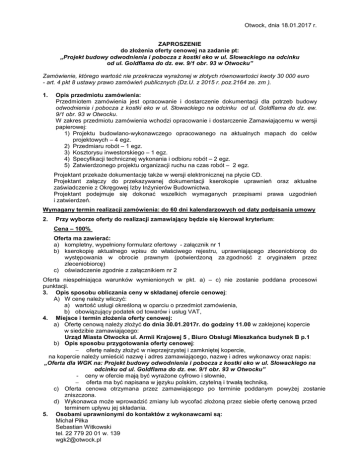 Otwock, dnia 18.01.2017 r. ZAPROSZENIE do złożenia oferty cenowej na zadanie pt: „Projekt budowy odwodnienia i pobocza z kostki eko w ul. Słowackiego na odcinku od ul. Goldflama do dz. ew. 9/1 obr. 93 w Otwocku” Zamówienie, którego wartość nie przekracza wyrażonej w złotych równowartości kwoty 30 000 euro - art. 4 pkt 8 ustawy prawo zamówień publicznych (Dz.U. z 2015 r. poz.2164 ze. zm ). 1. Opis przedmiotu zamówienia: Przedmiotem zamówienia jest opracowanie i dostarczenie dokumentacji dla potrzeb budowy odwodnienia i pobocza z kostki eko w ul. Słowackiego na odcinku od ul. Goldflama do dz. ew. 9/1 obr. 93 w Otwocku. W zakres przedmiotu zamówienia wchodzi opracowanie i dostarczenie Zamawiającemu w wersji papierowej: 1) Projektu budowlano-wykonawczego opracowanego na aktualnych mapach do celów projektowych – 4 egz. 2) Przedmiaru robót – 1 egz. 3) Kosztorysu inwestorskiego – 1 egz. 4) Specyfikacji technicznej wykonania i odbioru robót – 2 egz. 5) Zatwierdzonego projektu organizacji ruchu na czas robót – 2 egz. Projektant przekaże dokumentację także w wersji elektronicznej na płycie CD. Projektant załączy do przekazywanej dokumentacji kserokopie uprawnień oraz aktualne zaświadczenie z Okręgowej Izby Inżynierów Budownictwa. Projektant podejmuje się dokonać wszelkich wymaganych przepisami prawa uzgodnień i zatwierdzeń. Wymagany termin realizacji zamówienia: do 60 dni kalendarzowych od daty podpisania umowy 2. Przy wyborze oferty do realizacji zamawiający będzie się kierował kryterium: Cena – 100% Oferta ma zawierać: a) kompletny, wypełniony formularz ofertowy - załącznik nr 1 b) kserokopię aktualnego wpisu do właściwego rejestru, uprawniającego zleceniobiorcę do występowania w obrocie prawnym (potwierdzoną za zgodność z oryginałem przez zleceniobiorcę) c) oświadczenie zgodnie z załącznikiem nr 2 Oferta niespełniająca warunków wymienionych w pkt. a) – c) nie zostanie poddana procesowi punktacji. 3. Opis sposobu obliczania ceny w składanej ofercie cenowej: A) W cenę należy wliczyć: a) wartość usługi określoną w oparciu o przedmiot zamówienia, b) obowiązujący podatek od towarów i usług VAT, 4. Miejsce i termin złożenia oferty cenowej: a) Ofertę cenową należy złożyć do dnia 30.01.2017r. do godziny 11.00 w zaklejonej kopercie w siedzibie zamawiającego: Urząd Miasta Otwocka ul. Armii Krajowej 5 , Biuro Obsługi Mieszkańca budynek B p.1 b) Opis sposobu przygotowania oferty cenowej: ofertę należy złożyć w nieprzejrzystej i zamkniętej kopercie, na kopercie należy umieścić nazwę i adres zamawiającego, nazwę i adres wykonawcy oraz napis: „Oferta dla WGK na: Projekt budowy odwodnienia i pobocza z kostki eko w ul. Słowackiego na odcinku od ul. Goldflama do dz. ew. 9/1 obr. 93 w Otwocku” - ceny w ofercie mają być wyrażone cyfrowo i słownie, oferta ma być napisana w języku polskim, czytelną i trwałą techniką. c) Oferta cenowa otrzymana przez zamawiającego po terminie poddanym powyżej zostanie zniszczona. d) Wykonawca może wprowadzić zmiany lub wycofać złożoną przez siebie ofertę cenową przed terminem upływu jej składania. 5. Osobami uprawnionymi do kontaktów z wykonawcami są: Michał Piłka Sebastian Witkowski tel. 22 779 20 01 w. 139 [email protected] Załącznik nr 1 ...................................., dnia……….……r. Zamawiający: Gmina Otwock, którą reprezentuje Prezydent Miasta Otwocka, ul. Armii Krajowej 5, 05-400 Otwock, tel. 22 779 20 01 Wykonawca / zarejestrowana nazwa/ imię i nazwisko: ......................................................................................... .............................................................................................. adres Wykonawcy: ulica ....................................... nr domu ..... kod ..................... miejscowość ........................................................... powiat ................................. województwo ........................................ tel.: ..................................... fax: ................................. REGON:................................ NIP: ................................ OFERTA CENOWA Odpowiadając na zaproszenie do złożenia oferty cenowej w ramach zadania pn.: „Projekt budowy odwodnienia i pobocza z kostki eko w ul. Słowackiego na odcinku od ul. Goldflama do dz. ew. 9/1 obr. 93 w Otwocku” Oferuję wykonanie przedmiotu zamówienia, zgodnie z wymogami opisu przedmiotu zamówienia za kwotę w wysokości: netto:…..……..….…...zł (słownie……………………………..……………….……………………….…………...…………………) podatek VAT……% tj: ….…………zł. (słownie:…………………………........…………………………) brutto: ………………..zł. (słownie:……………………………………………………………………………………………………..) ............................................. (pieczęć i podpis Wykonawcy) 2 Załącznik nr 2 ...................................., dnia……………r. Zamawiający: Gmina Otwock, którą reprezentuje Prezydent Miasta Otwocka, ul. Armii Krajowej 5, 05-400 Otwock, tel. 22 779 20 01 Wykonawca / zarejestrowana nazwa/ imię i nazwisko: ......................................................................................... .............................................................................................. adres Wykonawcy: ulica ....................................... nr domu ..... kod ..................... miejscowość ........................................................... powiat ................................. województwo ........................................ tel.: ..................................... fax: ................................. REGON:................................ NIP: ................................ Dot. „Projekt budowy odwodnienia i p