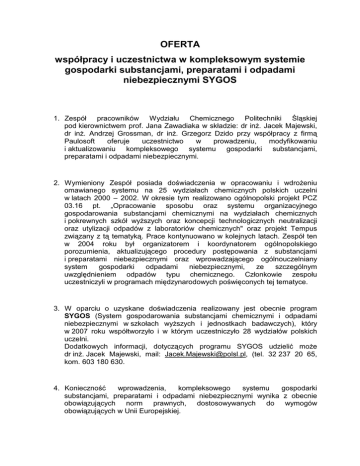OFERTA współpracy i uczestnictwa w kompleksowym systemie gospodarki substancjami, preparatami i odpadami niebezpiecznymi SYGOS 1. Zespół pracowników Wydziału Chemicznego Politechniki Śląskiej pod kierownictwem prof. Jana Zawadiaka w składzie: dr inż. Jacek Majewski, dr inż. Andrzej Grossman, dr inż. Grzegorz Dzido przy współpracy z firmą Paulosoft oferuje uczestnictwo w prowadzeniu, modyfikowaniu i aktualizowaniu kompleksowego systemu gospodarki substancjami, preparatami i odpadami niebezpiecznymi. 2. Wymieniony Zespół posiada doświadczenia w opracowaniu i wdrożeniu omawianego systemu na 25 wydziałach chemicznych polskich uczelni w latach 2000 – 2002. W okresie tym realizowano ogólnopolski projekt PCZ 03.16 pt. „Opracowanie sposobu oraz systemu organizacyjnego gospodarowania substancjami chemicznymi na wydziałach chemicznych i pokrewnych szkół wyższych oraz koncepcji technologicznych neutralizacji oraz utylizacji odpadów z laboratoriów chemicznych" oraz projekt Tempus związany z tą tematyką. Prace kontynuowano w kolejnych latach. Zespół ten w 2004 roku był organizatorem i koordynatorem ogólnopolskiego porozumienia, aktualizującego procedury postępowania z substancjami i preparatami niebezpiecznymi oraz wprowadzającego ogólnouczelniany system gospodarki odpadami niebezpiecznymi, ze szczególnym uwzględnieniem odpadów typu chemicznego. Członkowie zespołu uczestniczyli w programach międzynarodowych poświęconych tej tematyce. 3. W oparciu o uzyskane doświadczenia realizowany jest obecnie program SYGOS (System gospodarowania substancjami chemicznymi i odpadami niebezpiecznymi w szkołach wyższych i jednostkach badawczych), który w 2007 roku współtworzyło i w którym uczestniczyło 28 wydziałów polskich uczelni. Dodatkowych informacji, dotyczących programu SYGOS udzielić może dr inż. Jacek Majewski, mail: [email protected], (tel. 32 237 20 65, kom. 603 180 630. 4. Konieczność wprowadzenia, kompleksowego systemu gospodarki substancjami, preparatami i odpadami niebezpiecznymi wynika z obecnie obowiązujących norm prawnych, dostosowywanych do wymogów obowiązujących w Unii Europejskiej. W skład pakietu składającego się na program SYGOS następujące elementy: komputerowy system iChem2 (uaktualnienie systemu iChem) w skład którego wchodzi: baza gospodarki magazynowej dla chemikaliów, umożliwiająca prowadzanie ewidencji magazynowanych odczynników na poziomie uczelni i jednostek wewnętrznych wydziałów, baza danych odnośnie zbędnych odczynników, przeznaczonych do likwidacji lub wymiany, baza danych właściwości odczynników (ok. 10 000 pozycji) z możliwością rozszerzania i uzupełniania w zależności od potrzeb użytkownika, zaktualizowana baza kart charakterystyki chemicznych w oparciu o dane firmy Merck i POCh, substancji komputerowy program znakowania (etykietowania) substancji i preparatów chemicznych Etchem3 (nieodpłatnie 3 licencje), zgodny z aktualnymi normami prawnymi, zestaw materiałów multimedialnych przydatnych do przeprowadzania obowiązkowych szkoleń dla studentów i pracowników podejmujących zajęcia w laboratoriach chemicznych, kompleksowy zestaw procedur gospodarki substancjami, preparatami i odpadami niebezpiecznymi oraz pełne doradztwo w organizacji systemu w skali uczelni, zestaw instrukcji i regulaminów, schemat organizacyjny służby prowadzącej gospodarkę substancjami, preparatami i odpadami niebezpiecznymi, z ustaleniem zakresu obowiązku i struktury organizacyjnej, przeprowadzenie szkoleń administratorów i osób obsługujących systemy komputerowe i prowadzących gospodarkę magazynową, pomoc w doborze firm selektywnie likwidujących dane rodzaje odpadów niebezpiecznych, przekazanie doświadczeń w pozyskiwaniu funduszy na omawiane cele, zapewnienie uczestnictwa przedstawicielom jednostek biorącym udział w programie, w Ogólnopolskim seminarium SYGOS VII organizowanym w w terminie 07 – 09 maja 2009 roku (jedna osoba z danej jednostki nieodpłatnie, pozostałe osoby po kosztach własnych ok. 400 zł/osoba). Ostatnie Seminarium - SYGOS VI odbyło się w grudniu 2007r. Materiały SYGOS VI dostępne są na stronie internetowej: http://www.chemia.polsl.pl/sygos/. pełny dostęp do strony internetowej SYGOS, prowadzonej na serwerze Wydziału Chemicznego Politechniki Śląskiej, w tym do materiałów i instrukcji zakodowanych hasłem. 5. Szczegółowe materiały programu SYGOS znajdują się na stronie internetowej prowadzonej w ramach tego programu: http://www.chemia.polsl.pl/sygos/ Dostęp do danych zawartych na stronie zabezpieczony jest hasłem, które brzmi w 2009 roku: sygos. 6. Baza danych substancji chemicznych iChem dostępna jest pod adresem: https://ichem.chemia.polsl.pl/ Istnieje możliwość prowadzenia gospodarki magazynowej dla substancji chemicznych w centralnym serwerze iChem lub w oddzielnym serwerze danej jednostce. Dostęp do bazy danych jest zabezpieczony szyfrowanym złączem i możliwy tylko dla upoważnionych osób. 7. Opłata roczna za uczestnictwo w programie SYGOS, w tym za kompletny zestaw procedur i systemów i programów komputerowych, omówionych w punkcie 5 wynosi wynosi 2000 zł na rok. Prof. dr hab. inż. Jan Zawadiak (pieczątka wydziału) Pan Profesor Jan Zawadiak Katedra Technologii Chemicznej Organicznej i Petrochemii Wydział Chemiczny Politechniki Śląskiej ul. B. Krzywoustego 4 44-100 Gliwice Deklaruję uczestnictwo w programie SYGOS, przedstawionym w załączonej ofercie, zapewniającym stały dostęp, bieżącą konserwację, i aktualizację komputerowych systemów iChem2 i Etchem2. Za wymienione czynności deklaruję zapłatę w wysokości 2.000 zł., która zostanie uiszczona po otrzymaniu faktury VAT, wystawionej przez Politechnikę Śląską. Przekazuję dane do wystawienia faktury: Odbiorca............................................................................................................................ Adres.............