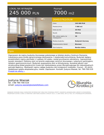 LOKAL NA WYNAJEM 245 000 Poznań PLN 7000 m2 2640/3762/OLW Cena 245 000 PLN Powierzchnia 7 000 m2 Cena za m2 35 PLN Rynek Wtórny Min. okres najmu (w miesiącach) 36 Rodzaj budynku Budynek biurowy Przeznaczenie (lokal) Biurowe Stan budynku Bardzo dobry Opis Zapraszam do najmu budynku biurowego położonego w bliskiej okolicy Centrum Poznania. Lokalizacja poza strefą ograniczonego parkowania, z doskonałą komunikacją. Budynek będący przedmiotem najmu pochodzi z I połowy XX wieku, został gruntownie odnowiony, reprezentuje wysoki standard. Położony jest na terenie większego centrum biurowego z własnymi parkingami, lokalem gastronomicznym. Budynek wyposażony jest w klimatyzację, wysokiej jakości sieć strukturalną.Układ powierzchni może być dostosowany przez Wynajmującego do indywidualnych potrzeb Najemcy. Możliwość najmu całego budynku lub mniejszych modułów. Czynsz - 35 zł/m2, dodatkowo opłata eksploatacyjna, media. Zapraszam. Kontakt: Justyna Wasiak, tel. 790-700-519 Przejdź do oferty » Justyna Wasiak tel. +48 790 700 519 email: [email protected] NINIEJSZE WARUNKI MAJĄ CHARAKTER INFORMACYJNY ORAZ NIE STANOWIĄ OFERTY ZAWARCIA JAKIEJKOLWIEK UMOWY W ROZUMIENIU PRZEPISÓW USTAW Z DNIA 23 KWIETNIA 1964 ROKU KODEKS CYWILNY (DZ.U. Z 1964 ROKU, NR 16, POZ. 93 Z PÓŹNIEJSZYMI ZMIANAMI. Powered by TCPDF (www.tcpdf.org)