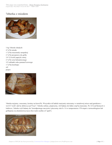 This page was exported from - Moje Przepisy Kulinarne Export date: Wed Mar 8 18:25:56 2017 / +0000 GMT ?eberka z miodem 1 kg ?eberek chudych 4 ?y?ki miodu 1 ?y?ka musztardy sarepskiej 2 ?y?ki przyprawy do grilla 1/4 ?y?eczki papryki ostrej 2 ?y?ki octu balsamicznego 1/2 szklanki soku pomara?czowego 1 ?y?ka ketchupu sól pieprz ?eberka myjemy, osuszamy, kroimy na kawa?ki. Wszystkie sk?adniki marynaty mieszamy w metalowej misce nad garnkiem z wrz?c? wod?, tak by dobrze je po??czy?. ?eberka solimy, pieprzymy, wk?adamy do lekko ciep?ej marynaty. Po 12 h sp?dzonych w lodówce, ?eberka wyk?adamy do ?aroodpornego naczynia i pieczemy oko?o 1 h w temperaturze 170 stopni z termoobiegiem lub grillujemy na aluminiowej tacce (bez tacki szybko si? spal?). Output as PDF file has been powered by [ Universal Post Manager ] plugin from www.ProfProjects.com | Page 1/1 |