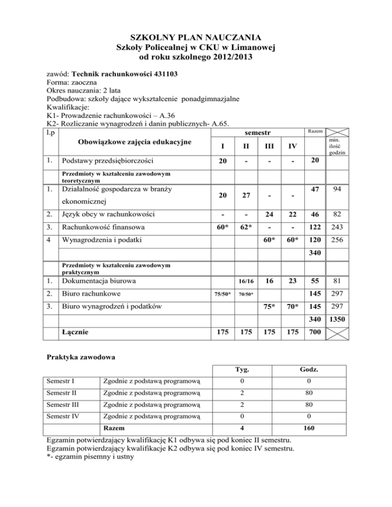 SZKOLNY PLAN NAUCZANIA Szkoły Policealnej w CKU w Limanowej od roku szkolnego 2012/2013 zawód: Technik rachunkowości 431103 Forma: zaoczna Okres nauczania: 2 lata Podbudowa: szkoły dające wykształcenie ponadgimnazjalne Kwalifikacje: K1- Prowadzenie rachunkowości – A.36 K2- Rozliczanie wynagrodzeń i danin publicznych- A.65. l.p semestr Obowiązkowe zajęcia edukacyjne I II III 1. Podstawy przedsiębiorczości Razem min. ilość godzin IV 20 - - - 20 27 - - - - 24 60* 62* 20 Przedmioty w kształceniu zawodowym teoretycznym 1. Działalność gospodarcza w branży ekonomicznej 2. Język obcy w rachunkowości 3. Rachunkowość finansowa 4 Wynagrodzenia i podatki 47 94 22 46 82 - - 122 243 60* 60* 120 256 340 Przedmioty w kształceniu zawodowym praktycznym 1. Dokumentacja biurowa 2. Biuro rachunkowe 3. Biuro wynagrodzeń i podatków Łącznie 16/16 75/50* 16 70/50* 75* 175 175 175 55 81 145 297 145 297 340 1350 23 70* 175 700 Praktyka zawodowa Tyg. Godz. Semestr I Zgodnie z podstawą programową 0 0 Semestr II Zgodnie z podstawą programową 2 80 Semestr III Zgodnie z podstawą programową 2 80 Semestr IV Zgodnie z podstawą programową 0 0 Razem 4 160 Egzamin potwierdzający kwalifikację K1 odbywa się pod koniec II semestru. Egzamin potwierdzający kwalifikacje K2 odbywa się pod koniec IV semestru. *- egzamin pisemny i ustny