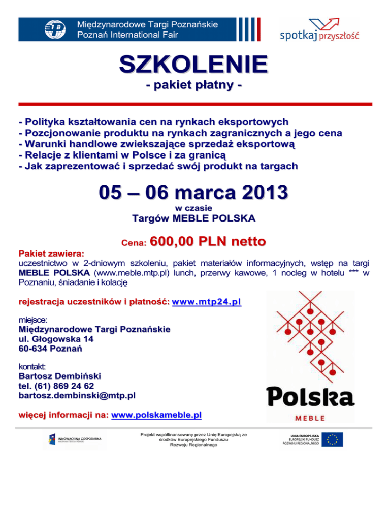 SZKOLENIE - pakiet płatny - Polityka kształtowania cen na rynkach eksportow ych - Pozcjonowanie produktu na rynkach zagranicznych a jego cena - Warunki handlowe zwiekszające sprzedaŜ eksportową - Relacje z klientami w Polsce i za granicą - Jak zaprezentować i sprzedać swój produkt na targach 05 – 06 marca 2013 w czasie Targów MEBLE POLSKA Cena: 6 0 0 , 0 0 PL N n e t t o Pakiet zawiera: uczestnictwo w 2-dniowym szkoleniu, pakiet materiałów informacyjnych, wstęp na targi MEBLE POLSKA (www.meble.mtp.pl) lunch, przerwy kawowe, 1 nocleg w hotelu *** w Poznaniu, śniadanie i kolację rejestracja uczestników i płatność: w w w . m t p 2 4 . p l miejsce: Międzynarodowe Targi Poznańskie ul. Głogowska 14 60-634 Poznań kontakt: Bartosz Dembiński tel. (61) 869 24 62 [email protected] więcej informacji na: www.polskameble.pl Projekt współfinansowany przez Unię Europejską ze środków Europejskiego Funduszu Rozwoju Regionalnego