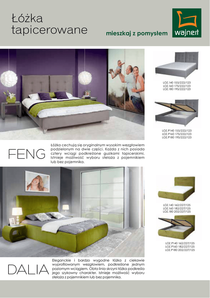 Łóżka tapicerowane mieszkaj z pomysłem LOZ.140 155/222/123 LOZ.160 175/222/123 LOZ.180 195/222/123 LOZ.P140 155/222/123 LOZ.P160 175/222/123 LOZ.P180 195/222/123 FENG Łóżka cechują się oryginalnym wysokim wezgłowiem podzielonym na dwie części. Każda z nich posiada cztery wciągi podkreślone guzikami tapicerskimi. Istnieje możliwość wyboru stelaża z pojemnikiem lub bez pojemnika. LOZ.140 162/227/125 LOZ.160 182/227/125 LOZ.180 202/227/125 LOZ.P140 162/227/125 LOZ.P160 182/227/125 LOZ.P180 202/227/125 DALIA Eleganckie i bardzo wygodne łóżka z ciekawie wyprofilowanym wezgłowiem, podkreślone jednym poziomym wciągiem. Obła linia skrzyni łóżka podkreśla jego szykowny charakter. Istnieje możliwość wyboru stelaża z pojemnikiem lub bez pojemnika. LOZ.140BM 163/224/98 LOZ.160BM 183/224/98 LOZ.180BM 203/224/98 LOZ.P140BM 163/224/98 LOZ.P160BM 183/224/98 LOZ.P180BM 203/224/98 KIER Łóżko tapicerowane z prostym zagłowiem, ozdobionym dyskretnym przeszyciem, przypadnie do gustu miłośnikom minimalistycznego stylu. Łóżko dostępne jest w wersji z pojemnikiem i bez pojemnika. LOZ.140BM 160/214/98 LOZ.160BM 180/214/98 LOZ.180BM 200/214/98 LOZ.P140BM 160/214/98 LOZ.P160BM 180/214/98 LOZ.P180BM 200/214/98 TREFL Efektowne łóżko tapicerowane TREFL z miękkim, pikowanym zagłowiem dostępne jest w wersji z pojemnikiem i bez pojemnika. LOZ.140BM 160/214/98 LOZ.160BM 180/214/98 LOZ.180BM 200/214/98 LOZ.P140BM 160/214/98 LOZ.P160BM 180/214/98 LOZ.P180BM 200/214/98 PIK Łóżko tapicerowane PIK dostępne jest w wersji z pojemnikiem i bez pojemnika. Charakterystyczne, kontrastowe przeszycie na ramie wokół zagłowia podkreśla nowoczesny styl mebla. LOZ.140BM 160/214/98 LOZ.160BM 180/214/98 LOZ.180BM 200/214/98 LOZ.P140BM 160/214/98 LOZ.P160BM 180/214/98 LOZ.P180BM 200/214/98 KARO Nowoczesne łóżko tapicerowane KARO z klasycznym pikowaniem w romby doda uroku każdej sypialni. Łóżko dostępne jest w wersji z pojemnikiem i bez pojemnika Stoliki tapicerowane NOTE STN.C 51/42/42 STN.B 51/42/42 Prosta forma oraz geometryczny kształt przypadną do gustu wszystkim, którzy lubią nowoczesne wnętrza. Blat stolika wykończony jest malowanym szkłem w kolorze – do wyboru: czarnym lub białym. Stolik NOTE jest doskonałym dodatkiem do łóżek tapicerowanych, będących w ofercie WAJNERT MEBLE. HOP STN.C 51/42/40 STN.B 51/42/40 Obły kształt stolika HOP idealnie wpisuje się we wnętrza w stylu glamour. Jego blat wykończony jest malowanym szkłem w kolorze – do wyboru: czarnym lub białym. Stolik HOP jest doskonałym dodatkiem do łóżek tapicerowanych, będących w ofercie WAJNERT MEBLE. WAJNERT MEBLE sp. z o.o. S.K.A., PL 56-513 Międzybórz, ul. Kolejowa 67 nr tel: +48 62/ 78 69 710, fax: +48 62/ 78 69 720, e-mail: [email protected] Producent zastrzega sobie prawo do wprowadzenia zmian kolorystycznych, wzornictwa, wymiarów i funkcji prezentowanych produktów. Kolory na zdjęciach mogą różnić się od rzeczywistych. Z uwagi na technologię produkcji, na płycie laminowanej oklejonej folią, mogą być widoczne mikroskopijne zanieczyszczenia, co nie stanowi podstawy do reklamacji. Szczegółowe informacje o meblach zawarte są w kartach produktów. Sprzedawca jest zobowiązany do przekazania dokładnych informacji o meblach. Meble systemowe sprzedawane są w paczkach do samodzielnego montażu. Prezentowane w niniejszym katalogu informacje nie stanowią oferty handlowej w rozumieniu Kodeksu Cywilnego. Wzory prawnie chronione. Produkcja, oferowanie lub sprzedaż mebli o wyglądzie identycznym bądź podobnym do mebli prezentowanych w katalogu bez zgody uprawnionego podlega odpowiedzialności cywilnej i karnej, określonej we właściwych przepisach. Wymiary podane są w cm, w kolejności: szerokość/głębokość/wysokość. www.wajnert.pl