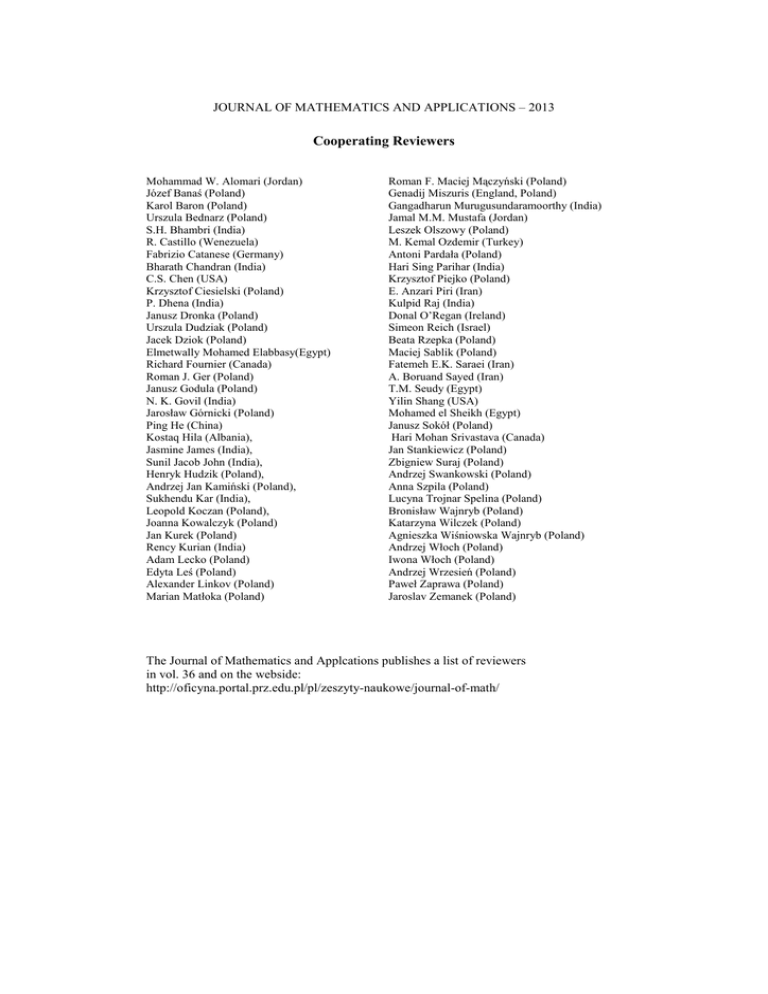 JOURNAL OF MATHEMATICS AND APPLICATIONS – 2013 Cooperating Reviewers Mohammad W. Alomari (Jordan) Józef Banaś (Poland) Karol Baron (Poland) Urszula Bednarz (Poland) S.H. Bhambri (India) R. Castillo (Wenezuela) Fabrizio Catanese (Germany) Bharath Chandran (India) C.S. Chen (USA) Krzysztof Ciesielski (Poland) P. Dhena (India) Janusz Dronka (Poland) Urszula Dudziak (Poland) Jacek Dziok (Poland) Elmetwally Mohamed Elabbasy(Egypt) Richard Fournier (Canada) Roman J. Ger (Poland) Janusz Godula (Poland) N. K. Govil (India) Jarosław Górnicki (Poland) Ping He (China) Kostaq Hila (Albania), Jasmine James (India), Sunil Jacob John (India), Henryk Hudzik (Poland), Andrzej Jan Kamiński (Poland), Sukhendu Kar (India), Leopold Koczan (Poland), Joanna Kowalczyk (Poland) Jan Kurek (Poland) Rency Kurian (India) Adam Lecko (Poland) Edyta Leś (Poland) Alexander Linkov (Poland) Marian Matłoka (Poland) Roman F. Maciej Mączyński (Poland) Genadij Miszuris (England, Poland) Gangadharun Murugusundaramoorthy (India) Jamal M.M. Mustafa (Jordan) Leszek Olszowy (Poland) M. Kemal Ozdemir (Turkey) Antoni Pardała (Poland) Hari Sing Parihar (India) Krzysztof Piejko (Poland) E. Anzari Piri (Iran) Kulpid Raj (India) Donal O’Regan (Ireland) Simeon Reich (Israel) Beata Rzepka (Poland) Maciej Sablik (Poland) Fatemeh E.K. Saraei (Iran) A. Boruand Sayed (Iran) T.M. Seudy (Egypt) Yilin Shang (USA) Mohamed el Sheikh (Egypt) Janusz Sokół (Poland) Hari Mohan Srivastava (Canada) Jan Stankiewicz (Poland) Zbigniew Suraj (Poland) Andrzej Swankowski (Poland) Anna Szpila (Poland) Lucyna Trojnar Spelina (Poland) Bronisław Wajnryb (Poland) Katarzyna Wilczek (Poland) Agnieszka Wiśniowska Wajnryb (Poland) Andrzej Włoch (Poland) Iwona Włoch (Poland) Andrzej Wrzesień (Poland) Paweł Zaprawa (Poland) Jaroslav Zemanek (Poland) The Journal of Mathematics and Applcations publishes a list of reviewers in vol. 36 and on the webside: http://oficyna.portal.prz.edu.pl/pl/zeszyty-naukowe/journal-of-math/