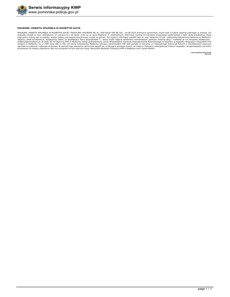 Serwis informacyjny KWP www.pomorska.policja.gov.pl MALBORK: KOBIETA SPŁONĘŁA W ROZBITYM AUCIE. MALBORK: KOBIETA SPŁONĘŁA W ROZBITYM AUCIE. TRAGICZNY WYPADEK NA UL. 500-LECIA (DK NR 55) - 04.06.2015 Kierowca samochodu marki Golf 3 Cabrio spłonął uderzając w drzewo. Do wypadku doszło w dniu dzisiejszym (4 czerwca br.) ok godz. 2:46 na ul. Jana Wejhera. Z nieoficjalnych informacji wynika że kierowca osobowego golfa jechał z dość dużą prędkością. Dwaj mężczyźni, którzy byli w pobliżu, widząc palący się pojazd,natychmiast ruszyli na pomoc. Na miejscu informacji udzielił nam st. asp. Sławomir Prusik - Jednostka Ratowniczo-Gaśnicza w Malborku. Zdjęcia: www.tvmalbork.pl, dziękujemy także za współprace Panu Krzysztofowi F., który zrobił zdjęcia telefonem komórkowym podczas trwania akcji i nadesłał je na skrzynkę redakcyjną : [email protected]. O godz. 02.47 Dyżurny KPP w Malborku został powiadomiony przez Wojewódzkie Centrum Powiadamiania Ratunkowego w Gdańsku o wypadku drogowym. Wypadek miał miejsce w Malborku na ul. 500 lecia (DK nr 55). 40 letnia mieszkanka Malborka kierując samochodem VW Golf jechała w kierunku ul. Głowackiego (kierunek Sztum) z nieustalonych przyczyn zjechała na pobocze i uderzyła w drzewo. W wyniku tego zdarzenia samochód zapalił się, a kierująca poniosła śmierć na miejscu. Policjanci zabezpieczyli miejsce wypadku i przeprowadzili czynności procesowe na miejscu zdarzenia. Nie ma utrudnień na tym odcinku drogi. Naczelnik Wydzialu Prewencji KPP w Malborku kom. Jacek Konkol Data publikacji:2015-06-05 Rzecznik page 1 / 1 Powered by TCPDF (www.tcpdf.org)