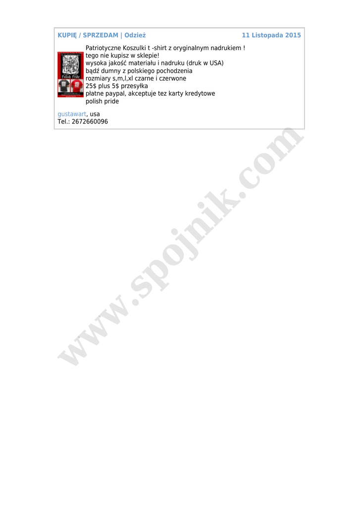 KUPIĘ / SPRZEDAM | Odzież 11 Listopada 2015 Patriotyczne Koszulki t -shirt z oryginalnym nadrukiem ! tego nie kupisz w sklepie! wysoka jakość materiału i nadruku (druk w USA) bądź dumny z polskiego pochodzenia rozmiary s,m,l,xl czarne i czerwone 25$ plus 5$ przesyłka płatne paypal, akceptuje tez karty kredytowe polish pride w w w .s po jn ik .c o m gustawart, usa Tel.: 2672660096