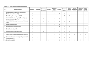 Załącznik nr 2. Wykaz zatrudnienia w jednostkach naukowych L.p. Jednostka naukowa Kierownik Sekretariat Pracownicy Samodzielni 1. Zakład Stomatologii Zachowawczej Przedklinicznej i Endodoncji Przedklinicznej (ZSZ) 1 1 2 Zakład Chirurgii Stomatologicznej (ZCHS) 1 1 3. Katedra i Zakład Radiologii Ogólnej i Stomatologicznej, Zakład Radiologii Zabiegowej (ZR) 2 1 1 4. Katedra i Zakład Stomatologii Zachowawczej i Endodoncji (Szach) 1 1 2 5. Zakład Periodontologii (ZP) 1 1 6. Zakład Stomatologii Dziecięcej (ZSDz) 1 1 7. Zakład Gerostomatologii (ZG) 1 1 8. Zakład Stomatologii Zintegrowanej (Szin) 1 1 9. Katedra i Zakład Protetyki Stomatologicznej PUM (ZProt) 1 1 Samodzielna Pracownia Propedeutyki i Fizykodiagnostyki Stomatologicznej (PiF) 1 1 1 1 10. 11. Zakład Ortodoncji (ZO) Adiunkci Wykładowca/ Średni technicy Doktoranci/ Starszy Asystenci personel dentystyczni/ Rezydenci wykładowca medyczny ortodont. 1 3 4 2 1 6 4 3 1 3 3 8 2 2 3 2 2 Pracownicy naukowotechniczni lekarze (umowa zlecenie) 1 12 7 8 10 5 4 4 2 3 2 1 8 4 1 5 1 9 5 14 1 1 3 1 1 3 2 4 1 4 1 3 1