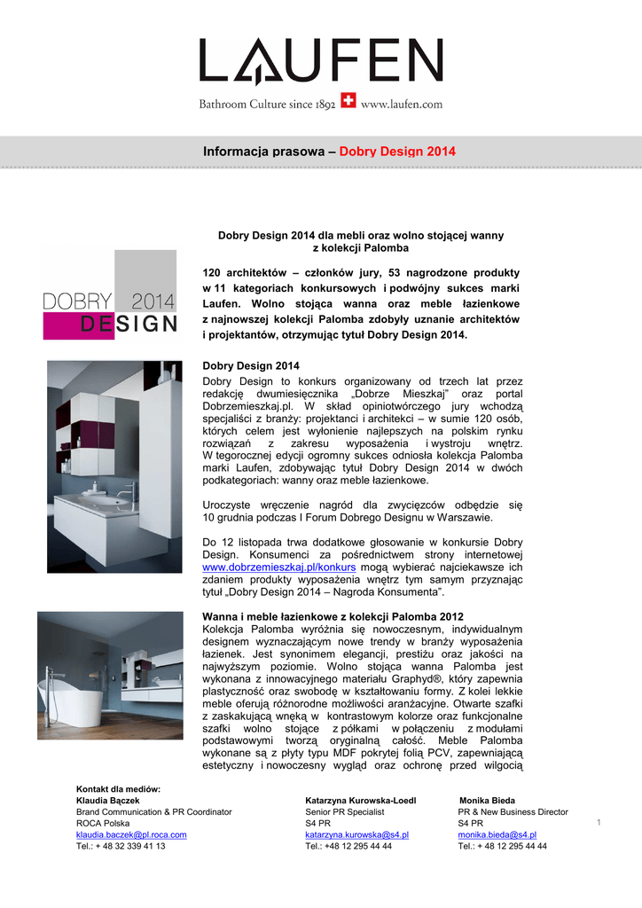 -1- Informacja prasowa – Dobry Design 2014 Dobry Design 2014 dla mebli oraz wolno stojącej wanny z kolekcji Palomba 120 architektów – członków jury, 53 nagrodzone produkty w 11 kategoriach konkursowych i podwójny sukces marki Laufen. Wolno stojąca wanna oraz meble łazienkowe z najnowszej kolekcji Palomba zdobyły uznanie architektów i projektantów, otrzymując tytuł Dobry Design 2014. Dobry Design 2014 Dobry Design to konkurs organizowany od trzech lat przez redakcję dwumiesięcznika „Dobrze Mieszkaj” oraz portal Dobrzemieszkaj.pl. W skład opiniotwórczego jury wchodzą specjaliści z branży: projektanci i architekci – w sumie 120 osób, których celem jest wyłonienie najlepszych na polskim rynku rozwiązań z zakresu wyposażenia i wystroju wnętrz. W tegorocznej edycji ogromny sukces odniosła kolekcja Palomba marki Laufen, zdobywając tytuł Dobry Design 2014 w dwóch podkategoriach: wanny oraz meble łazienkowe. Uroczyste wręczenie nagród dla zwycięzców odbędzie się 10 grudnia podczas I Forum Dobrego Designu w Warszawie. Do 12 listopada trwa dodatkowe głosowanie w konkursie Dobry Design. Konsumenci za pośrednictwem strony internetowej www.dobrzemieszkaj.pl/konkurs mogą wybierać najciekawsze ich zdaniem produkty wyposażenia wnętrz tym samym przyznając tytuł „Dobry Design 2014 – Nagroda Konsumenta”. Wanna i meble łazienkowe z kolekcji Palomba 2012 Kolekcja Palomba wyróżnia się nowoczesnym, indywidualnym designem wyznaczającym nowe trendy w branży wyposażenia łazienek. Jest synonimem elegancji, prestiżu oraz jakości na najwyższym poziomie. Wolno stojąca wanna Palomba jest wykonana z innowacyjnego materiału Graphyd®, który zapewnia plastyczność oraz swobodę w kształtowaniu formy. Z kolei lekkie meble oferują różnorodne możliwości aranżacyjne. Otwarte szafki z zaskakującą wnęką w kontrastowym kolorze oraz funkcjonalne szafki wolno stojące z półkami w połączeniu z modułami podstawowymi tworzą oryginalną całość. Meble Palomba wykonane są z płyty typu MDF pokrytej folią PCV, zapewniającą estetyczny i nowoczesny wygląd oraz ochronę przed wilgocią Kontakt dla mediów: Klaudia Bączek Brand Communication & PR Coordinator ROCA Polska [email protected] Tel.: + 48 32 339 41 13 Katarzyna Kurowska-Loedl Senior PR Specialist S4 PR [email protected] Tel.: +48 12 295 44 44 Monika Bieda PR & New Business Director S4 PR [email protected] Tel.: + 48 12 295 44 44 1 -2- Informacja prasowa – Dobry Design 2014 i promieniami UV. Dodatkowo, szafki są wyposażone w cichodomykające mechanizmy jednego z najbardziej uznanych producentów marki Hettich, a eleganckie szuflady szafek podumywalkowych oferowane są z syfonem pozwalającym na oszczędzanie przestrzeni oraz lepsze wykorzystanie mebli. Komfortowy system montażu 3D ułatwia ustawienie meble w płaszczyźnie poziomej, pionowej oraz odległości od ściany. Kolekcja Palomba 2012 została doceniona również w innych konkursach: If Produkt Design Award 2013, Interior Innovation Award 2013, Best of the Lear Honoree 2012, Wybór Roku 2013 czy Dobry Wzór 2013. Laufen jest jednym ze światowych liderów branży wyposażenia łazienek, słynącym ze znakomitego dizajnu, elegancji i niepowtarzalnego stylu. Firma powstała ponad 100 lat temu w szwajcarskim mieście Laufen i jest obecna w 135 krajach świata. Produkty sygnowane marką Laufen to dzieła najwybitniejszych światowych projektantów, do których należą m.in. Wiel Arets, Stefano Giovanonni, Hartmut Esslinger, Alberto Alessi, Ludovica i Roberto Palomba. Produkty Laufen są przyjazne środowisku, pozwalają na oszczędność wody. W ofercie firmy znajduje się ceramika sanitarna, meble, wanny, kabiny i ścianki natryskowe, baterie, akcesoria łazienkowe oraz seria produktów dla osób starszych i niepełnosprawnych. Produkty marki Laufen stanowią znakomite rozwiązanie zarówno dla Klientów indywidualnych, którzy cenią sobie oryginalną ceramikę łazienkową, jak również dla hoteli i innych miejsc użytku publicznego. Więcej informacji na stronie www.laufen.pl Kontakt dla mediów: Klaudia Bączek Brand Communication & PR Coordinator ROCA Polska [email protected] Tel.: + 48 32 339 41 13 Katarzyna Kurowska-Loedl Senior PR Specialist S4 PR [email protected] Tel.: +48 12 295 44 44 Monika Bieda PR & New Business Director S4 PR [email protected] Tel.: + 48 12 295 44 44 2