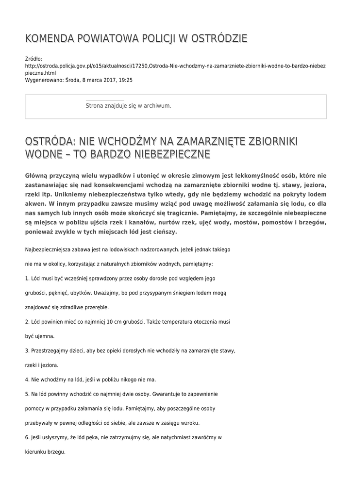 KOMENDA POWIATOWA POLICJI W OSTRÓDZIE Źródło: http://ostroda.policja.gov.pl/o15/aktualnosci/17250,Ostroda-Nie-wchodzmy-na-zamarzniete-zbiorniki-wodne-to-bardzo-niebez pieczne.html Wygenerowano: Środa, 8 marca 2017, 19:25 Strona znajduje się w archiwum. OSTRÓDA: NIE WCHODŹMY NA ZAMARZNIĘTE ZBIORNIKI WODNE – TO BARDZO NIEBEZPIECZNE Główną przyczyną wielu wypadków i utonięć w okresie zimowym jest lekkomyślność osób, które nie zastanawiając się nad konsekwencjami wchodzą na zamarznięte zbiorniki wodne tj. stawy, jeziora, rzeki itp. Unikniemy niebezpieczeństwa tylko wtedy, gdy nie będziemy wchodzić na pokryty lodem akwen. W innym przypadku zawsze musimy wziąć pod uwagę możliwość załamania się lodu, co dla nas samych lub innych osób może skończyć się tragicznie. Pamiętajmy, że szczególnie niebezpieczne są miejsca w pobliżu ujścia rzek i kanałów, nurtów rzek, ujęć wody, mostów, pomostów i brzegów, ponieważ zwykle w tych miejscach lód jest cieńszy. Najbezpieczniejsza zabawa jest na lodowiskach nadzorowanych. Jeżeli jednak takiego nie ma w okolicy, korzystając z naturalnych zbiorników wodnych, pamiętajmy: 1. Lód musi być wcześniej sprawdzony przez osoby dorosłe pod względem jego grubości, pęknięć, ubytków. Uważajmy, bo pod przysypanym śniegiem lodem mogą znajdować się zdradliwe przeręble. 2. Lód powinien mieć co najmniej 10 cm grubości. Także temperatura otoczenia musi być ujemna. 3. Przestrzegajmy dzieci, aby bez opieki dorosłych nie wchodziły na zamarznięte stawy, rzeki i jeziora. 4. Nie wchodźmy na lód, jeśli w pobliżu nikogo nie ma. 5. Na lód powinny wchodzić co najmniej dwie osoby. Gwarantuje to zapewnienie pomocy w przypadku załamania się lodu. Pamiętajmy, aby poszczególne osoby przebywały w pewnej odległości od siebie, ale zawsze w zasięgu wzroku. 6. Jeśli usłyszymy, że lód pęka, nie zatrzymujmy się, ale natychmiast zawróćmy w kierunku brzegu. 7. Szczególnie niebezpieczne są miejsca w pobliżu tam, jazów, mostów, przy ujścia rzek i kanałów. Uwaga! Gdy załamie się lód: 1. Jeśli widzisz, że pod kimś załamał się lód, w miarę możliwości przed rozpoczęciem akcji ratunkowej wezwij pomoc dzwoniąc na telefon alarmowy: 997 lub 112. 2. Należy zachować spokój i nie wpadać w panikę. Jeśli na miejscu są inne osoby zapewnij sobie ich pomoc. 3. Ratując osobę, pod którą załamał się lód najlepiej jest podczołgać się do niej. Nie biegnijmy, gdyż może to spowodować dalsze załamywanie się lodu. 4. Osoba tonąca nie powinna wykonywać gwałtownych ruchów. Najlepiej w takim przypadku położyć się płasko, rozłożyć szeroko ręce i starać się wsunąć na lód. Jeżeli to się udało, to dalej należy poruszać się w kierunku brzegu leżąc cały czas na lodzie. Jeżeli na miejscu są osoby ratujące należy stosować się do ich wskazówek. 5. Do ratowania wykorzystajmy rzeczy będące w zasięgu ręki, np. długi szalik czy gałąź. Ostrożnie podajmy poszkodowanemu drugi koniec i bezpiecznie wyciągnijmy na lód. 6. Pamiętajmy, że człowiek w lodowatej wodzie może przeżyć tylko kilka minut. Uratowanego należy natychmiast przenieść do suchego i ciepłego pomieszczenia. Najlepiej zmienić mu ubranie i okryć kocami. Należy również ocenić jego stan i wezwać lekarza. Ocena: 0/5 (0) Tweetnij