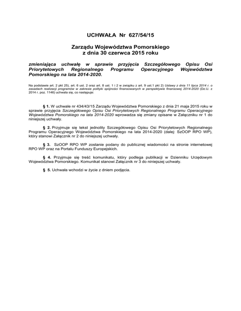 UCHWAŁA Nr 627/54/15 Zarządu Województwa Pomorskiego z dnia 30 czerwca 2015 roku zmieniająca uchwałę w sprawie przyjęcia Szczegółowego Opisu Osi Priorytetowych Regionalnego Programu Operacyjnego Województwa Pomorskiego na lata 2014-2020. Na podstawie art. 2 pkt 25), art. 6 ust. 2 oraz art. 8 ust. 1 i 2 w związku z art. 9 ust.1 pkt 2) Ustawy z dnia 11 lipca 2014 r. o zasadach realizacji programów w zakresie polityki spójności finansowanych w perspektywie finansowej 2014-2020 (Dz.U. z 2014 r. poz. 1146) uchwala się, co następuje: § 1. W uchwale nr 434/43/15 Zarządu Województwa Pomorskiego z dnia 21 maja 2015 roku w sprawie przyjęcia Szczegółowego Opisu Osi Priorytetowych Regionalnego Programu Operacyjnego Województwa Pomorskiego na lata 2014-2020 wprowadza się zmiany opisane w Załączniku nr 1 do niniejszej uchwały. § 2. Przyjmuje się tekst jednolity Szczegółowego Opisu Osi Priorytetowych Regionalnego Programu Operacyjnego Województwa Pomorskiego na lata 2014-2020 (dalej: SzOOP RPO WP), który stanowi Załącznik nr 2 do niniejszej uchwały. § 3. SzOOP RPO WP zostanie podany do publicznej wiadomości na stronie internetowej RPO WP oraz na Portalu Funduszy Europejskich. § 4. Przyjmuje się treść komunikatu, który podlega publikacji w Dzienniku Urzędowym Województwa Pomorskiego. Komunikat stanowi Załącznik nr 3 do niniejszej uchwały. § 5. Uchwała wchodzi w życie z dniem podjęcia. UZASADNIENIE Zarząd Województwa Pomorskiego, jako Instytucja Zarządzająca (dalej: IZ) Regionalnym Programem Operacyjnym Województwa Pomorskiego na lata 2014-2020 (dalej: RPO WP) jest odpowiedzialny za nabór, ocenę i wybór wniosków ubiegających się o dofinansowanie w ramach RPO WP. Z uwagi na ogólny charakter zapisów RPO WP konieczne jest przygotowanie dodatkowych dokumentów przedstawiających szczegółowe informacje służące realizacji Programu. Zgodnie z art. 6 ust. 2 ustawy z dnia 11 lipca 2014 r. o zasadach realizacji programów w zakresie polityki spójności finansowanych w perspektywie finansowej 2014-2020 (dalej: Ustawy) podstawę systemu realizacji programu operacyjnego stanowi między innymi szczegółowy opis osi priorytetowych programu operacyjnego. Szczegółowy Opis Osi Priorytetowych RPO WP (dalej: SzOOP RPO WP), z uwagi na poziom szczegółowości zawartych w nim informacji stanowi kompendium wiedzy, a jego podstawowym celem jest doprecyzowanie zapisów Programu oraz przekazanie potencjalnym wnioskodawcom informacji w szczególności na temat zakresu działań lub poddziałań realizowanych w ramach poszczególnych Osi Priorytetowych RPO WP. Dnia 21 maja 2015 roku Zarząd Województwa Pomorskiego uchwałą nr 434/43/15 przyjął SzOOP RPO WP. Dnia 25 czerwca 2015 roku Zarząd Województwa Pomorskiego przyjął Informację dotyczącą wyniku procesu identyfikacji projektów w ramach trybu pozakonkursowego. Dnia 26 czerwca 2015 roku Komitet Monitorujący RPO WP (dalej: KM RPO WP) zatwierdził II część kryteriów wyboru projektów w ramach Działań i Poddziałań RPO WP. Kryteria wyboru projektów zatwierdzone przez KM RPO WP zamieszczane są w Załączniku nr 3 do SzOOP RPO WP. Zarząd Województwa Pomorskiego przyjmuje Szczegółowy Opis Osi Priorytetowych Regionalnego Programu Operacyjnego Województwa Pomorskiego na lata 2014-2020 uzupełniony o II część kryteriów wyboru projektów zatwierdzonych przez KM RPO WP oraz o listę przedsięwzięć zidentyfikowanych przez IZ RPO WP w ramach trybu pozakonkursowego. Wprowadzone zmiany opisane zostały w formie rejestru stanowiącego Załącznik nr 1 do niniejszej uchwały. Tekst jednolity SzOOP RPO WP stanowi Załącznik nr 2 do niniejszej uchwały. SzOOP RPO WP zostanie podany do publicznej wiadomości na stronie internetowej RPO WP (http://rpo.pomorskie.eu) oraz na Portalu Funduszy Europejskich (http://www.funduszeeuropejskie.gov.pl). Komunikat o adresie strony internetowej oraz portalu, na których umieszczony został SzOOP RPO WP, a także o terminie, od którego niniejszy dokument obowiązuje, zostanie ogłoszony w Dzienniku Urzędowym Województwa Pomorskiego.
