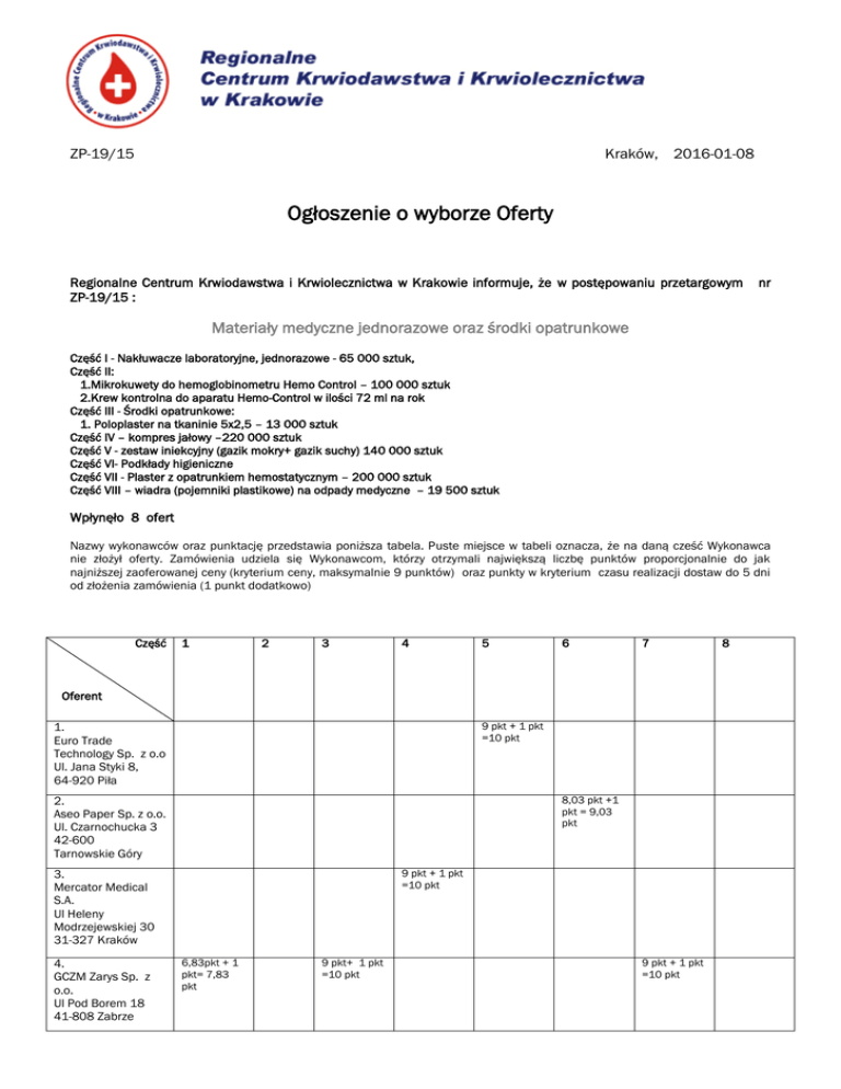 ZP-19/15 Kraków, 2016-01-08 Ogłoszenie o wyborze Oferty Regionalne Centrum Krwiodawstwa i Krwiolecznictwa w Krakowie informuje, że w postępowaniu przetargowym ZP-19/15 : nr Materiały medyczne jednorazowe oraz środki opatrunkowe Część I - Nakłuwacze laboratoryjne, jednorazowe - 65 000 sztuk, Część II: 1.Mikrokuwety do hemoglobinometru Hemo Control – 100 000 sztuk 2.Krew kontrolna do aparatu Hemo-Control w ilości 72 ml na rok Część III - Środki opatrunkowe: 1. Poloplaster na tkaninie 5x2,5 – 13 000 sztuk Część IV – kompres jałowy –220 000 sztuk Część V - zestaw iniekcyjny (gazik mokry+ gazik suchy) 140 000 sztuk Część VI- Podkłady higieniczne Część VII - Plaster z opatrunkiem hemostatycznym – 200 000 sztuk Część VIII – wiadra (pojemniki plastikowe) na odpady medyczne – 19 500 sztuk Wpłynęło 8 ofert Nazwy wykonawców oraz punktację przedstawia poniższa tabela. Puste miejsce w tabeli oznacza, że na daną cześć Wykonawca nie złożył oferty. Zamówienia udziela się Wykonawcom, którzy otrzymali największą liczbę punktów proporcjonalnie do jak najniższej zaoferowanej ceny (kryterium ceny, maksymalnie 9 punktów) oraz punkty w kryterium czasu realizacji dostaw do 5 dni od złożenia zamówienia (1 punkt dodatkowo) Część 1 2 3 4 5 6 7 Oferent 9 pkt + 1 pkt =10 pkt 1. Euro Trade Technology Sp. z o.o Ul. Jana Styki 8, 64-920 Piła 8,03 pkt +1 pkt = 9,03 pkt 2. Aseo Paper Sp. z o.o. Ul. Czarnochucka 3 42-600 Tarnowskie Góry 9 pkt + 1 pkt =10 pkt 3. Mercator Medical S.A. Ul Heleny Modrzejewskiej 30 31-327 Kraków 4. GCZM Zarys Sp. z o.o. Ul Pod Borem 18 41-808 Zabrze 6,83pkt + 1 pkt= 7,83 pkt 9 pkt+ 1 pkt =10 pkt 9 pkt + 1 pkt =10 pkt 8 5. CZM CEZAL S.A. 50-543 Wrocław, ulica Widna 4 6. „ALLMED” Andrzej Biedroń, Ul. Pawła z Krosna 7, 30-389 Kraków 7. Toruńskie Zakłady Materiałów Opatrunkowych S.A. u. Żółkiewskiego 87-100 Toruń 9 pkt + 1 pkt =10 pkt 9 pkt + 1 pkt =10 pkt 8,09 pkt+1 pkt = 9,09 pkt 9 pkt 6,95 pkt + 1 pkt= 7,95 pkt 8pkt+ 1 pkt =9 pkt 9 pkt + 1pkt =10 pkt 8. Med.-Plast S.C. Ul. Zielna 84 42-200 Częstochowa Nie wykluczono żadnego Wykonawcy, ani nie odrzucono żadnej oferty Umowy będą zawierane z Wykonawcami, którzy otrzymali największą ilość punktów w terminie nie krótszym niż 5 dni od ogłoszenia wyników postępowania. Przewidywany termin zawarcia umów to pierwsza połowa stycznia 2016. Jolanta Raś