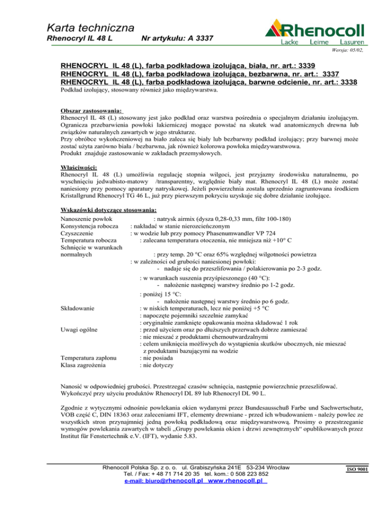 Karta techniczna Rhenocryl IL 48 L Nr artykułu: A 3337 Wersja: 05/02, RHENOCRYL IL 48 (L), farba podkładowa izolująca, biała, nr. art.: 3339 RHENOCRYL IL 48 (L), farba podkładowa izolująca, bezbarwna, nr. art.: 3337 RHENOCRYL IL 48 (L), farba podkładowa izolująca, barwne odcienie, nr. art.: 3338 Podkład izolujący, stosowany również jako międzywarstwa. Obszar zastosowania: Rhenocryl IL 48 (L) stosowany jest jako podkład oraz warstwa pośrednia o specjalnym działaniu izolującym. Ogranicza przebarwienia powłoki lakierniczej mogące powstać na skutek wad anatomicznych drewna lub związków naturalnych zawartych w jego strukturze. Przy obróbce wykończeniowej na biało zaleca się biały lub bezbarwny podkład izolujący; przy barwnej może zostać użyta zarówno biała / bezbarwna, jak również kolorowa powłoka międzywarstwowa. Produkt znajduje zastosowanie w zakładach przemysłowych. Właściwości: Rhenocryl IL 48 (L) umożliwia regulację stopnia wilgoci, jest przyjazny środowisku naturalnemu, po wyschnięciu jedwabisto-matowy /transparentny, względnie biały mat. Rhenocryl IL 48 (L) może zostać naniesiony przy pomocy aparatury natryskowej. Jeżeli powierzchnia została uprzednio zagruntowana środkiem Kristallgrund Rhenocryl TG 46 L, już przy pierwszym pokryciu uzyskuje się dobre działanie izolujące. Wskazówki dotyczące stosowania: Nanoszenie powłok Konsystencja robocza Czyszczenie Temperatura robocza Schnięcie w warunkach normalnych : natrysk airmix (dysza 0,28-0,33 mm, filtr 100-180) : nakładać w stanie nierozcieńczonym : w wodzie lub przy pomocy Phasenumwandler VP 724 : zalecana temperatura otoczenia, nie mniejsza niż +10° C : przy temp. 20 °C oraz 65% względnej wilgotności powietrza : w zależności od grubości naniesionej powłoki: - nadaje się do przeszlifowania / polakierowania po 2-3 godz. : w warunkach suszenia przyśpieszonego (40 °C): - nałożenie następnej warstwy średnio po 1-2 godz. Składowanie Uwagi ogólne Temperatura zapłonu Klasa zagrożenia : poniżej 15 °C: - nałożenie następnej warstwy średnio po 6 godz. : w niskich temperaturach, lecz nie poniżej +5 °C : napoczęte pojemniki szczelnie zamykać : oryginalnie zamknięte opakowania można składować 1 rok : przed użyciem oraz po dłuższych przerwach dobrze zamieszać : nie mieszać z produktami chemoutwardzalnymi : celem uniknięcia możliwych do wystąpienia skutków ubocznych, nie mieszać z produktami bazującymi na wodzie : nie posiada : nie dotyczy Nanosić w odpowiedniej grubości. Przestrzegać czasów schnięcia, następnie powierzchnie przeszlifować. Wykończyć przy użyciu produktów Rhenocryl DL 89 lub Rhenocryl DL 90 L. Zgodnie z wytycznymi odnośnie powlekania okien wydanymi przez Bundesausschuß Farbe und Sachwertschutz, VOB część C, DIN 18363 oraz zaleceniami IFT, elementy drewniane - przed ich wbudowaniem - należy powlec ze wszystkich stron przynajmniej jedną powłoką podkładową oraz międzywarstwową. Prosimy o przestrzeganie wymogów powlekania zawartych w tabeli „Grupy powlekania okien i drzwi zewnętrznych“ opublikowanych przez Institut für Fenstertechnik e.V. (IFT), wydanie 5.83. Rhenocoll Polska Sp. z o. o. ul. Grabiszyńska 241E 53-234 Wrocław Tel. / Fax: + 48 71 714 20 35 tel. kom.: 0 508 223 852 e-mail: [email protected] www.rhenocoll.pl ISO 9001 Karta techniczna Rhenocryl IL 48 L Nr artykułu: A 3337 Wersja: 05/02, Wskazówki dotyczące bezpieczeństwa: Pojemniki przechowywać szczelnie zamknięte, w miejscu niedostępnym dla dzieci. Unikać kontaktu z oczami. W razie kontaktu przemyć oczy dokładnie wodą. Przy pracy z lakierami zawierającymi niewielkie ilości substancji szkodliwych należy również zachować zwykłe środki ochronne. Opakowania: 5 L opakowanie 30 L opakowanie 150 L opakowanie Usuwanie opadów: Nieutwardzone bądź niewyschnięte resztki produktu należy zutylizować jako odpad specjalny zgodnie z obowiązującym kodem. Powyższa procedura odnosi się również do utwardzonych oraz wyschniętych pozostałości produktu. Puste opakowania poddać recyklingowi. Ekologia: Klasa zagrożenia dla wód powierzchniowych: 1 Nie dopuszczać do kontaktu z wodami gruntowymi, ściekami bądź gruntem. Serwis: Nasz serwis techniczny jest o każdej porze niezobowiązująco do Państwa dyspozycji; Tel./Fax: Tel. kom.: E-Mail: + 48 71 714 20 35 0 508 223 853 [email protected] Niniejsze dane są niezobowiązujące, opierają się na praktycznych doświadczeniach, jak również na przeprowadzonych u nas próbach oraz są niewiążące w myśl najnowszej jurysdykcji kodeksu cywilnego. Ze względu na różnorodność czynników, na które nie mamy wpływu, zalecamy w każdym przypadku przeprowadzenie własnych prób. Dane odbiegające od tych zawartych w kartach technicznych wymagają pisemnego potwierdzenia placówki w Mannheim‘ie. W każdym przypadku obowiązują nasze ogólne warunki handlowe. Z chwilą ukazania się niniejszej instrukcji wszystkie wcześniejsze wydania tracą swoją ważność. Rhenocoll Polska Sp. z o. o. ul. Grabiszyńska 241E 53-234 Wrocław Tel. / Fax: + 48 71 714 20 35 tel. kom.: 0 508 223 852 e-mail: [email protected] www.rhenocoll.pl ISO 9001