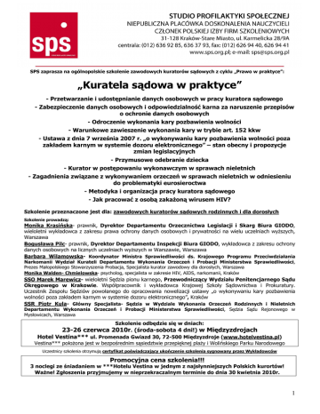 SPS zaprasza na ogólnopolskie szkolenie zawodowych kuratorów sądowych z cyklu „Prawo w praktyce”: „Kuratela sądowa w praktyce” - Przetwarzanie i udostępnianie danych osobowych w pracy kuratora sądowego - Zabezpieczenie danych osobowych i odpowiedzialność karna za naruszenie przepisów o ochronie danych osobowych - Odroczenie wykonania kary pozbawienia wolności - Warunkowe zawieszenie wykonania kary w trybie art. 152 kkw - Ustawa z dnia 7 września 2007 r. „o wykonywaniu kary pozbawienia wolności poza zakładem karnym w systemie dozoru elektronicznego” – stan obecny i propozycje zmian legislacyjnych - Przymusowe odebranie dziecka - Kurator w postępowaniu wykonawczym w sprawach nieletnich - Zagadnienia związane z wykonywaniem orzeczeń w sprawach nieletnich w odniesieniu do problematyki eurosieroctwa - Metodyka i organizacja pracy kuratora sądowego - Jak pracować z osobą zakaŜoną wirusem HIV? Szkolenie przeznaczone jest dla: zawodowych kuratorów sądowych rodzinnych i dla dorosłych Szkolenie prowadzą: Monika Krasińska- prawnik, Dyrektor Departamentu Orzecznictwa Legislacji i Skarg Biura GIODO, wieloletni wykładowca z zakresu prawa ochrony danych osobowych i prywatności na wielu uczelniach wyŜszych, Warszawa Bogusława Pilc- prawnik, Dyrektor Departamentu Inspekcji Biura GIODO, wykładowca z zakresu ochrony danych osobowych na licznych uczelniach wyŜszych w Warszawie, Warszawa Barbara Wilamowska- Koordynator Ministra Sprawiedliwości ds. Krajowego Programu Przeciwdziałania Narkomanii Wydział Kurateli Departamentu Wykonania Orzeczeń i Probacji Ministerstwa Sprawiedliwości, Prezes Małopolskiego Stowarzyszenia Probacja, Specjalista kurator zawodowy dla dorosłych, Warszawa Monika Walden- Chmielowska- psycholog, specjalista w zakresie HIV, AIDS, narkomanii, Kraków \ SSO Marek Marewicz- wieloletni Sędzia pionu karnego, Przewodniczący Wydziału Penitencjarnego Sądu Okręgowego w Krakowie. Współpracownik i wykładowca Krajowej Szkoły Sądownictwa i Prokuratury. Uczestnik Zespołu Sędziów powołanego do opracowania nowelizacji ustawy „o wykonywaniu kary pozbawienia wolności poza zakładem karnym w systemie dozoru elektronicznego”, Kraków SSR Piotr Kula- Główny Specjalista- Sędzia w Wydziale Wykonania Orzeczeń Rodzinnych i Nieletnich Departamentu Wykonania Orzeczeń i Probacji Ministerstwa Sprawiedliwości, Sędzia Sądu Rejonowego w Mysłowicach, Warszawa Szkolenie odbędzie się w dniach: 23-26 czerwca 2010r. (środa-sobota 4 dni!) w Międzyzdrojach Hotel Vestina*** ul. Promenada Gwiazd 30, 72-500 Międzyzdroje (www.hotelvestina.pl) Vestina*** połoŜona jest w bezpośrednim sąsiedztwie przepięknej plaŜy i Wolińskiego Parku Narodowego Uczestnicy szkolenia otrzymują certyfikat poświadczający ukończenie szkolenia sygnowany przez Wykładowców Promocyjna cena szkolenia!!! 3 noclegi ze śniadaniem w ***Hotelu Vestina w jednym z najsłynniejszych Polskich kurortów! WaŜne! Zgłoszenia przyjmujemy w nieprzekraczalnym terminie do dnia 30 kwietnia 2010r. 1 PROGRAM SZKOLENIA „Kuratela sądowa w praktyce”: 23-26.06.2010r. Hotel Vestina*** w Międzyzdrojach 23.06.2010r. (środa) Przetwarzanie i udostępnianie danych osobowych w pracy kuratora sądowego. Zabezpieczenie danych osobowych i odpowiedzialność karna za naruszenie przepisów o ochronie danych osobowych 12.00-13.00 Przyjazd i zakwaterowanie (Wcześniejsze przyjazdy- złoŜenie bagaŜy w bagaŜowni hotelu) 13.00-14.00 Obiad 14.00-14.10 Powitanie, wybór zajęć i podział na grupy warsztatowe, rozpoczęcie szkolenia 14.10-16.30 Przetwarzanie i udostępnianie danych osobowych w pracy kuratora sądowegoprowadzenie Monika Krasińska: 1. Zakres stosowania ustawy o ochronie danych osobowych w działalności kuratorów sądowych- definicje, wyjątki, ograniczenia. 2. Obowiązki kuratorów w świetle zasad ochrony danych osobowych a. obowiązek przetwarzania danych w ramach zasady legalizmu b. granice pozyskiwania danych osobowych przez kuratorów w świetle zasady adekwatności, merytorycznej poprawności i celowości przetwarzania c. dopuszczalność pozyskiwania danych szczególnie chronionych d. wykonanie obowiązku informacyjnego a realizacja uprawnień kontrolnych podmiotów danych 3. Ocena przetwarzania danych osobowych w świetle trybów udostępniania i pozyskiwania danych określonych w przepisach ustawy o ochronie danych osobowych 4. Warunki powierzania przetwarzania danych osobowych 16.30-19.30 Zabezpieczenie danych osobowych i odpowiedzialność karna za naruszenie przepisów o ochronie danych osobowych- prowadzenie Bogusława Pilc: I. Obowiązki sądu jako administratora danych oraz kuratorów sądowych uczestniczących w procesie zabezpieczenia danych osobowych przetwarzanych w aktach sądowych oraz urządzeniach ewidencyjnych: 1. Identyfikacja danych osobowych podlegających ochronie. 2. Analiza zagroŜeń procesu przetwarzania danych. 3. Wymagane środki techniczne i organizacyjne stosowane w celu ochrony danych osobowych. 4. Obowiązki administratora bezpieczeństwa informacji. 5. UpowaŜnienia dla osób uczestniczących w procesie przetwarzania danych. 6. Elementy ewidencji osób upowaŜnionych do przetwarzania danych. 7. Sposób sprawowania kontroli w zakresie stosowanych zabezpieczeń. 8. Podmioty upowaŜnione do dostępu do dokumentacji prowadzonej przez kuratorów sądowych. II. Odpowiedzialność karna za naruszenie przepisów o ochronie danych osobowych: 1. Przetwarzanie danych bez podstawny prawnej. 2. Udostępnienie danych osobom nieupowaŜnionym. 3. Naruszenie obowiązku zabezpieczenia danych. 4. Niedopełnienie obowiązku informacyjnego. 5. Niewykonanie obowiązku rejestracyjnego. od 19.45 Regionalna kolacja integracyjna, dyskoteka 2 24.06.2010r. (czwartek) Odroczenie wykonania kary pozbawienia wolności. Warunkowe zawieszenie wykonania kary w trybie art. 152 kkw. „Dozór elektroniczny”. Przymusowe odebranie dziecka. Kurator w postępowaniu wykonawc