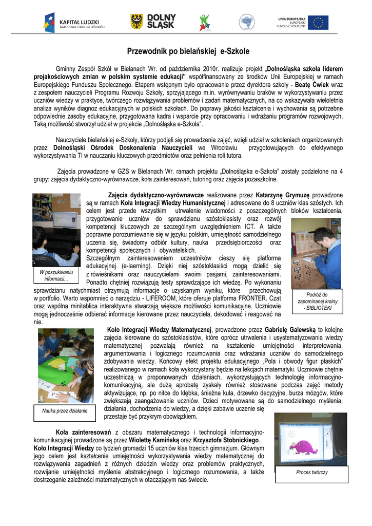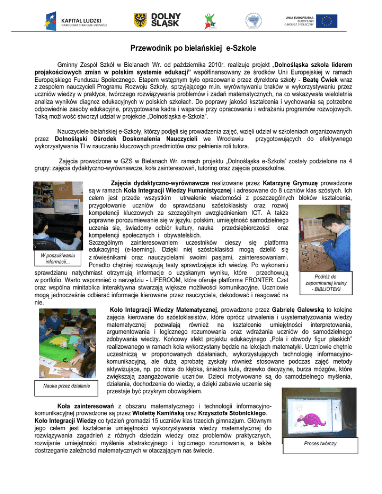 Przewodnik po bielańskiej e-Szkole Gminny Zespół Szkół w Bielanach Wr. od października 2010r. realizuje projekt „Dolnośląska szkoła liderem projakościowych zmian w polskim systemie edukacji” współfinansowany ze środków Unii Europejskiej w ramach Europejskiego Funduszu Społecznego. Etapem wstępnym było opracowanie przez dyrektora szkoły - Beatę Ćwiek wraz z zespołem nauczycieli Programu Rozwoju Szkoły, sprzyjającego m.in. wyrównywaniu braków w wykorzystywaniu przez uczniów wiedzy w praktyce, twórczego rozwiązywania problemów i zadań matematycznych, na co wskazywała wieloletnia analiza wyników diagnoz edukacyjnych w polskich szkołach. Do poprawy jakości kształcenia i wychowania są potrzebne odpowiednie zasoby edukacyjne, przygotowana kadra i wsparcie przy opracowaniu i wdrażaniu programów rozwojowych. Taką możliwość stworzył udział w projekcie „Dolnośląska e-Szkoła”. Nauczyciele bielańskiej e-Szkoły, którzy podjęli się prowadzenia zajęć, wzięli udział w szkoleniach organizowanych przez Dolnośląski Ośrodek Doskonalenia Nauczycieli we Wrocławiu przygotowujących do efektywnego wykorzystywania TI w nauczaniu kluczowych przedmiotów oraz pełnienia roli tutora. Zajęcia prowadzone w GZS w Bielanach Wr. ramach projektu „Dolnośląska e-Szkoła” zostały podzielone na 4 grupy: zajęcia dydaktyczno-wyrównawcze, koła zainteresowań, tutoring oraz zajęcia pozaszkolne. Zajęcia dydaktyczno-wyrównawcze realizowane przez Katarzynę Grymuzę prowadzone są w ramach Koła Integracji Wiedzy Humanistycznej i adresowane do 8 uczniów klas szóstych. Ich celem jest przede wszystkim utrwalenie wiadomości z poszczególnych bloków kształcenia, przygotowanie uczniów do sprawdzianu szóstoklasisty oraz rozwój kompetencji kluczowych ze szczególnym uwzględnieniem ICT. A także poprawne porozumiewanie się w języku polskim, umiejętność samodzielnego uczenia się, świadomy odbiór kultury, nauka przedsiębiorczości oraz kompetencji społecznych i obywatelskich. Szczególnym zainteresowaniem uczestników cieszy się platforma edukacyjnej (e-laerning). Dzięki niej szóstoklasiści mogą dzielić się W poszukiwaniu z rówieśnikami oraz nauczycielami swoimi pasjami, zainteresowaniami . informacji... Ponadto chętniej rozwiązują testy sprawdzające ich wiedzę. Po wykonaniu sprawdzianu natychmiast otrzymują informacje o uzyskanym wyniku, które przechowują Podróż do w portfolio. Warto wspomnieć o narzędziu - LIFEROOM, które oferuje platforma FRONTER. Czat zapominanej krainy oraz wspólna minitablica interaktywna stwarzają większe możliwości komunikacyjne. Uczniowie - BIBLIOTEKI mogą jednocześnie odbierać informacje kierowane przez nauczyciela, dekodować i reagować na nie. Koło Integracji Wiedzy Matematycznej, prowadzone przez Gabrielę Galewską to kolejne zajęcia kierowane do szóstoklasistów, które oprócz utrwalenia i usystematyzowania wiedzy matematycznej pozwalają również na kształcenie umiejętności interpretowania, argumentowania i logicznego rozumowania oraz wdrażania uczniów do samodzielnego zdobywania wiedzy. Końcowy efekt projektu edukacyjnego „Pola i obwody figur płaskich” realizowanego w ramach koła wykorzystany będzie na lekcjach matematyki. Uczniowie chętnie uczestniczą w proponowanych działaniach, wykorzystujących technologię informacyjnokomunikacyjną, ale dużą aprobatę zyskały również stosowane podczas zajęć metody aktywizujące, np. po nitce do kłębka, śnieżna kula, drzewko decyzyjne, burza mózgów, które zwiększają zaangażowanie uczniów. Dzieci motywowane są do samodzielnego myślenia, działania, dochodzenia do wiedzy, a dzięki zabawie uczenie się Nauka przez działanie przestaje być przykrym obowiązkiem. Koła zainteresowań z obszaru matematycznego i technologii informacyjnokomunikacyjnej prowadzone są przez Wiolettę Kamińską oraz Krzysztofa Stobnickiego. Koło Integracji Wiedzy co tydzień gromadzi 15 uczniów klas trzecich gimnazjum. Głównym jego celem jest kształcenie umiejętności wykorzystywania wiedzy matematycznej do rozwiązywania zagadnień z różnych dziedzin wiedzy oraz problemów praktycznych, rozwijanie umiejętności myślenia abstrakcyjnego i logicznego rozumowania, a także dostrzeganie zależności matematycznych w otaczającym nas świecie. Proces twórczy Podczas realizowanego projektu edukacyjnego pt. „Szukanie symetrii w otoczeniu” uczniowie, wykorzystując najnowszą technologię, samodzielnie układają testy i robią zdjęcia niezbędne do tworzenia prezentacji multimedialnej, która będzie zaprezentowana na dniach otwartych szkoły w ramach promocji koła. Natomiast zajęcia z uczestnikami Koła Komputerowego mają na celu rozwijanie zainteresowań piątoklasistów technologią informatyczną. Ponadto kształtowane są umiejętności uczenia się, myślenia, działania i komunikowania się w sytuacjach problemowych przy użyciu komputera. Uczniowie poznają możliwości i umiejętności obsługi darmowego programu do tworzenia i edycji grafiki rastrowej, upublicznionego na zasadach licencji GNU. Mowa tu o programie GIMP, przez niektórych traktowanym jako darmowy odpowiednik programu Adobe Photoshop. Podczas realizacji programu zajęć uczestnicy poznają nowe treści oraz przygotowują się do aktywnego i odpowiedzialnego życia w społeczeństwie informacyjnym. Komunikowanie się przy użyciu komputera Tutoring – jest procesem współpracy nauczyciela i ucznia, nakierowanym na rozwój intelektualny i psychologiczny dziecka. Efektem tutoringu jest m.in. wzrost odpowiedzialności dziecka za własny rozwój oraz pobudzanie drzemiących w nim talentów. Celem realizowanych w GZS w Bielanach Wrocławskich zajęć, prowadzonych przez Barbarę Patołę, Annę Blunt i Maję Polańską jest udzielanie wsparcia uczniom o specyficznych potrzebach edukacyjnych. Zajęcia powadzone są w grupach Rzetelnie wykonane c