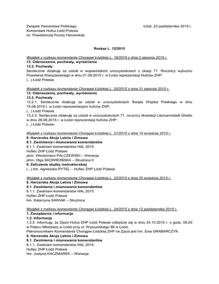 Związek Harcerstwa Polskiego Komendant Hufca Łódź-Polesie im. Powstańczej Poczty Harcerskiej Łódź, 23 października 2015 r. Rozkaz L. 12/2015 Wyjątek z rozkazu komendanta Chorągwi Łódzkiej L. 19/2015 z dnia 2 sierpnia 2015 r. 13. Odznaczenia, pochwały, wyróżnienia 13.2. Pochwały Serdecznie dziękuję za udział w wojewódzkich uroczystościach z okazji 71. Rocznicy wybuchu Powstania Warszawskiego w dniu 01.08.2015 r. w Łodzi reprezentacji Hufców ZHP: (...) Łódź Polesie Wyjątek z rozkazu komendanta Chorągwi Łódzkiej L. 20/2015 z dnia 31 sierpnia 2015 r. 13. Odznaczenia, pochwały, wyróżnienia 13.2. Pochwały 13.2.1. Serdecznie dziękuję za udział w uroczystościach Święta Wojska Polskiego w dniu 15.08.2015 r. w Łodzi reprezentacjom hufców ZHP: (...) Łódź Polesie, 13.2.3. Serdecznie dziękuję za udział w uroczystościach 71. rocznicy likwidacji Litzmannstadt Ghetto w dniu 28.08.2015 r. w Łodzi reprezentacji hufców ZHP: (...) Łódź Polesie, Wyjątek z rozkazu komendanta Chorągwi Łódzkiej L. 21/2015 z dnia 14 września 2015 r. 8. Harcerska Akcja Letnia i Zimowa 8.1. Zwolnienia i mianowania komendantów 8.1.1. Zwalniam komendantów HAL 2015 Hufiec ZHP Łódź Polesie phm. Włodzimierz PALCZEWSKI – Wenecja phm. Olga SKOWROŃSKA – Strużnica II 9. Zaliczenie służby instruktorskiej (...) hm. Agnieszka RYTEL – Hufiec ZHP Łódź Polesie Wyjątek z rozkazu komendanta Chorągwi Łódzkiej L. 22/2015 z dnia 25 września 2015 r. 8. Harcerska Akcja Letnia i Zimowa 8.1. Zwolnienia i mianowania komendantów 8.1.1. Zwalniam komendantów HAL 2015 Hufiec ZHP Łódź Polesie hm. Katarzyna SAWIAK – Strużnica Wyjątek z rozkazu komendanta Chorągwi Łódzkiej L. 24/2015 z dnia 12 października 2015 r. 1. Zarządzenia i informacje 1.2. Informacje 1.2.5. Informuję, że Zjazd Hufca ZHP Łódź Polesie odbędzie się w dniu 24.10.2015 r. o godz. 09.00 w Pałacu Młodzieży w Łodzi przy ul. Wyszyńskiego 86 w Łodzi. Pełnomocnikiem Komendanta Chorągwi Łódzkiej ZHP na Zjazd jest hm. Ewa GRABARCZYK. 8. Harcerska Akcja Letnia i Zimowa 8.1. Zwolnienia i mianowania komendantów 8.1.1. Zwalniam komendantów HAL 2015 Hufiec ZHP Łódź Polesie hm. Justyna KACZMAREK – Wenecja 12. Pochwały, wyróżnienia, nagrody 12.1. Na wniosek Kapituły Honorowej Odznaki Zasłużony dla Hufca Łódź-Polesie przyznaję odznakę: phm. Dorocie Łapińskiej phm. Marcinowi Sobiepańskiemu. Czuwaj hm. Agnieszka Rytel