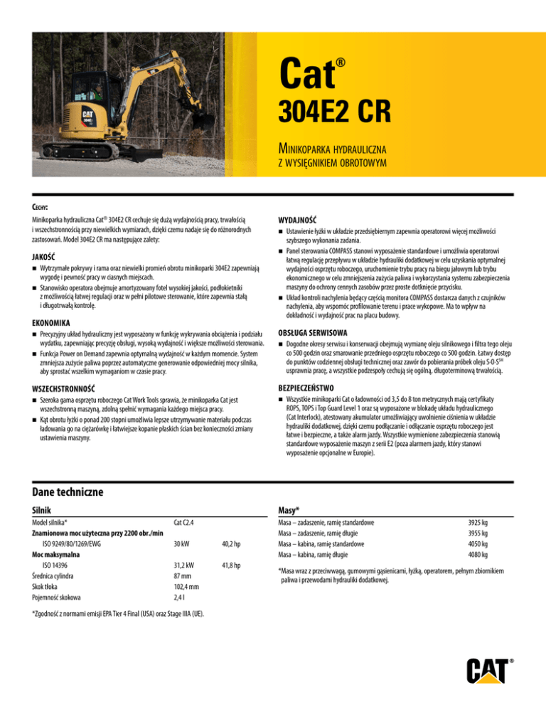 Cat ® 304E2 CR Minikoparka hydrauliczna z wysięgnikiem obrotowym Cechy: Minikoparka hydrauliczna Cat® 304E2 CR cechuje się dużą wydajnością pracy, trwałością i wszechstronnością przy niewielkich wymiarach, dzięki czemu nadaje się do różnorodnych zastosowań. Model 304E2 CR ma następujące zalety: WYDAJNOŚĆ Ustawienie łyżki w układzie przedsiębiernym zapewnia operatorowi więcej możliwości szybszego wykonania zadania. Panel sterowania COMPASS stanowi wyposażenie standardowe i umożliwia operatorowi Jakość Wytrzymałe pokrywy i rama oraz niewielki promień obrotu minikoparki 304E2 zapewniają wygodę i pewność pracy w ciasnych miejscach. Stanowisko operatora obejmuje amortyzowany fotel wysokiej jakości, podłokietniki z możliwością łatwej regulacji oraz w pełni pilotowe sterowanie, które zapewnia stałą i długotrwałą kontrolę. Ekonomika Precyzyjny układ hydrauliczny jest wyposażony w funkcję wykrywania obciążenia i podziału wydatku, zapewniając precyzję obsługi, wysoką wydajność i większe możliwości sterowania. Funkcja Power on Demand zapewnia optymalną wydajność w każdym momencie. System zmniejsza zużycie paliwa poprzez automatyczne generowanie odpowiedniej mocy silnika, aby sprostać wszelkim wymaganiom w czasie pracy. łatwą regulację przepływu w układzie hydrauliki dodatkowej w celu uzyskania optymalnej wydajności osprzętu roboczego, uruchomienie trybu pracy na biegu jałowym lub trybu ekonomicznego w celu zmniejszenia zużycia paliwa i wykorzystania systemu zabezpieczenia maszyny do ochrony cennych zasobów przez proste dotknięcie przycisku. Układ kontroli nachylenia będący częścią monitora COMPASS dostarcza danych z czujników nachylenia, aby wspomóc profilowanie terenu i prace wykopowe. Ma to wpływ na dokładność i wydajność prac na placu budowy. Obsługa serwisowa Dogodne okresy serwisu i konserwacji obejmują wymianę oleju silnikowego i filtra tego oleju co 500 godzin oraz smarowanie przedniego osprzętu roboczego co 500 godzin. Łatwy dostęp do punktów codziennej obsługi technicznej oraz zawór do pobierania próbek oleju S·O·SSM usprawnia pracę, a wszystkie podzespoły cechują się ogólną, długoterminową trwałością. Wszechstronność Bezpieczeństwo Szeroka gama osprzętu roboczego Cat Work Tools sprawia, że minikoparka Cat jest Wszystkie minikoparki Cat o ładowności od 3,5 do 8 ton metrycznych mają certyfikaty wszechstronną maszyną, zdolną spełnić wymagania każdego miejsca pracy. Kąt obrotu łyżki o ponad 200 stopni umożliwia lepsze utrzymywanie materiału podczas ładowania go na ciężarówkę i łatwiejsze kopanie płaskich ścian bez konieczności zmiany ustawienia maszyny. ROPS, TOPS i Top Guard Level 1 oraz są wyposażone w blokadę układu hydraulicznego (Cat Interlock), atestowany akumulator umożliwiający uwolnienie ciśnienia w układzie hydrauliki dodatkowej, dzięki czemu podłączanie i odłączanie osprzętu roboczego jest łatwe i bezpieczne, a także alarm jazdy. Wszystkie wymienione zabezpieczenia stanowią standardowe wyposażenie maszyn z serii E2 (poza alarmem jazdy, który stanowi wyposażenie opcjonalne w Europie). Dane techniczne Silnik Model silnika* Znamionowa moc użyteczna przy 2200 obr./min ISO 9249/80/1269/EWG Moc maksymalna ISO 14396 Średnica cylindra Skok tłoka Pojemność skokowa Masy* Cat C2.4 30 kW 40,2 hp 31,2 kW 87 mm 102,4 mm 2,4 l 41,8 hp *Zgodność z normami emisji EPA Tier 4 Final (USA) oraz Stage IIIA (UE). Masa – zadaszenie, ramię standardowe Masa – zadaszenie, ramię długie Masa – kabina, ramię standardowe Masa – kabina, ramię długie 3925 kg 3955 kg 4050 kg 4080 kg *Masa wraz z przeciwwagą, gumowymi gąsienicami, łyżką, operatorem, pełnym zbiornikiem paliwa i przewodami hydrauliki dodatkowej. Minikoparka hydrauliczna 304E2 CR z wysięgnikiem obrotowym Mechanizm obrotu Prędkość obracania maszyny Obracanie wysięgnika – w lewo (bez zatrzymania)* Obracanie wysięgnika – w lewo (z zatrzymaniem)* Obracanie wysięgnika – w prawo Lemiesz 10 obr./min 70° 55° 50° Szerokość Wysokość Głębokość kopania Wysokość podnoszenia *Automatyczny sprężynowy hamulec mechanizmu obrotu, zwalniany hydraulicznie. Kabina Układ jezdny Prędkość jazdy – zakres wysoki Prędkość jazdy – zakres niski Maksymalna siła przyczepności – duża prędkość Maksymalna siła przyczepności – mała prędkość Nacisk na podłoże – z zadaszeniem Nacisk na podłoże – z kabiną Zdolność pokonywania wzniesień (maks.) Dynamiczny poziom ciśnienia akustycznego na stanowisku operatora (ISO 6396:2008) Poziom hałasu na zewnątrz (ISO 6395:2008) 5,2 km/h 3,3 km/h 16,9 kN 31,0 kN 28,1 kPa 29,5 kPa 30° 81 dB(A) 96 dB(A) *Dyrektywa Unii Europejskiej „2000/14/EC” Certyfikacja – kabina i zadaszenie Kabina z konstrukcją chroniącą przed skutkami przewrócenia się maszyny (ROPS) Konstrukcja zabezpieczająca przed skutkami wywrócenia pojazdu (TOPS) Górna osłona Objętości płynów eksploatacyjnych Układ chłodzenia Olej silnikowy Zbiornik paliwa Zbiornik oleju hydraulicznego Układ hydrauliczny 1950 mm 325 mm 470 mm 400 mm 5,5 l 9,5 l 46 l 42,3 l 65 l ISO 12117-2 ISO 12117 ISO 10262 (Level 1) Specyfikacje robocze Długość ramienia – wersja standardowa Długość ramienia – wersja długa Zwis maszyny Układ hydrauliczny Wykrywający obciążenie układ hydrauliczny z pompą tłokową o zmiennym wydatku Wydatek pompy przy 2200 obr./min 100 l/min Ciśnienie robocze – osprzęt 245 kPa Ciśnienie robocze – jazda 245 kPa Ciśnienie robocze – mechanizm obrotu 216 kPa Obwód hydrauliki dodatkowej – podstawowy 70 l/min Obwód hydrauliki dodatkowej – pomocniczy 25 l/min Siła kopania – ramię (standardowe) 21,6 kN Siła kopania – ramię (długie) 19,5 kN Siła kopania – łyżka 37,8 kN 1315 mm 1615 mm 0 mm Podwozie Liczba rolek podtrzymujących Liczba rolek jezdnych Typ rolek jezdnych 1 4 