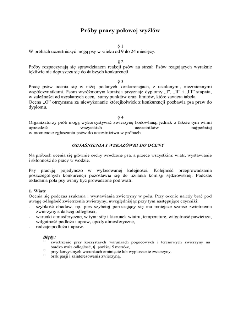 Próby pracy polowej wyżłów §1 W próbach uczestniczyć mogą psy w wieku od 9 do 24 miesięcy. §2 Próby rozpoczynają się sprawdzianem reakcji psów na strzał. Psów reagujących wyraźnie lękliwie nie dopuszcza się do dalszych konkurencji. §3 Pracę psów ocenia się w niżej podanych konkurencjach, z ustalonymi, niezmiennymi współczynnikami. Psom wyróżnionym komisja przyznaje dyplomy „I”, „II” i „III” stopnia, w zależności od uzyskanych ocen, sumy punktów oraz limitów, które zawiera tabela. Ocena „O” otrzymana za niewykonanie którejkolwiek z konkurencji pozbawia psa praw do dyplomu. §4 Organizatorzy prób mogą wykorzystywać zwierzynę hodowlaną, jednak o fakcie tym winni uprzedzić wszystkich uczestników najpóźniej w momencie zgłaszania psów do uczestnictwa w próbach. OBJAŚNIENIA I WSKAZÓWKI DO OCENY Na próbach ocenia się głównie cechy wrodzone psa, a przede wszystkim: wiatr, wystawianie i skłonność do pracy w wodzie. Psy pracują pojedynczo w wylosowanej kolejności. Kolejność przeprowadzania poszczególnych konkurencji pozostawia się do uznania komisji sędziowskiej. Podczas okładania pola psy winny być prowadzone pod wiatr. 1. Wiatr Ocenia się podczas szukania i wystawiania zwierzyny w polu. Przy ocenie należy brać pod uwagę odległość zwietrzenia zwierzyny, uwzględniając przy tym następujące czynniki: - szybkość chodów, np. pies szybciej poruszający się ma mniejsze szanse zwietrzenia zwierzyny z dalszej odległości, - warunki atmosferyczne, w tym: siłę i kierunek wiatru, temperaturę, wilgotność powietrza, wilgotność podłoża i upraw, opady atmosferyczne, - rodzaje podłoża i upraw. Błędy: zwietrzenie przy korzystnych warunkach pogodowych i terenowych zwierzyny na bardzo małą odległość, tj. poniżej 5 metrów, przy korzystnych warunkach ominięcie lub wypłoszenie zwierzyny, brak pasji i zainteresowania zwierzyną. Nie należy traktować jako błędy: wystawiania zwierzyny na mniejszą odległość niż jej zwietrzenie, przecięcia tropów zająca bez zaznaczenia ich, krótkich pustych stójek i stójek do „ptaszków”, krótkiego wystawiania tropów, kotlin i paprzysk. 2. Wystawianie Od młodego wyżła nie wymaga się jeszcze klasycznej, twardej stójki. Dlatego nie uważa się za błąd pogonienie zwierzyny, jeżeli pies wcześniej zaznaczył jej obecność wyraźną, choćby nawet czasowo krótką stójką. Jednak w przypadku częstych, zbyt krótkich stójek, ocena za tą konkurencję nie może być wyższa niż „1”. Psy wystawiające tropy, kotliny czy paprzyska mogą otrzymać ocenę „3”. 3. Sposób szukania Podczas szukania wyżeł powinien chodzić szeroko i wykazywać wyraźną skłonność do przekładania pola zygzakami. Błędy: bliskie trzymanie się przewodnika, wychodzenie z ręki przewodnika, brak zainteresowania pracą. 4. Szybkość chodów Uzależniona jest do pewnego stopnia od ukształtowania terenu i rodzaju upraw. Wyżeł powinien poruszać się i trzymać głowę w sposób typowy dla danej rasy, rozwijając możliwie największą szybkość. Należy brać pod uwagę sposoby poruszania się poszczególnych ras. 5. Skłonność do pracy w wodzie Podczas tej konkurencji nie wolno stosować przymusu. Można natomiast zachęcać psa do wejścia do wody, np. rzucając kamyk tak, by pies to widział lub wchodząc samemu i przyzywając psa. Im chętniej i głębiej pies wchodzi do wody po otrzymaniu rozkazu tym wyższą otrzymuje ocenę. Przewodnikowi wolno zachęcać psa do wejścia do wody rzucaniem do niej kamyków. Kamyki wolno rzucać trzykrotnie – za każdy rzut obniża się końcową ocenę o „1” stopień. Również należy obniżyć ocenę psom, które wejdą do wody dopiero zachęcone wcześniejszym do niej wejściem swego przewodnika. Na wykonanie tej konkurencji przeznacza się maksymalnie 10 minut. - jeżeli pies przepłynie swobodnie minimum 5 metrów – otrzymuje ocenę „4”, jeżeli przepłynie odległość 2 – 4 metrów – otrzymuje ocenę „3”, jeżeli pies wszedł do wody, do wysokości łokci i nie wykazuje chęci poruszania się w niej, nie może otrzymać oceny wyższej niż „1”. 6. Posłuszeństwo i skłonność do współpracy z przewodnikiem Nie wymaga się jeszcze bezwzględnego posłuszeństwa lecz jedynie wyraźnej skłonności do wykonywania otrzymanych rozkazów oraz utrzymywania kontaktu z przewodnikiem podczas przeszukiwania terenu. Jeżeli na polecenie sędziego przewodnik nie zdoła w czasie 10 minut przywołać psa, to otrzymuje za tą konkurencję ocenę „0”. Tabela konkurencji i ocen prób polowych wyżłów: Konkurencje 1 2 3 4 5 6 Wiatr Wystawianie Sposób szukania i pasja Szybkość i styl chodów Skłonność do pracy w wodzie Posłuszeństwo Razem Współczynnik 5 5 4 4 4 3 25 Najwyższa liczba punktów do zdobycia 25 x 4 = 100 80 I° 3 3 3 2 2 3 Limity Suma punktów 70 Dyplom II° 3 3 2 2 60 III° 2 2 - Karta oceny pracy psa na próbach wyżłów w ……………………………………………………..dnia …………………… Nazwa psa z przydomkiem…………………………………………………………………… Data urodzenia……………......., rasa……………………………….., płeć…………………. PKR…………………………………, Nr tatuażu…………………..., maść………………… Ojciec ……………………………………………………………….., PKR………………… Matka ……………………………………………………………….., PKR………………… Właściciel………………………………………………, (adres)……………………………. Hodowca……………………………………..…………, (adres)…………………………… Lp. Konkurencje Współczynnik 1. Wiatr 5 2. Wystawianie 5 3. Sposób szukania i pasja 4 4. Szybkość i styl chodów 4 5. 