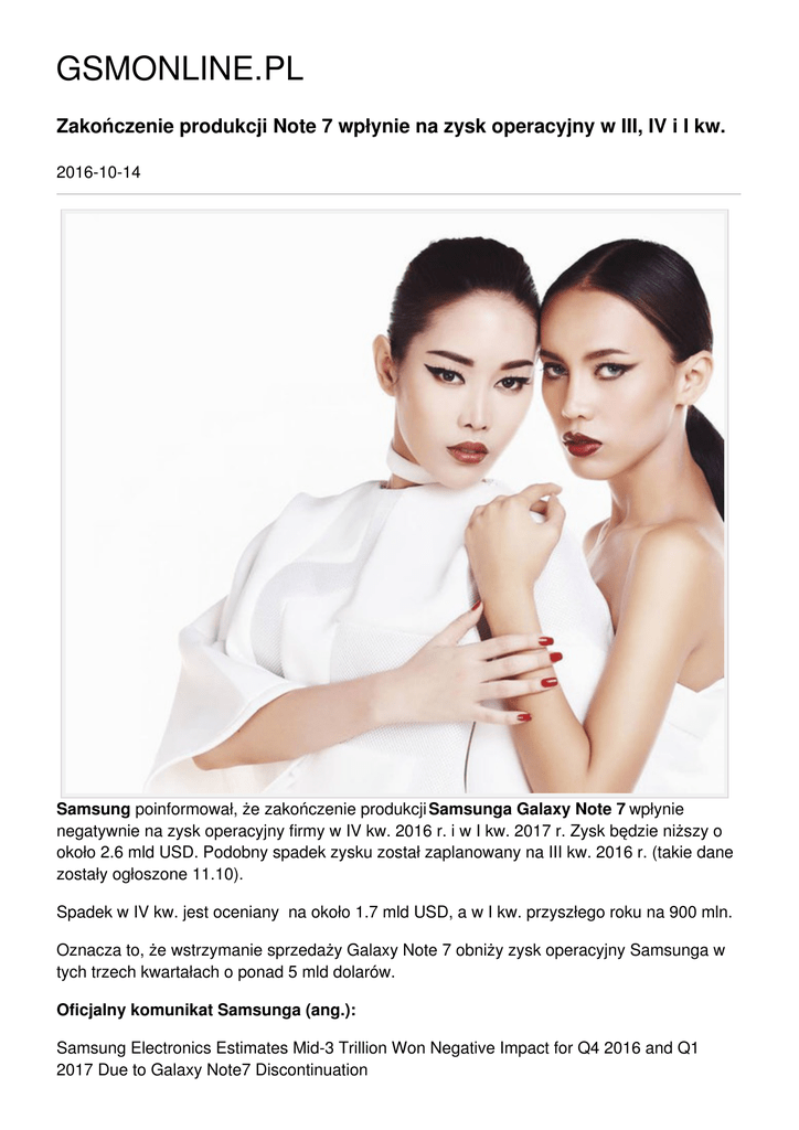 GSMONLINE.PL Zakończenie produkcji Note 7 wpłynie na zysk operacyjny w III, IV i I kw. 2016-10-14 Samsung poinformował, że zakończenie produkcji Samsunga Galaxy Note 7 wpłynie negatywnie na zysk operacyjny firmy w IV kw. 2016 r. i w I kw. 2017 r. Zysk będzie niższy o około 2.6 mld USD. Podobny spadek zysku został zaplanowany na III kw. 2016 r. (takie dane zostały ogłoszone 11.10). Spadek w IV kw. jest oceniany na około 1.7 mld USD, a w I kw. przyszłego roku na 900 mln. Oznacza to, że wstrzymanie sprzedaży Galaxy Note 7 obniży zysk operacyjny Samsunga w tych trzech kwartałach o ponad 5 mld dolarów. Oficjalny komunikat Samsunga (ang.): Samsung Electronics Estimates Mid-3 Trillion Won Negative Impact for Q4 2016 and Q1 2017 Due to Galaxy Note7 Discontinuation Korea on October 14, 2016 Samsung Electronics announced today that it estimates a negative impact of approximately mid-3 trillion won in operating profit from the fourth quarter of 2016 through the first quarter of 2017, due to the discontinuation of Galaxy Note7 sales. The company already allocated the expected direct cost from the discontinuation of Galaxy Note7 sales in its third quarter earnings guidance revision announced on Oct. 11, but expects the drop in revenue from the discontinued sales to continue to have a negative impact on operating profit for the next two quarters. The negative impact is estimated in the mid-2 trillion won range for the fourth quarter of 2016 and at approximately 1 trillion won for the first quarter of 2017. The company is releasing these estimates to inform the market on the impact of the Galaxy Note7 discontinuation. Moving forward, Samsung Electronics plans to normalize its mobile business by expanding sales of flagship models such as the Galaxy S7 and Galaxy S7 edge. Additionally, the company will focus on enhancing product safety for consumers by making significant changes in its quality assurance processes. Komunikaty z z 7 i 12 października: Korea on October 12, 2016 Samsung Electronics today announced its REVISED earnings guidance for the third quarter of 2016. After recent incidents and in consideration of our consumers’ safety, Samsung Electronics stopped sales, exchanges and production of the Galaxy Note 7. Below is a revised preearnings guidance which reflects the impact of this decision on the third quarter earnings, in accordance with accounting standards. We are providing the revised guidance based on disclosure regulations of securities market. · Consolidated Sales: Approximately 47 trillion Korean won · Consolidated Operating Profit: Approximately 5.2 trillion Korean won The above figures are estimates of consolidated earnings based on K-IFRS. Please note that Korean disclosure regulations do not allow earnings estimates to be provided as a range. Therefore, in compliance with such disclosure regulations, the above figures represent the median of the earnings estimate range, provided below. · Sales: 46 ~ 48 trillion Korean won · Operating Profit: 5.1 ~ 5.3 trillion Korean won ============================================================= October 7, 2016 – Samsung Electronics today announced its earnings guidance for the third quarter of 2016. Consolidated Sales: Approximately 49 trillion Korean won Consolidated Operating Profit: Approximately 7.8 trillion Korean won The above figures are estimates of consolidated earnings based on K-IFRS. Please note that Korean disclosure regulations do not allow earnings estimates to be provided as a range. Therefore, in compliance with such disclosure regulations, the above figures represent the median of the earnings estimate range, provided below. Sales: 48 ~ 50 trillion Korean won Operating Profit: 7.7 ~ 7.9 trillion Korean won ※ 2016 2Q and 2015 3Q consolidated figures based on K-IFRS are as follows (in trillion won) 2016. 2Q 2015. 3Q Sales 50.94 51.68 Operating Profit 8.14 7.39