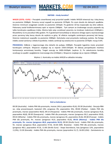 15 Biuletyn dzienny 02.04.2013 S&P500 – kiedy korekta? WIG20 (2370; -0.6%) – Początek czwartkowej sesji przyniósł spadki. Indeks WIG20 otworzył się z luką bessy na poziomie 2368pkt. Poranny szczyt wypadł na poziomie 2376pkt. Po czym doszło do dalszych spadków. Dzienne minimum osiągnięte zostało na poziomie 2355pkt. Po godzinie 10-tej rozpoczęło się silne odbicie. Pokonany został krótkoterminowy opór w rejonie 2368pkt. Tym samym ze środowego szczytu pojawiła się tylko korekcyjna spadkowa trójka. Można było więc oczekiwać powrotu na środowe maksimum (2385pkt.). Musieliśmy na to poczekać kilka godzin. Po 3 godzinach konsolidacji w obszarze silnego oporu wyznaczonego przez poranną lukę bessy doszło do wybicia w górę. W efekcie nastąpiło zamknięcie porannej luki bessy. Dzienne maksimum wypadło na poziomie 2389pkt. Końcówka sesji przyniosła realizację zysków. Na fixingu indeks został zaniżony o blisko 8 punktów. Indeks zamknął się ostatecznie na poziomie 2370pkt. tracąc 0.6%. PROGNOZA: Odbicie z tegorocznego dna dotarło do pułapu 2389pkt. Początek tygodnia może przynieść korekcyjne cofnięcie. Wsparcie znajduje się w rejonie 2350-2355pkt. W dalszej perspektywie możliwa kontynuacja wzrostowej korekty. Target szacuję na 2400-2420pkt. (wykres 1). Po zakończeniu korekty oczekuję na spadki i pogłębienie marcowego dna (2330pkt.). Wsparcie znajduje się w rejonie 2300pkt. Wykres 1. Kontrakty na Indeks WIG20 w układzie intraday Dziś w kalendarzu: 00:30 (Australia) - Indeks PMI dla przemysłu, marzec (44,4, poprzednio 45,6), 05:30 (Australia) - Decyzja RBA ws. stóp procentowych, kwiecień (3%, prognoza 3%, poprzednio 3%), 09:00 (Polska) - Indeks PMI dla przemysłu, marzec (poprzednio 48,9), 09:13 (Hiszpania) - Indeks PMI dla przemysłu, marzec (prognoza 45,8, poprzednio 46,8), 09:30 (Szwajcaria) - Indeks PMI dla przemysłu, marzec (prognoza 50,2, poprzednio 50,8), 09:43 (Włochy) - Indeks PMI dla przemysłu, marzec (prognoza 45, poprzednio 45,8), 09:48 (Francja) - Indeks PMI dla przemysłu, fin. marzec (prognoza 43,9, poprzednio 43,9), 09:53 (Niemcy) - Indeks PMI dla przemysłu, fin. marzec (prognoza 48,9, poprzednio 50,3), 09:58 (Strefa Euro) - Indeks PMI dla przemysłu, fin. marzec (prognoza 46,6, poprzednio 47,9), 10:28 (Wlk. Brytania) - Indeks PMI dla przemysłu, marzec (prognoza 48,5, poprzednio 47,9), 11:00 (Strefa Euro) - Stopa bezrobocia, luty (prognoza 12%, poprzednio 11,9%), 15:30 (Kanada) - Indeks PMI dla przemysłu, marzec (poprzednio 51,7), 16:00 (USA) - Zamówienia na Strona 1 15 Biuletyn dzienny 02.04.2013 dobra bez środków trans., fin. (m/m), luty (prognoza -0,5%, poprzednio 2,9%), Zamówienia na dobra trwałego użytku, fin. (prognoza 5,7%, poprzednio -3,8%), Zamówienia w przemyśle, luty (prognoza 2,9%, poprzednio -2%), 22:30 (USA) - Tygodniowa zmiana zapasów ropy wg API (poprzednio 3,7 mln brk). Rynek w USA S&P500 Future (1556.45; -0.5%) – W poniedziałek do godziny 16-tej byki broniły ważnego wsparcia w rejonie 1558pkt. Gorsze dane z gospodarki (w marcu indeks ISM dla przemysłu spadł do 51.3pkt.., oczekiwano odczytu na poziomie 54.2pkt.) przełożyły się na spadki. Dzienne minimum wypadło na poziomie 1552.5pkt. W końcówce dnia doszło do odbicia. Zamknięcie po 1556.5pkt. Dziś w nocy doszło do niewielkiego odbicia. Lokalny szczyt wypadł na poziomie 1558pkt. O godzinie 08:20 kontrakty były notowane po 1556.5pkt. PROGNOZA: Po wczorajszej sesji sytuacja nieznacznie się pogorszyła. Przekroczone zostało wsparcie w rejonie 1558-1560pkt. Do rozpoczęcia mocniejszej korekty konieczne jest przełamanie wsparcia rejonie 1550pkt. co otworzy drogę do spadków w rejon 1530-1535pkt. a w dalszej perspektywie w okolice 1500pkt. (wykres 2). Wykres 2. Kontrakty na indeks S&P500 w układzie intraday Zniesienie wzrostów z grudniowego dna o 38% wypada na poziomie 1490pkt. Dodatkowo jest ono wzmocnione przez wcześniejsze minima. Rozbicie wsparcia w rejonie 1530pkt. wygeneruje sygnał zakończenia fali trzeciej (wykres 2), target dla fali czwartej oceniam na 1490pkt. W dalszej perspektywie oczekuję fali piątej. Może ona potrwać do maja. Target szacuję na rejon 1600pkt. Wtedy powstaną warunki do skorygowania całej 5-falowej struktury z listopadowego minimum. APPLE - Z marcowego szczytu na poziomie 469.88 USD doszło do realizacji zysków. Przyjmuje ona bardzo silną formę. W poniedziałek kurs kontraktów CFD na spółkę spadł do poziomu 427.73 USD, zamknięcie wypadło nieznacznie wyżej, po 428.84 USD. Strona 2 15 Biuletyn dzienny 02.04.2013 W krótkim terminie możliwe jest korekcyjne odbicie, po jego zakończeniu możliwy jest spadek i najprawdopodobniej dojdzie do pogłębienia tegorocznego dna na poziomie 419 USD (wykres 3). Wykres 3. Kontrakty CFD na spółkę Apple Potem możliwe jest odbicie. Sygnał do mocniejszego i trwalszego odbicia pojawi się po przebiciu od dołu oporu w rejonie 427 USD. Sławomir Dębowski Markets.com Niniejsza publikacja została przygotowana przez Felson Limited Sp. z o.o. oddział w Polsce i jest dostarczona wyłącznie w celach informacyjnych. Przeznaczona jest dla inwestorów, którzy nie podejmują swoich decyzji inwestycyjnych w oparciu o nią. Inwestorzy powinni mieć swoją własną ocenę co do właściwości i celowości inwestowania w którykolwiek z wymienianych instrument finansowy, opartą na analizie danego instrumentu, ryzyka z nim związanego, ich własnej strategii inwestycyjnej oraz przy uwzględnieniu ich prawnej, podatkowej i finansowej sytuacji. Strona 3