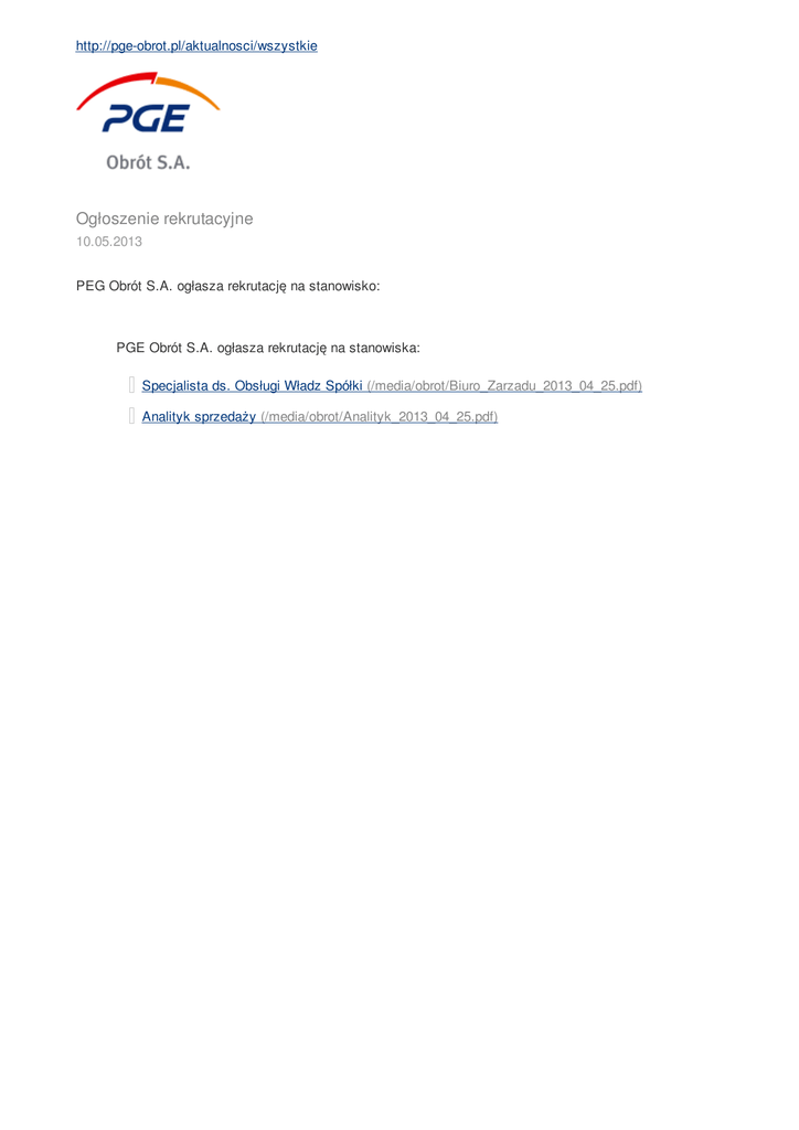 http://pge-obrot.pl/aktualnosci/wszystkie Ogłoszenie rekrutacyjne 10.05.2013 PEG Obrót S.A. ogłasza rekrutację na stanowisko: PGE Obrót S.A. ogłasza rekrutację na stanowiska: Specjalista ds. Obsługi Władz Spółki (/media/obrot/Biuro_Zarzadu_2013_04_25.pdf) Analityk sprzedaży (/media/obrot/Analityk_2013_04_25.pdf)