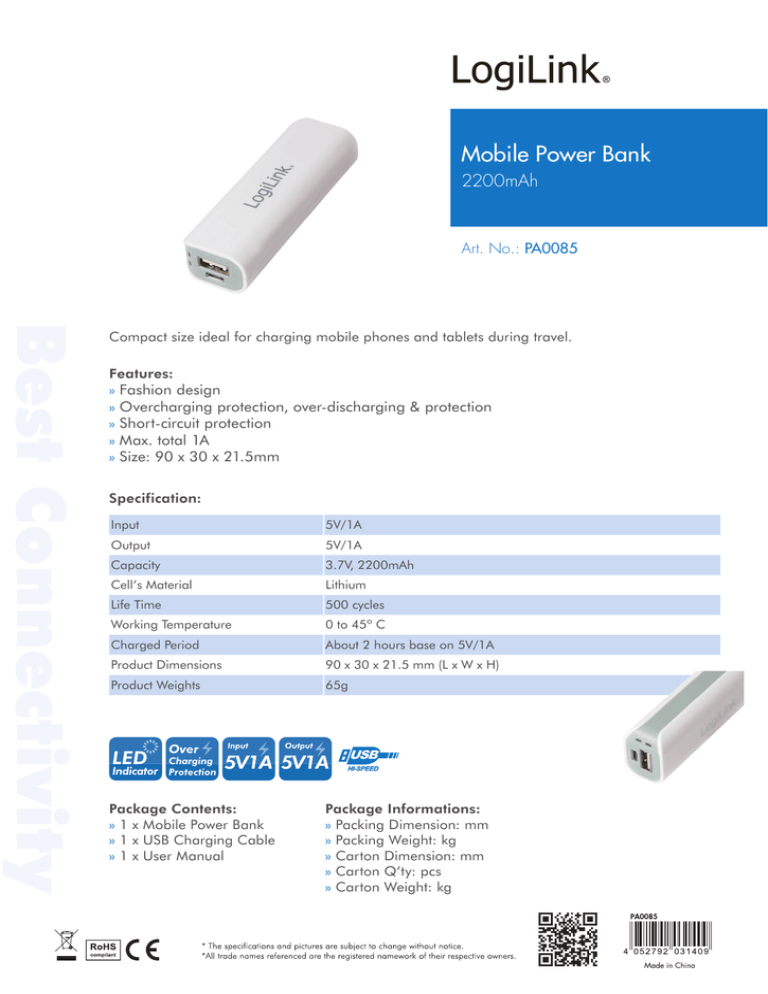 Mobile Power Bank 2200mAh Art. No.: PA0085 Best Connectivity Compact size ideal for charging mobile phones and tablets during travel. Features: » Fashion design » Overcharging protection, over-discharging & protection » Short-circuit protection » Max. total 1A » Size: 90 x 30 x 21.5mm Specification: Input 5V/1A Output 5V/1A Capacity 3.7V, 2200mAh Cell’s Material Lithium Life Time 500 cycles Working Temperature 0 to 45º C Charged Period About 2 hours base on 5V/1A Product Dimensions 90 x 30 x 21.5 mm (L x W x H) Product Weights 65g Package Contents: » 1 x Mobile Power Bank » 1 x USB Charging Cable » 1 x User Manual Package Informations: » Packing Dimension: mm » Packing Weight: kg » Carton Dimension: mm » Carton Q‘ty: pcs » Carton Weight: kg