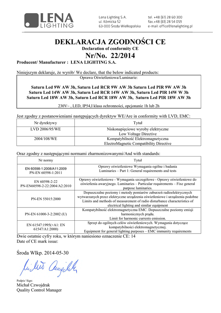 DEKLARACJA ZGODNOŚCI CE Declaration of conformity CE Nr/No. 22/2014 Producent/ Manufacturer : LENA LIGHTING S.A. Niniejszym deklaruje, że wyrób/ We declare, that the below indicated products: Oprawa Oświetleniowa/Luminarie: Saturn Led 9W AW 3h, Saturn Led RCR 9W AW 3h Saturn Led PIR 9W AW 3h Saturn Led 14W AW 3h, Saturn Led RCR 14W AW 3h, Saturn Led PIR 14W W 3h Saturn Led 18W AW 3h, Saturn Led RCR 18W AW 3h, Saturn Led PIR 18W AW 3h 230V~ , LED, IP54,I klasa ochronności, opcjonanie 1h lub 2h Jest zgodny z postanowieniami następujących dyrektyw WE/Are in conformity with LVD, EMC: Nr dyrektywy Tytuł LVD 2006/95/WE Niskonapięciowe wyroby elektryczne Low Voltage Directive Kompatybilność Elektromagnetyczna ElectroMagnetic Compatibility Directive 2004/108/WE Oraz zgodny z następującymi normami zharmonizowanymi/And with standards: Nr normy Tytuł EN 60598-1:2008/A11:2009 Oprawy oświetleniowe Wymagania ogólne i badania Luminaries – Part 1: General requirements and tests PN-EN 60598-1:2011 EN 60598-2-22 PN-EN60598-2-22:2004/A2:2010 PN-EN 55015:2000 PN-EN 61000-3-2:2002 (U) EN 61547:1995(+A1: EN 61547/A1:2000) Oprawy oświetleniowe - Wymagania szczegółowe - Oprawy oświetleniowe do oświetlenia awaryjnego. Luminaries – Particular requirements – Fixe general purpose luminaries. Dopuszczalne poziomy i metody pomiarów zaburzeń radioelektrycznych wytwarzanych przez elektryczne urządzenia oświetleniowe i urządzenia podobne Limits and methods of measurement of radio disturbance characteristics of electrical lighting and similar equipment Kompatybilność elektromagnetyczna EMC. Dopuszczalne poziomy emisji harmonicznych prądu. Limit for harmonic currents emission. Sprzęt do ogólnych celów oświetleniowych. Wymagania dotyczące kompatybilności elektromagnetycznej. Equipment for general lighting purposes – EMC immunity requirements Dwie ostatnie cyfry roku, w którym naniesiono oznaczenie CE: 14 Date of CE mark issue: Środa Wlkp. 2014-05-30 Podpis/ Sign: Michał Czwojdrak Quality Control Manager