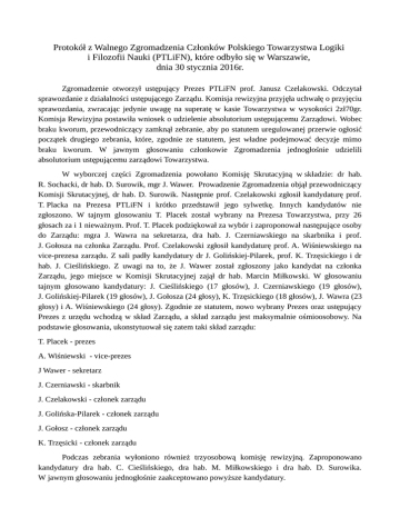 Protokół z Walnego Zgromadzenia Członków Polskiego Towarzystwa Logiki i Filozofii Nauki (PTLiFN), które odbyło się w Warszawie, dnia 30 stycznia 2016r. Zgromadzenie otworzył ustępujący Prezes PTLiFN prof. Janusz Czelakowski. Odczytał sprawozdanie z działalności ustępującego Zarządu. Komisja rewizyjna przyjęła uchwałę o przyjęciu sprawozdania, zwracając jedynie uwagę na superatę w kasie Towarzystwa w wysokości 2zł70gr. Komisja Rewizyjna postawiła wniosek o udzielenie absolutorium ustępującemu Zarządowi. Wobec braku kworum, przewodniczący zamknął zebranie, aby po statutem uregulowanej przerwie ogłosić początek drugiego zebrania, które, zgodnie ze statutem, jest władne podejmować decyzje mimo braku kworum. W jawnym głosowaniu członkowie Zgromadzenia jednogłośnie udzielili absolutorium ustępującemu zarządowi Towarzystwa. W wyborczej części Zgromadzenia powołano Komisję Skrutacyjną w składzie: dr hab. R. Sochacki, dr hab. D. Surowik, mgr J. Wawer. Prowadzenie Zgromadzenia objął przewodniczący Komisji Skrutacyjnej, dr hab. D. Surowik. Następnie prof. Czelakowski zgłosił kandydaturę prof. T. Placka na Prezesa PTLiFN i krótko przedstawił jego sylwetkę. Innych kandydatów nie zgłoszono. W tajnym glosowaniu T. Placek został wybrany na Prezesa Towarzystwa, przy 26 głosach za i 1 nieważnym. Prof. T. Placek podziękował za wybór i zaproponował następujące osoby do Zarządu: mgra J. Wawra na sekretarza, dra hab. J. Czerniawskiego na skarbnika i prof. J. Gołosza na członka Zarządu. Prof. Czelakowski zgłosił kandydaturę prof. A. Wiśniewskiego na vice-prezesa zarządu. Z sali padły kandydatury dr J. Golińskiej-Pilarek, prof. K. Trzęsickiego i dr hab. J. Cieślińskiego. Z uwagi na to, że J. Wawer został zgłoszony jako kandydat na członka Zarządu, jego miejsce w Komisji Skrutacyjnej zajął dr hab. Marcin Miłkowski. W głosowaniu tajnym głosowano kandydatury: J. Cieślińskiego (17 głosów), J. Czerniawskiego (19 głosów), J. Golińskiej-Pilarek (19 głosów), J. Gołosza (24 głosy), K. Trzęsickiego (18 głosów), J. Wawra (23 głosy) i A. Wiśniewskiego (24 głosy). Zgodnie ze statutem, nowo wybrany Prezes oraz ustępujący Prezes z urzędu wchodzą w skład Zarządu, a skład zarządu jest maksymalnie ośmioosobowy. Na podstawie głosowania, ukonstytuował się zatem taki skład zarządu: T. Placek - prezes A. Wiśniewski - vice-prezes J Wawer - sekretarz J. Czerniawski - skarbnik J. Czelakowski - członek zarządu J. Golińska-Pilarek - członek zarządu J. Gołosz - członek zarządu K. Trzęsicki - członek zarządu Podczas zebrania wyłoniono również trzyosobową komisję rewizyjną. Zaproponowano kandydatury dra hab. C. Cieślińskiego, dra hab. M. Miłkowskiego i dra hab. D. Surowika. W jawnym głosowaniu jednogłośnie zaakceptowano powyższe kandydatury. Głos zebrał nowo wybrany prezes PTLiFN, prof. T. Placek. Podziękował zgromadzonym za wybór oraz ustępującemu Zarządowi za pracę na rzecz Towarzystwa. Zapewnił, że Zarząd pod jego kierownictwem będzie kontynuował dobre tradycje Towarzystwa i działania dotychczasowego Zarządu. Zapowiedział następujące inicjatywy: (1) Przebudowanie witryny internetowej Towarzystwa tak, aby informowała o bieżących wydarzeniach naukowych (konferencjach, warsztatach i seminariach) w różnych ośrodkach w kraju. (2) Ustanowienie corocznej nagrody Towarzystwa w dziedzinach wspieranych przez Towarzystwo. za najlepszą monografię książkową (3) Starania o dofinansowanie krakowskiej Konferencji Historii Logiki lub innej cyklicznej imprezy o podobnym charakterze ze środków MNiSW lub NCN, tak aby mogła stać się forum spotkania całego środowiska polskich logików i filozofów nauki. (4) Rozbudowę internetowego Słownika Bibliograficznego Polskiej Logiki i Filozofii Nauki, który redagują J. Czelakowski i Z. Bonikowski. Ponadto prof. T. Placek przedstawił propozycję uchwały będącej odpowiedzią na prośbę MNiSW o opinię na temat punktacji czasopism zaproponowanej na liście MNiSW z dnia 23.12.2015. Uchwała ocenia proponowaną przez Ministerstwo listę w sposób jednoznacznie negatywny. W dyskusji J. Golińska-Pilarek zwróciła uwagę, że w pracach nad listą źle zastosowano proponowany przez samo Ministerstwo algorytm przypisujący punktację czasopismom; potrzebna jest wg niej również ocena jakości algorytmu oraz zaproponowanie innego sposobu punktacji (wątpliwości budzi między innymi sposób kategoryzowania czasopism logicznych, który w znaczący sposób wpływa na ich wartość punktową). Zasugerowała podjęcie prac nad bardziej precyzyjnym listem do MNiSW. Prof. J. Woleński zaproponował, by poddano głosowaniu uchwałę w obecnym kształcie, oraz jednoczesne rozpoczęto prace nad bardziej systematycznym i lepiej udokumentowanym stanowiskiem Towarzystwa. Dr hab. M. Miłkowski zaproponował dwie zmiany redakcyjne w tekście propozycji uchwały. W jawnym głosowaniu, Zgromadzenie przyjęło uchwałę (tekst w załączniku) przy jednym głosie wstrzymującym się. Prof. T. Placek zaproponował przyjęcie uchwały ustanawiającej doroczną nagrodę PTLiFN za monografię książkową. Rozpoczęła się dyskusja jakie dyscypliny należy uwzględnić. Prof. J. Czelakowski zaproponował zapis: “dyscypliny statutowo wspierane przez Towarzystwo” (statut stanowi “logika, filozofia nauki i zastosowania logiki w podstawach matematyki, informatyce i lingwistyce”). Szczegóły proponowanej nagrody (tryb zgłaszania kandydatur, powołanie kapituły nagrody, przedmiot nagrody) pozostawiono do decyzji zarządu. Prezes postawił wniosek o przyjęcie uchwały o ustanowieniu dorocznej nagrody PTLiFN za opublikowanie monografii naukowej poświęconej jednej z dyscyplin wspieranym statutowo przez Towarzystwo. Wniosek przeszedł jednogłośnie. Następny wniosek dotyczył zmiany wysokości składki członkowskiej. Obecna składka (20 zł roc