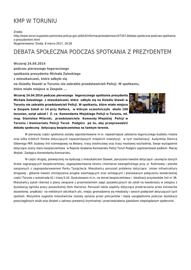 KMP W TORUNIU Źródło: http://www.torun.kujawsko-pomorska.policja.gov.pl/kb3/informacje/wiadomosci/47347,Debata-spoleczna-podczas-spotkaniaz-prezydentem.html Wygenerowano: Środa, 8 marca 2017, 19:26 DEBATA SPOŁECZNA PODCZAS SPOTKANIA Z PREZYDENTEM Wczoraj 24.04.2014 podczas pierwszego tegorocznego spotkania prezydenta Michała Zaleskiego z mieszkańcami, które odbyło się na Osiedlu Stawki w Toruniu nie zabrakło przedstawicieli Policji. W spotkaniu, które miało miejsce w Zespole ... Wczoraj 24.04.2014 podczas pierwszego tegorocznego spotkania prezydenta Michała Zaleskiego z mieszkańcami, które odbyło się na Osiedlu Stawki w Toruniu nie zabrakło przedstawicieli Policji. W spotkaniu, które miało miejsce w Zespole Szkół nr 14 przy Hallera, w którym uczestniczyło około 100 torunian, wziął udział I Z- ca Komendanta Miejskiego Policji w Toruniu, mł. insp. Stanisław Milarski, przedstawiciele Komendy Miejskiej Policji w Toruniu i Komisariatu Policji Toruń Podgórz po to, aby przeprowadzić debatę społeczną dotyczącą bezpieczeństwa na tamtym terenie. W pierwszej części spotkania zostały zaprezentowane m.in. najważniejsze założenia tegorocznego budżetu miasta oraz kilka krótkich filmów dotyczących najważniejszych miejskich inwestycji: w tym rewitalizacji budynków Dworca Głównego PKP, budowy linii tramwajowej na Bielany, trasy średnicowej oraz trasy mostowej wschodniej. Swoje wystąpienie dotyczące oceny stanu bezpieczeństwa w Rejonie działania Komisariatu Policji Toruń Podgórz zaprezentował podkom. Maciej Wojtak- Zastępca Komendanta Komisariatu. W części drugiej, poświęconej na dyskusję z mieszkańcami Stawek, poruszono kwestie dotyczące: usunięcia starych drzew zagrażających bezpieczeństwu, zagospodarowania terenu cmentarza ewangelickiego przy ul. Rubinowej i planów związanych z zagospodarowaniem Parku Tysiąclecia. Mieszkańcy poruszali problemy dotyczące zmian infrastruktury drogowej : głównie kwestii zmniejszenia progów zwalniających oraz istniejącym i planowanym połączeniu lewobrzeżnej części Torunia z autostradą A1 i trasą S-10. Dyskutowano m.in. na temat bezpieczeństwa i lokalizacji przystanków linii nr 36. Mieszkańcy pytali również o plany związane z przeniesieniem zajęć pozalekcyjnych do szkół na lewobrzeżu w związku z dyslokacją ogniska pracy pozaszkolnej Dom Harcerza. Poruszali także aspekty dotyczące przekraczania przez kierowców dozwolonej prędkości na niektórych odcinkach ulic, miejsc gromadzenia się młodzieży i swoich podejrzeń dotyczących tych spotkań. Wszystkie sugestie mieszkańców zostały spisane przez policjantów i będą uwzględnione podczas dyslokacji poszczególnych służb oraz działań z zakresu prewencji kryminalnej i przeciwdziałania zjawiskom niepożądanym społecznie. podinsp. Wioletta Dąbrowska Autor: rzeczniktor Publikacja: rzeczniktor Ocena: 0/5 (0) Tweetnij