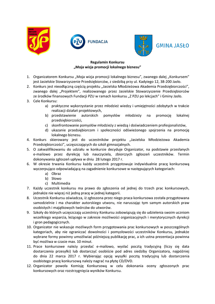 Regulamin Konkursu „Moja wizja promocji lokalnego biznesu” 1. Organizatorem Konkursu „Moja wizja promocji lokalnego biznesu”, zwanego dalej „Konkursem” jest Jasielskie Stowarzyszenie Przedsiębiorców, z siedzibą przy ul. Kadyiego 12, 38-200 Jasło. 2. Konkurs jest nieodłączną częścią projektu „Jasielska Młodzieżowa Akademia Przedsiębiorczości”, zwanego dalej „Projektem”, realizowanego przez Jasielskie Stowarzyszenie Przedsiębiorców ze środków finansowych Fundacji PZU w ramach konkursu „Z PZU po lekcjach” i Gminy Jasło. 3. Cele Konkursu: a) praktyczne wykorzystanie przez młodzież wiedzy i umiejętności zdobytych w trakcie realizacji działao projektowych, b) przedstawienie autorskich pomysłów młodzieży na promocję lokalnej przedsiębiorczości, c) skonfrontowanie pomysłów młodzieży z wiedzą i doświadczeniem profesjonalistów, d) ukazanie przedsiębiorcom i społeczności odświeżonego spojrzenia na promocję lokalnego biznesu. 4. Konkurs skierowany jest do uczestników projektu „Jasielska Młodzieżowa Akademia Przedsiębiorczości”, uczęszczających do szkół gimnazjalnych. 5. O zakwalifikowaniu do udziału w konkursie decyduje Organizator, na podstawie przesłanych e-mailowo przez dyrekcję lub nauczyciela, zbiorczych zgłoszeo uczestników. Termin dokonywania zgłoszeo upływa w dniu 28 lutego 2017 r. 6. W okresie trwania Konkursu każdy uczestnik przygotowuje indywidualnie pracę konkursową wyczerpująco odpowiadającą na zagadnienie konkursowe w następujących kategoriach: a) Obraz b) Słowo c) Multimedia 7. Każdy uczestnik konkursu ma prawo do zgłoszenia od jednej do trzech prac konkursowych, jednakże nie więcej niż jedną pracę w jednej kategorii. 8. Uczestnik Konkursu oświadcza, iż zgłoszona przez niego praca konkursowa została przygotowana samodzielnie i ma charakter autorskiego utworu, nie naruszając tym samym autorskich praw osobistych i majątkowych twórców do utworów. 9. Szkoły do których uczęszczają uczestnicy Konkursu zobowiązują się do udzielenia swoim uczniom wszelkiego wsparcia, leżącego w zakresie możliwości organizacyjnych i merytorycznych dyrekcji i gron pedagogicznych. 10. Organizator nie wskazuje możliwych form przygotowania prac konkursowych w poszczególnych kategoriach, aby nie ograniczad dowolności i pomysłowości uczestników Konkursu, jednakże wybrane formy powinny umożliwiad późniejszą publikację prac, a ich ustna prezentacja powinna byd możliwa w czasie max. 10 minut. 11. Prace konkursowe należy przesład e-mailowo, wysład pocztą tradycyjną (liczy się data dostarczenia przesyłki) lub dostarczyd osobiście pod adres siedziby Organizatora, najpóźniej do dnia 22 marca 2017 r. Wybierając opcję wysyłki pocztą tradycyjną lub dostarczenia osobistego pracę konkursową należy nagrad na płytę CD/DVD. 12. Organizator powoła Komisję Konkursową w celu dokonania oceny zgłoszonych prac konkursowych oraz rozstrzygnięcia wyników Konkursu. 13. W skład Komisji Konkursowej wejdą przedstawiciele jasielskich przedsiębiorstw, współpracujący z Jasielskim Stowarzyszeniem Przedsiębiorców. 14. Decyzje podjęte przez Komisję Konkursową są ostateczne i nie przysługuje od nich odwołanie. 15. Organizator Konkursu przewidział wyróżnienie trzech autorów prac konkursowych w każdej kategorii oraz ufundowanie nagród. 16. Ogłoszenie wyników Konkursu odbędzie się w czerwcu 2017 r. w trakcie Gali podsumowującej. 17. Wybrane prace konkursowe zostaną opublikowane przez Organizatora w formie broszury pokonkursowej. 18. Kanałem kontaktu w czasie trwania Konkursu jest adres mailowy: [email protected] 19. Organizator zastrzega sobie prawo do zmiany Regulaminu w każdym czasie, jednocześnie informując o tym uczestników Konkursu.