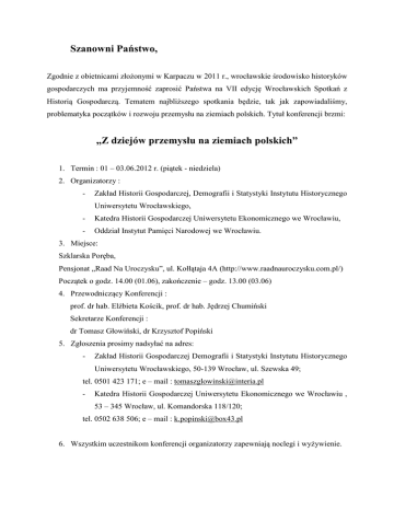 Szanowni Państwo, Zgodnie z obietnicami złożonymi w Karpaczu w 2011 r., wrocławskie środowisko historyków gospodarczych ma przyjemność zaprosić Państwa na VII edycję Wrocławskich Spotkań z Historią Gospodarczą. Tematem najbliższego spotkania będzie, tak jak zapowiadaliśmy, problematyka początków i rozwoju przemysłu na ziemiach polskich. Tytuł konferencji brzmi: „Z dziejów przemysłu na ziemiach polskich” 1. Termin : 01 – 03.06.2012 r. (piątek - niedziela) 2. Organizatorzy : - Zakład Historii Gospodarczej, Demografii i Statystyki Instytutu Historycznego Uniwersytetu Wrocławskiego, - Katedra Historii Gospodarczej Uniwersytetu Ekonomicznego we Wrocławiu, - Oddział Instytut Pamięci Narodowej we Wrocławiu. 3. Miejsce: Szklarska Poręba, Pensjonat „Raad Na Uroczysku”, ul. Kołłątaja 4A (http://www.raadnauroczysku.com.pl/) Początek o godz. 14.00 (01.06), zakończenie – godz. 13.00 (03.06) 4. Przewodniczący Konferencji : prof. dr hab. Elżbieta Kościk, prof. dr hab. Jędrzej Chumiński Sekretarze Konferencji : dr Tomasz Głowiński, dr Krzysztof Popiński 5. Zgłoszenia prosimy nadsyłać na adres: - Zakład Historii Gospodarczej Demografii i Statystyki Instytutu Historycznego Uniwersytetu Wrocławskiego, 50-139 Wrocław, ul. Szewska 49; tel. 0501 423 171; e – mail : [email protected] - Katedra Historii Gospodarczej Uniwersytetu Ekonomicznego we Wrocławiu , 53 – 345 Wrocław, ul. Komandorska 118/120; tel. 0502 638 506; e – mail : [email protected] 6. Wszystkim uczestnikom konferencji organizatorzy zapewniają noclegi i wyżywienie. 7. Termin zgłoszenia udziału w konferencji wraz z podaniem tytułu referatu upływa 20.02.2012 r. 8. Udział w spotkaniu związany jest z koniecznością wniesienia opłaty konferencyjnej w wysokości 150 zł od osoby (faktury będą wystawiane na miejscu podczas trwania konferencji) 9. Organizatorzy zapewniają publikację książki będącej efektem konferencji, która ukaże się drukiem do końca 2012 r., dlatego w miarę możliwości prosimy o przybycie na konferencję z tekstem gotowym do druku. Warunki, jakim powinna odpowiadać forma i objętość tekstów, zamieszczone są na stronie Wrocławskich Spotkań z Historią Gospodarczą. 10. Organizatorzy zastrzegają sobie prawo wyboru do druku zgłoszonych referatów.