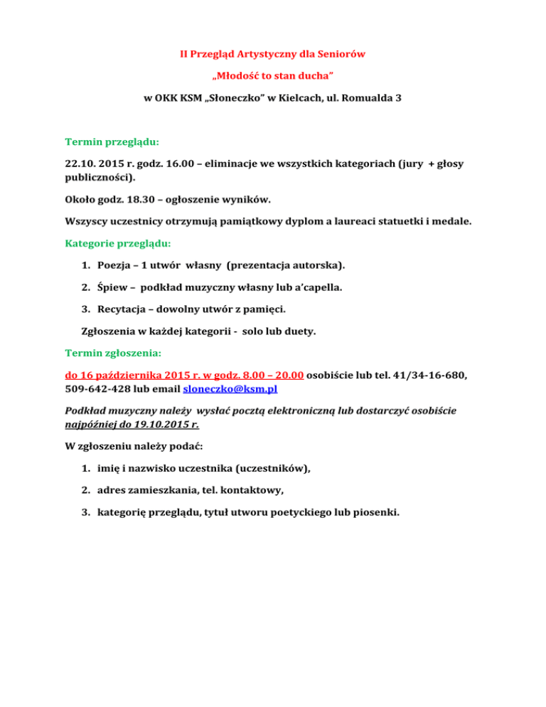 II Przegląd Artystyczny dla Seniorów „Młodość to stan ducha” w OKK KSM „Słoneczko” w Kielcach, ul. Romualda 3 Termin przeglądu: 22.10. 2015 r. godz. 16.00 – eliminacje we wszystkich kategoriach (jury + głosy publiczności). Około godz. 18.30 – ogłoszenie wyników. Wszyscy uczestnicy otrzymują pamiątkowy dyplom a laureaci statuetki i medale. Kategorie przeglądu: 1. Poezja – 1 utwór własny (prezentacja autorska). 2. Śpiew – podkład muzyczny własny lub a’capella. 3. Recytacja – dowolny utwór z pamięci. Zgłoszenia w każdej kategorii - solo lub duety. Termin zgłoszenia: do 16 października 2015 r. w godz. 8.00 – 20.00 osobiście lub tel. 41/34-16-680, 509-642-428 lub email [email protected] Podkład muzyczny należy wysłać pocztą elektroniczną lub dostarczyć osobiście najpóźniej do 19.10.2015 r. W zgłoszeniu należy podać: 1. imię i nazwisko uczestnika (uczestników), 2. adres zamieszkania, tel. kontaktowy, 3. kategorię przeglądu, tytuł utworu poetyckiego lub piosenki.